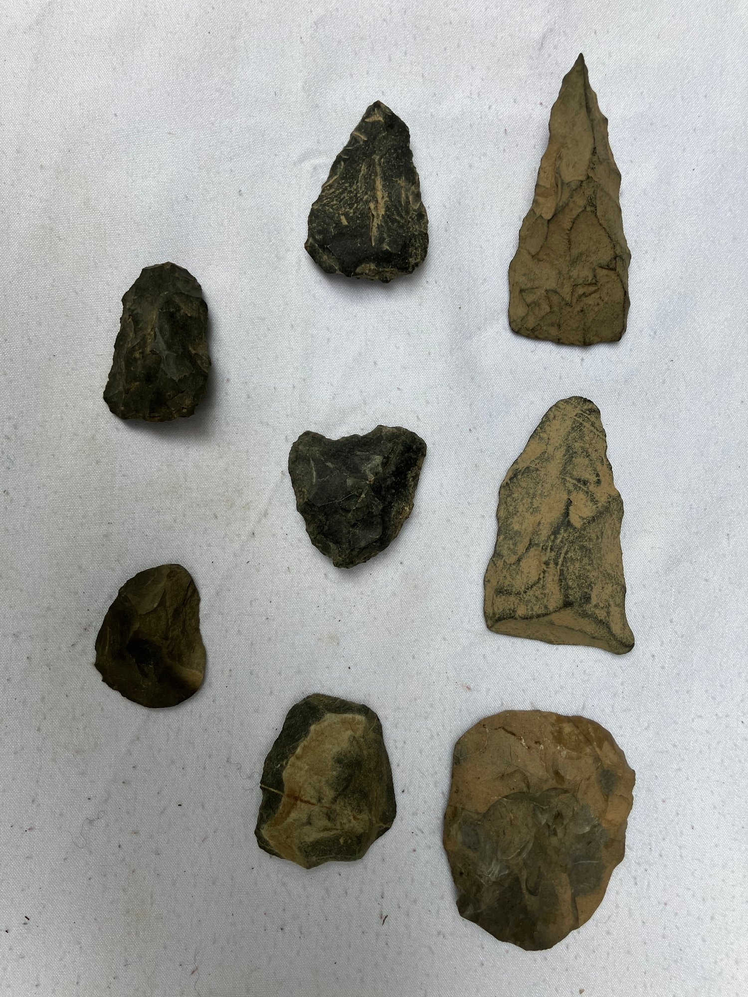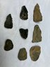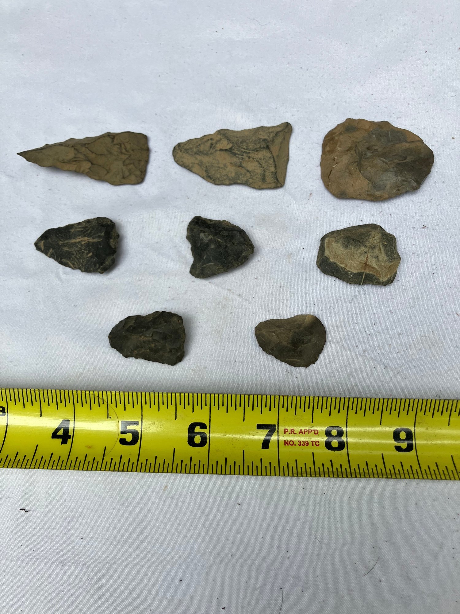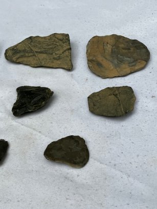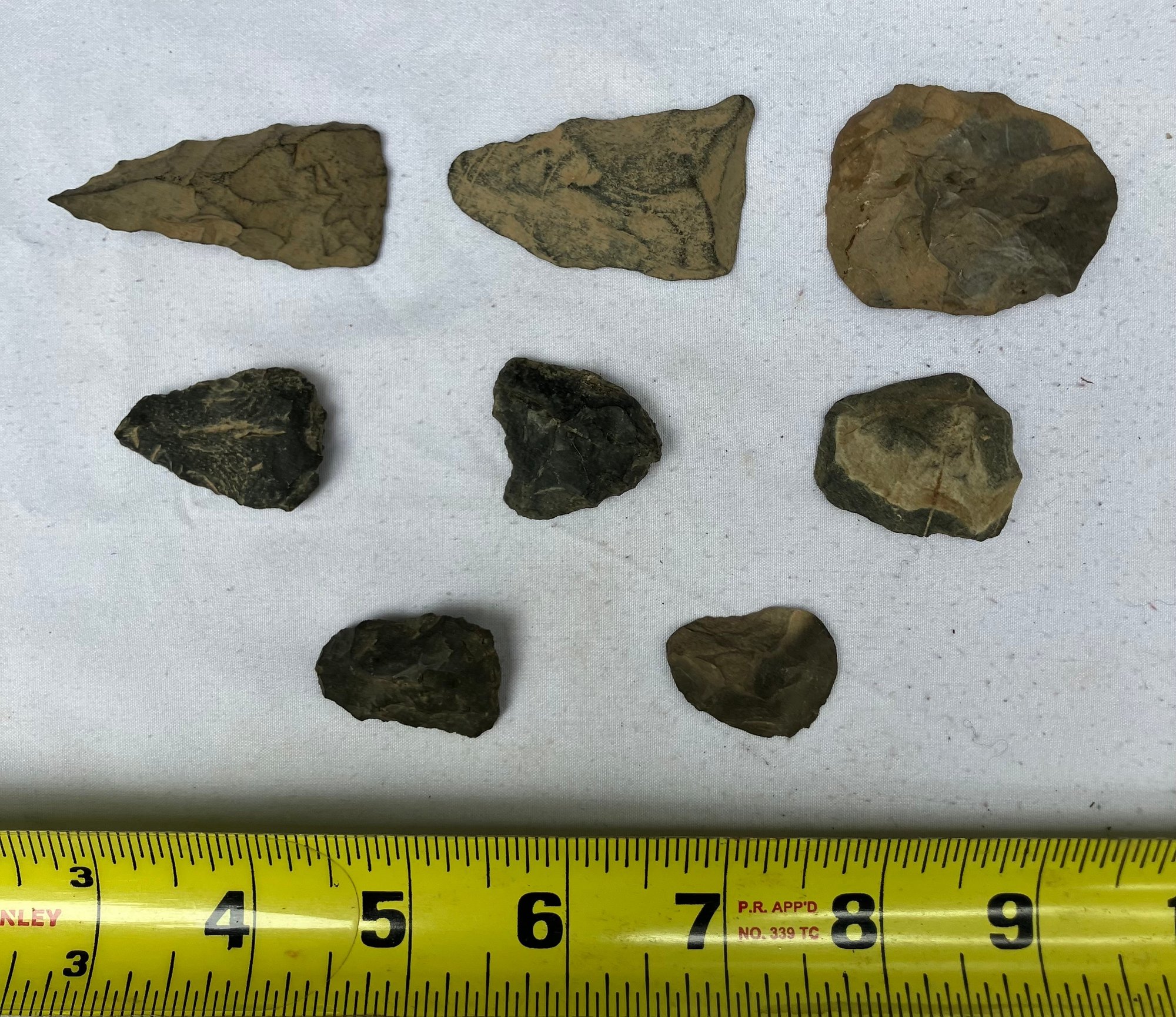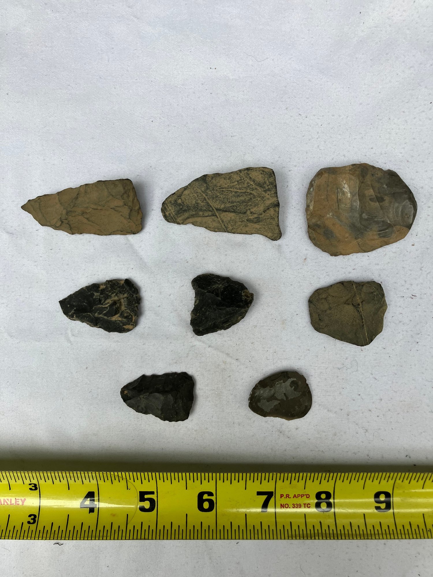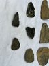 Found at a Native American dig site. Assorted tools consisting of scrapers and bi-facial blades. One large blade has human made scratch marks on both sides. Some are made of flint and Chirt.