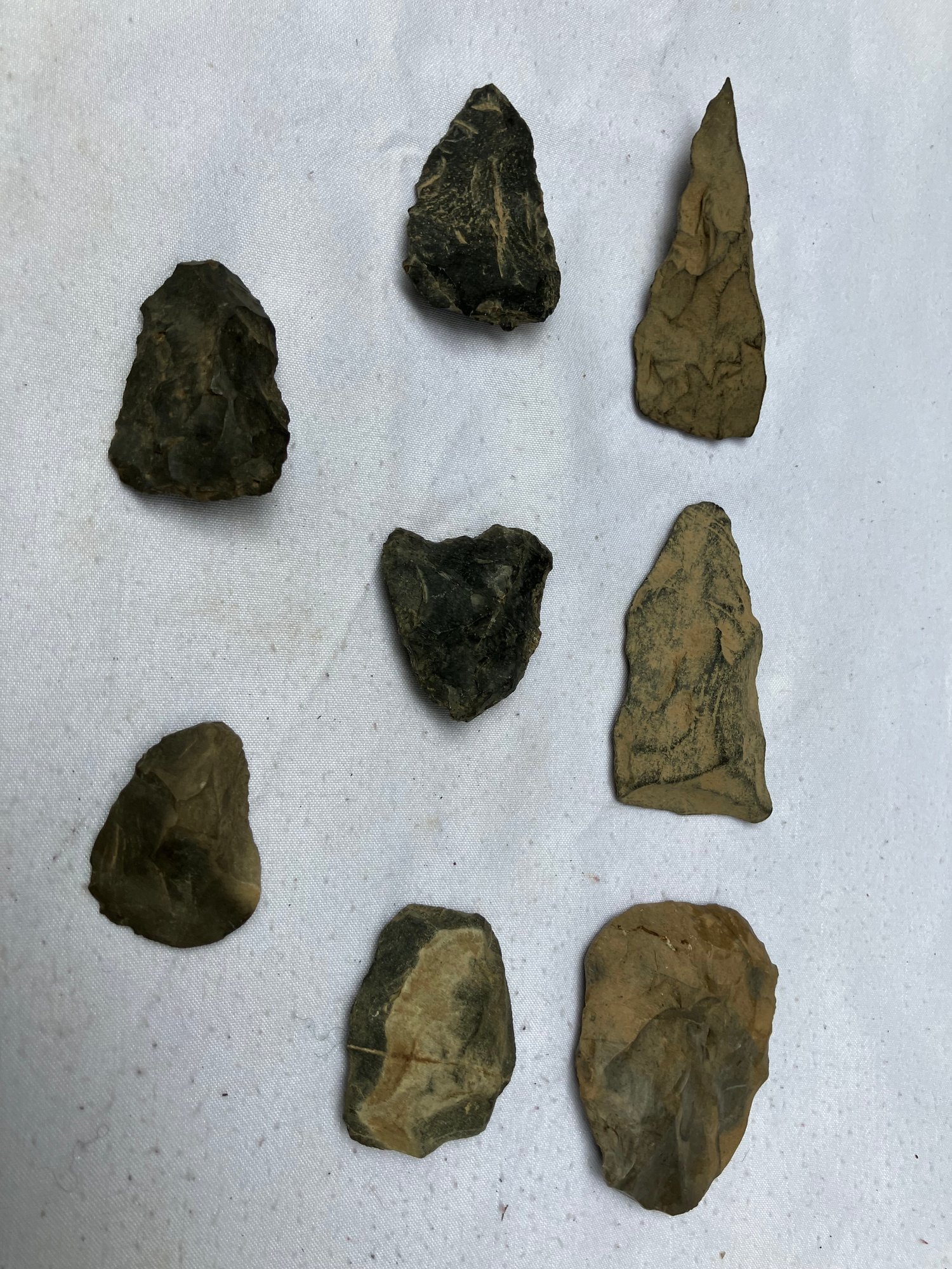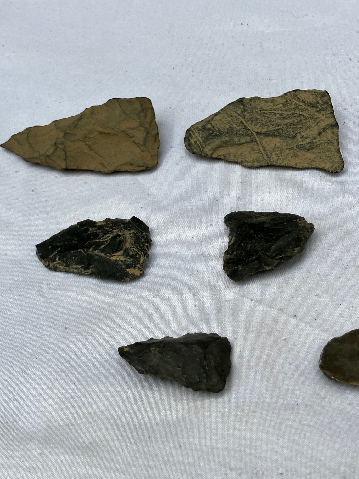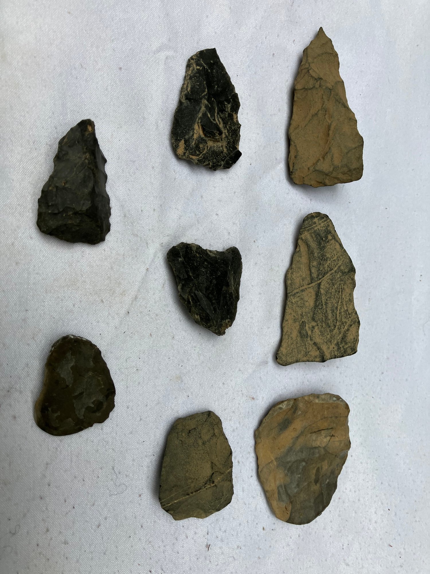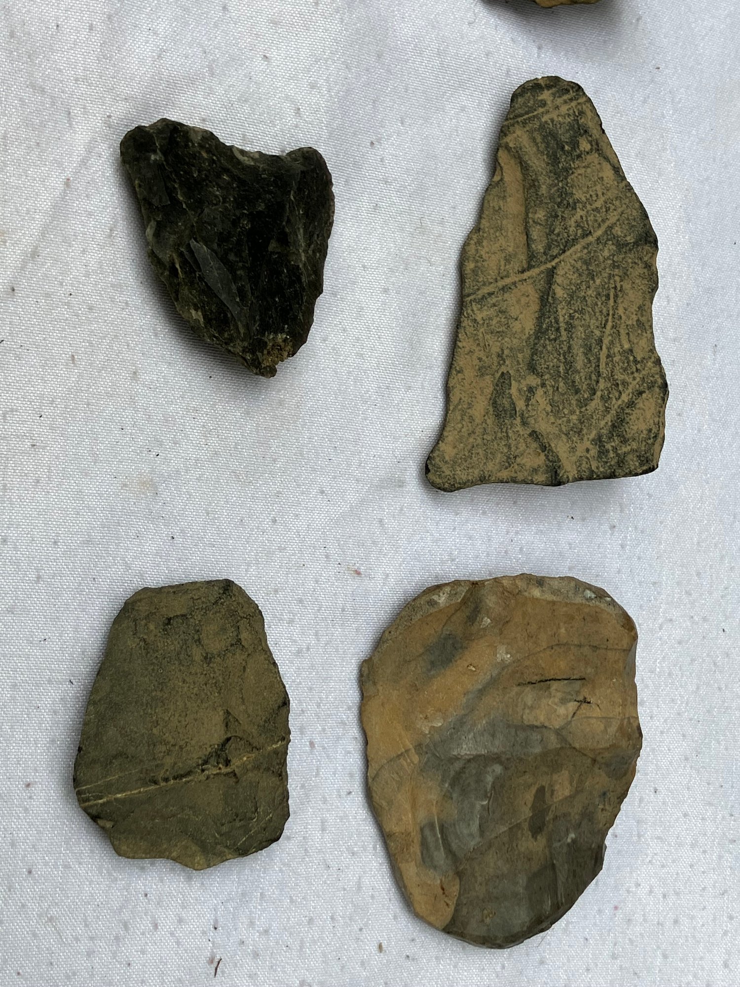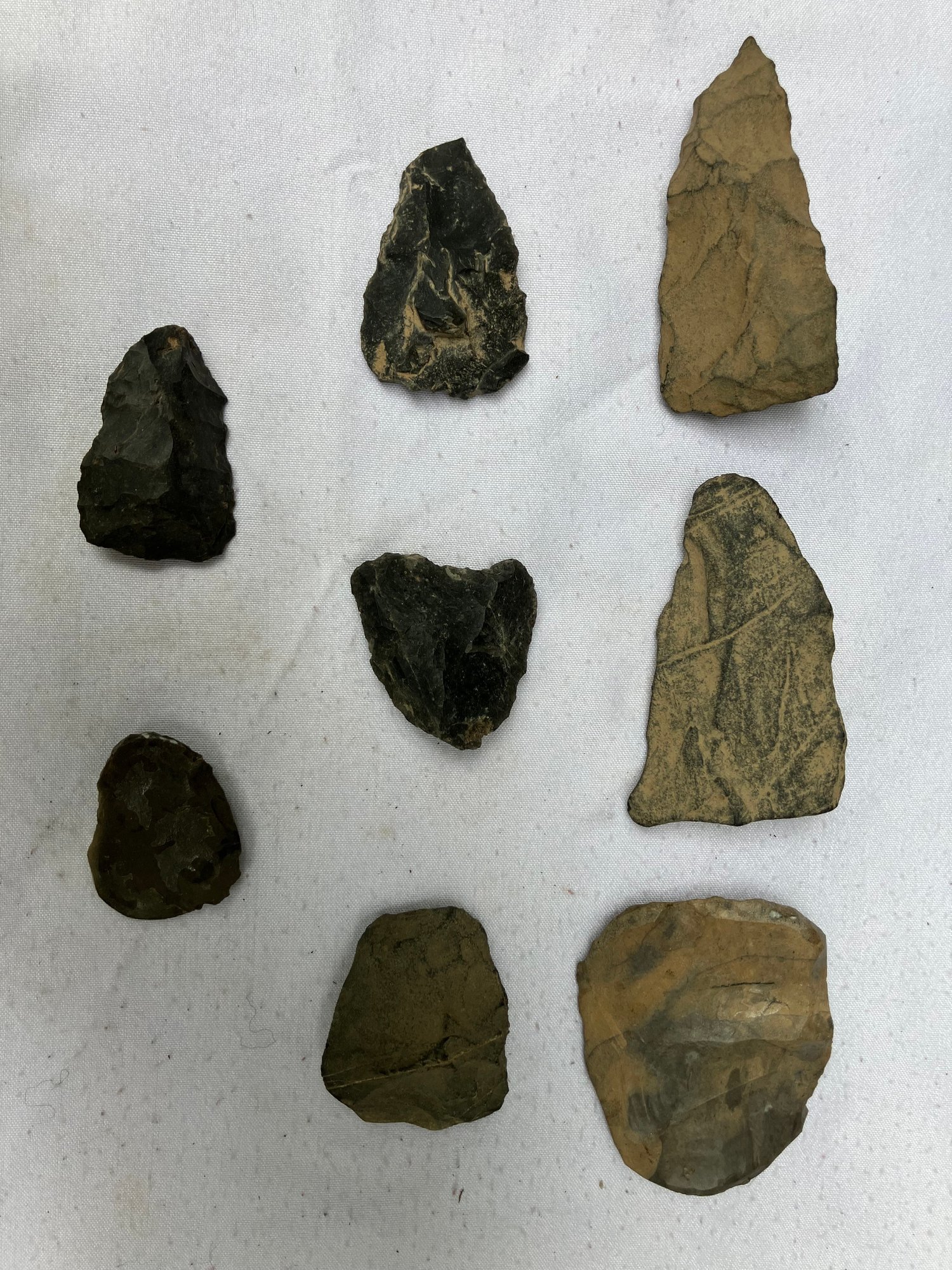 Found at a Native American dig site. Assorted tools consisting of scrapers and bi-facial blades. One large blade has human made scratch marks on both sides. Some are made of flint and Chirt.