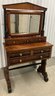 Antique Empire Restaurationn Mahogany Dressing Table/Vanity With Mirror. C. 1830. It has a trestle style base. It has flame mahogany veneers over pine underlayment. Restauration style mirror with ebonized moldings. Re-drilled hardware. The dimensions are: 66” tall x 36” wide x 17” deep.