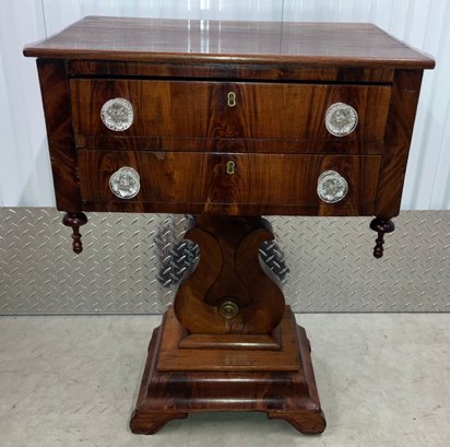 Antique Empire two drawer stand. Flame mahogany veneers. Glass pulls. Dimensions are: 30” tall x 22” wide x 15 1/2” deep. Good condition.