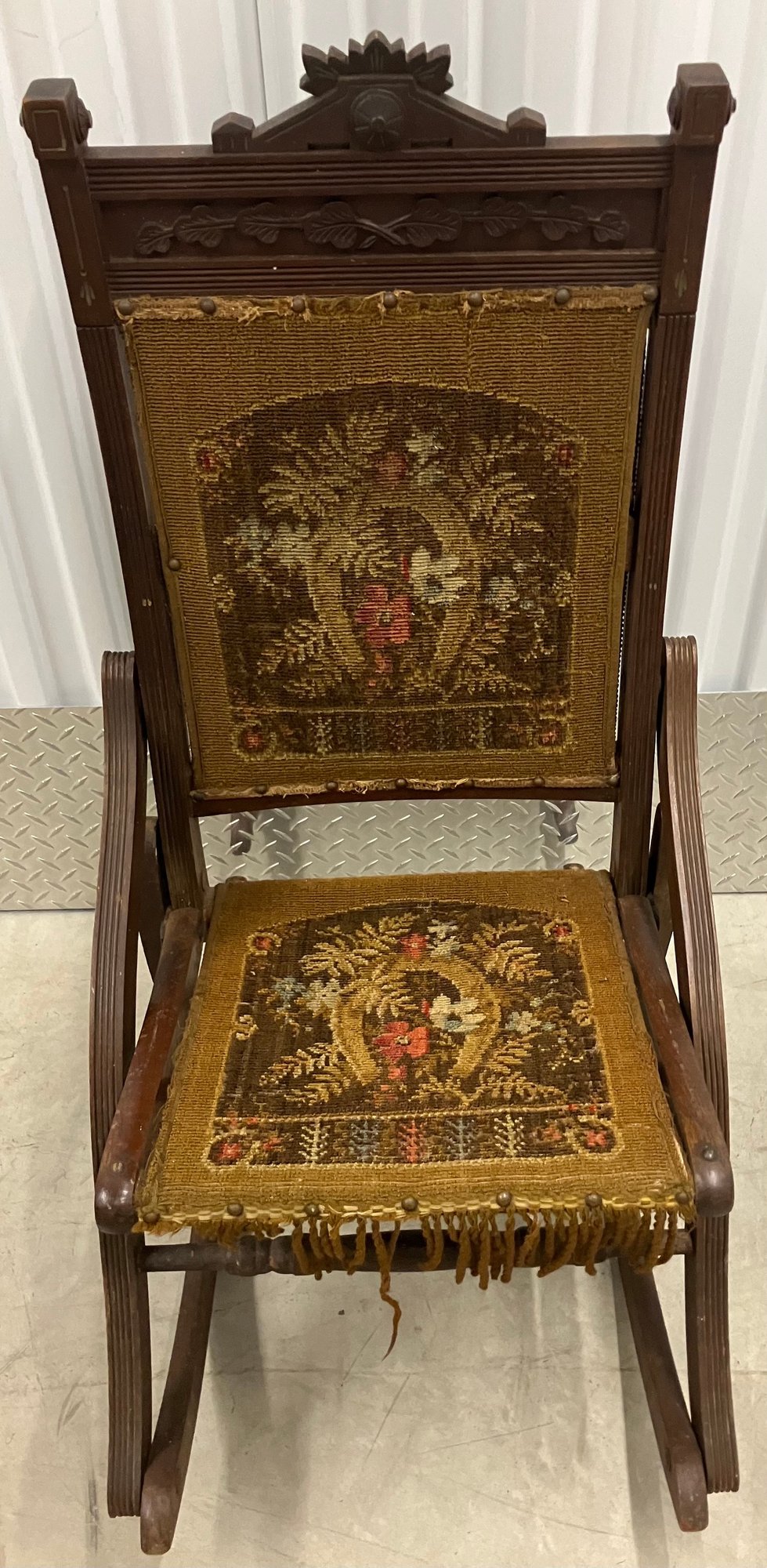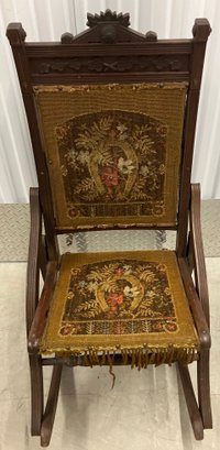 Antique rocker with embroidery. The rocker folds up. Dimensions are: 38 1/2” tall x 18 1/4” wide x 28 1/4” deep.