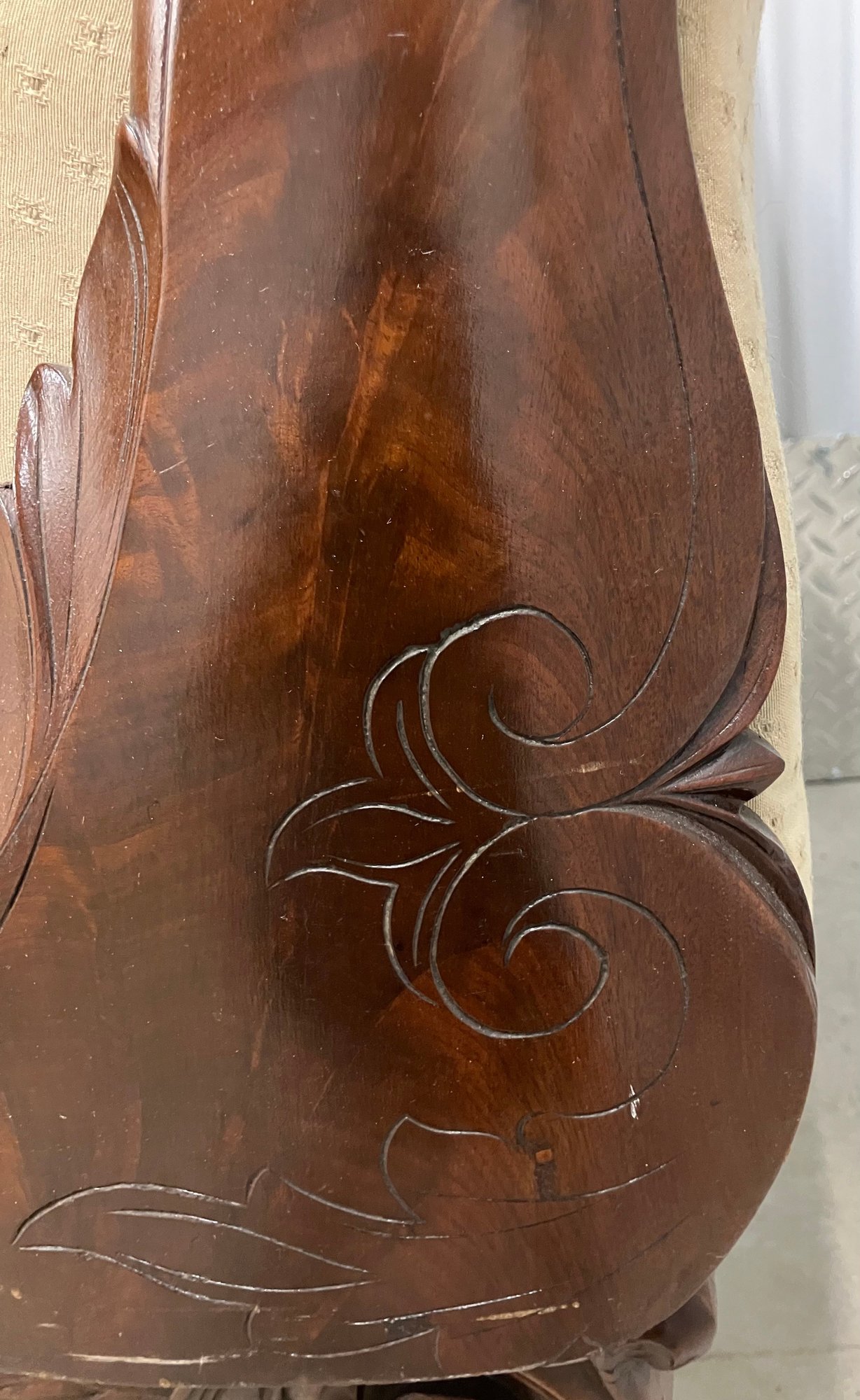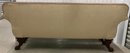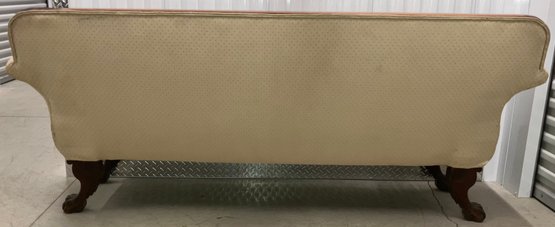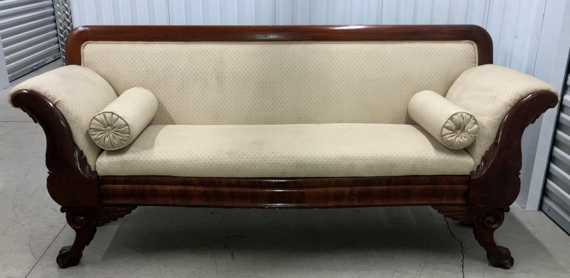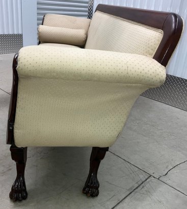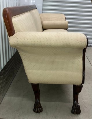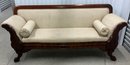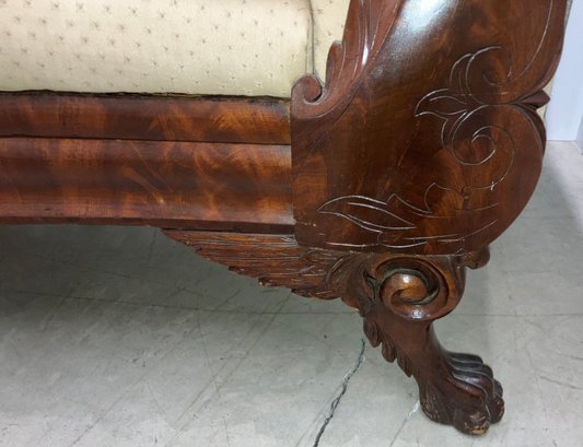 The Empire sofa is made from mahogany wood. It is a transitional piece between Classical and Neo Classical. It has hairy paw feet. Circa 1840 to 1850. Very solid and sturdy. The dimensions are: 35” tall x 82” wide x 24” deep.