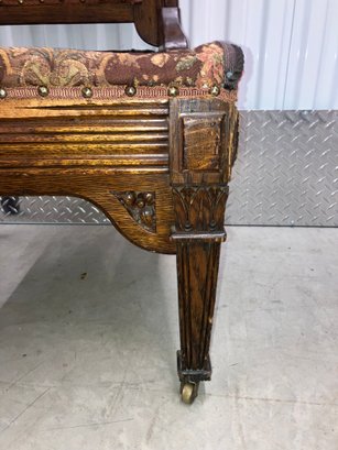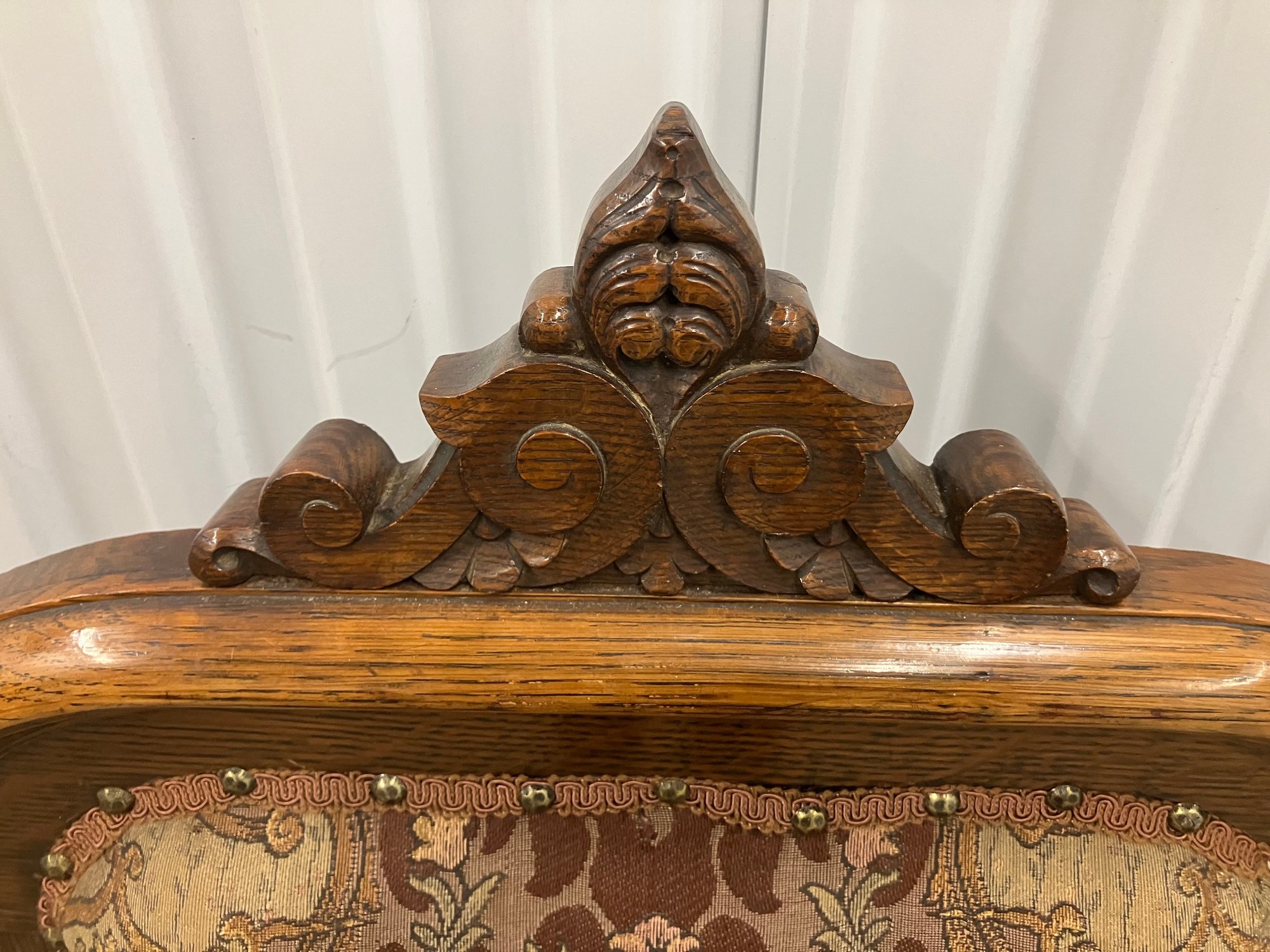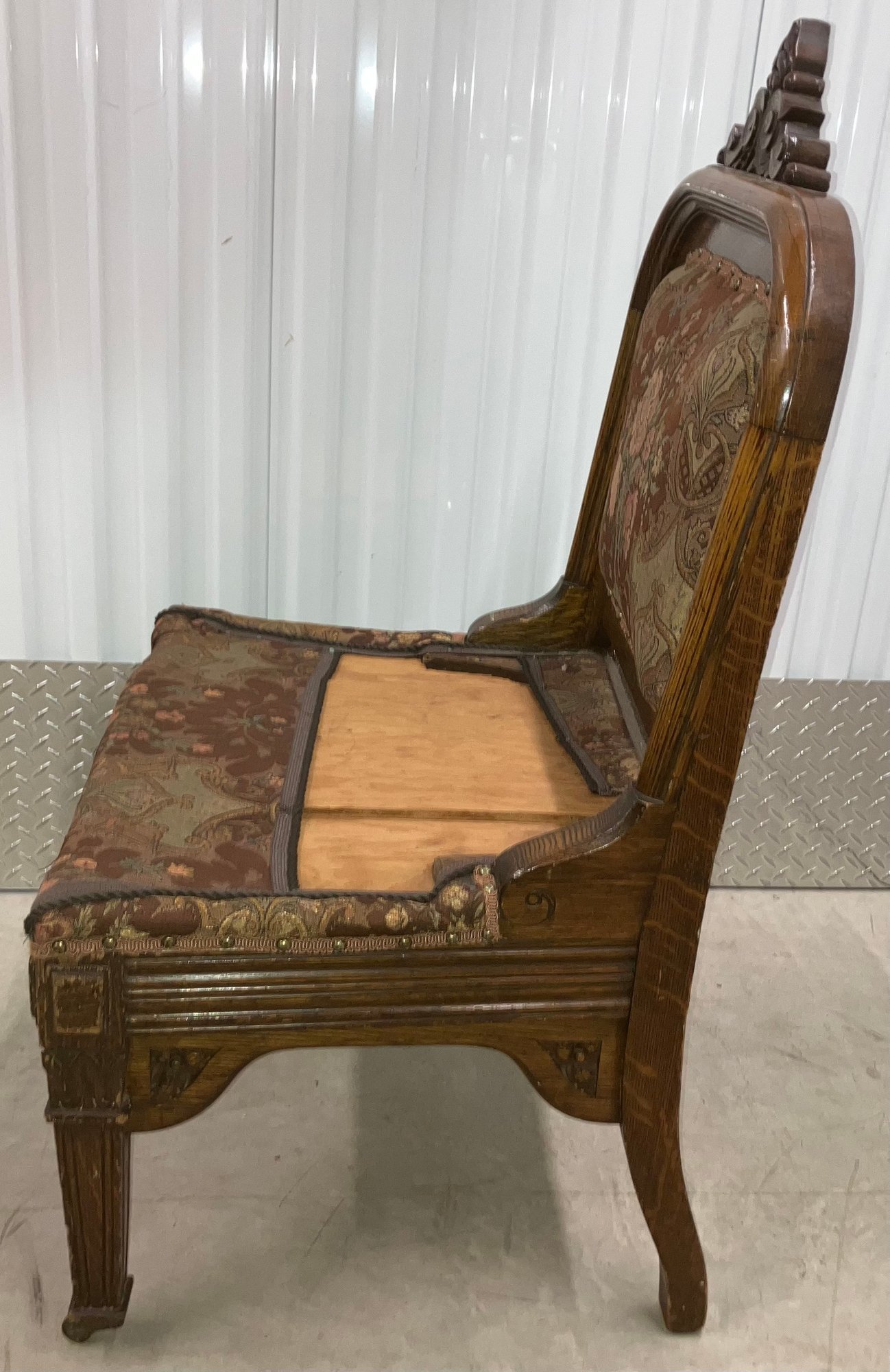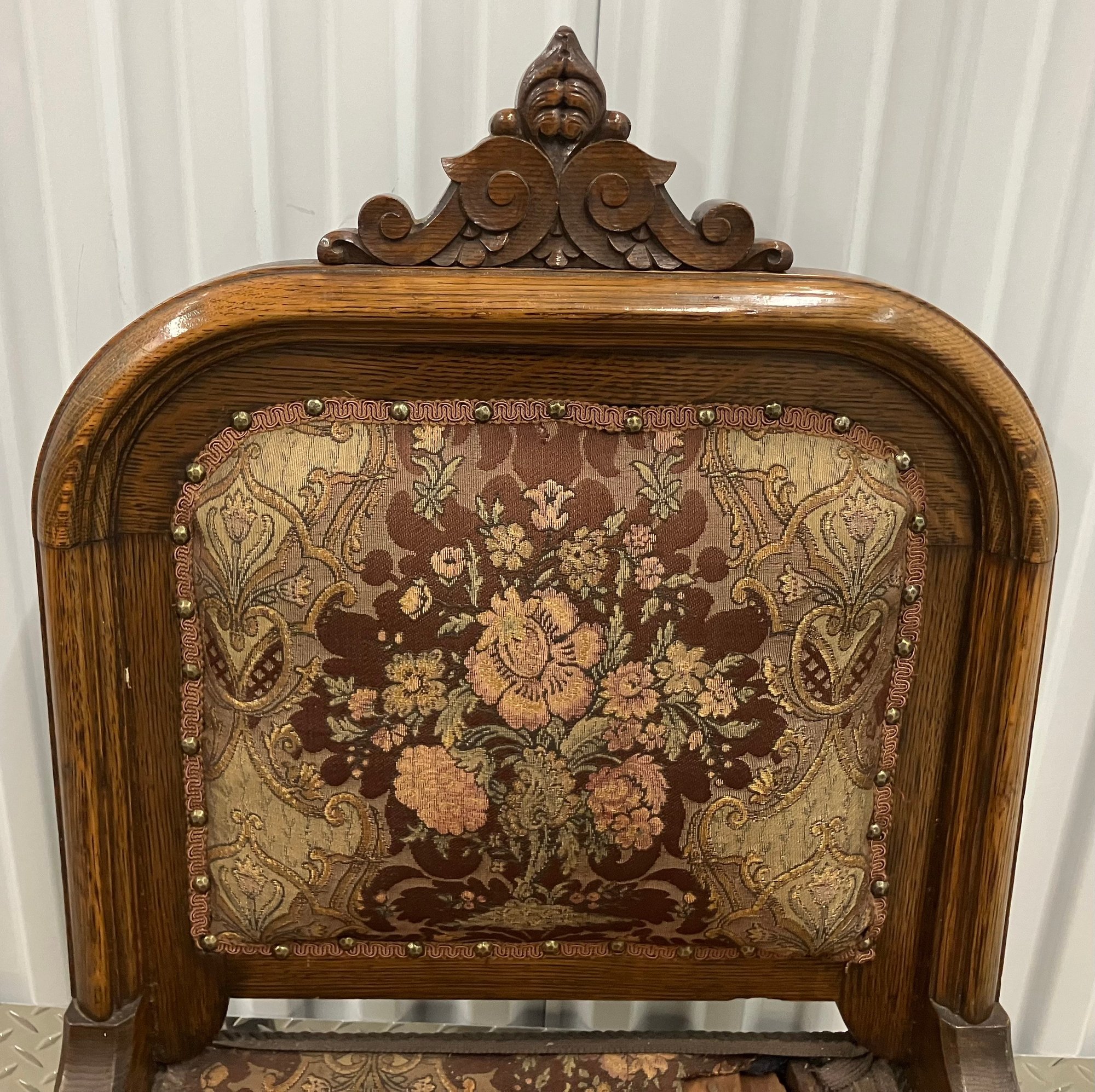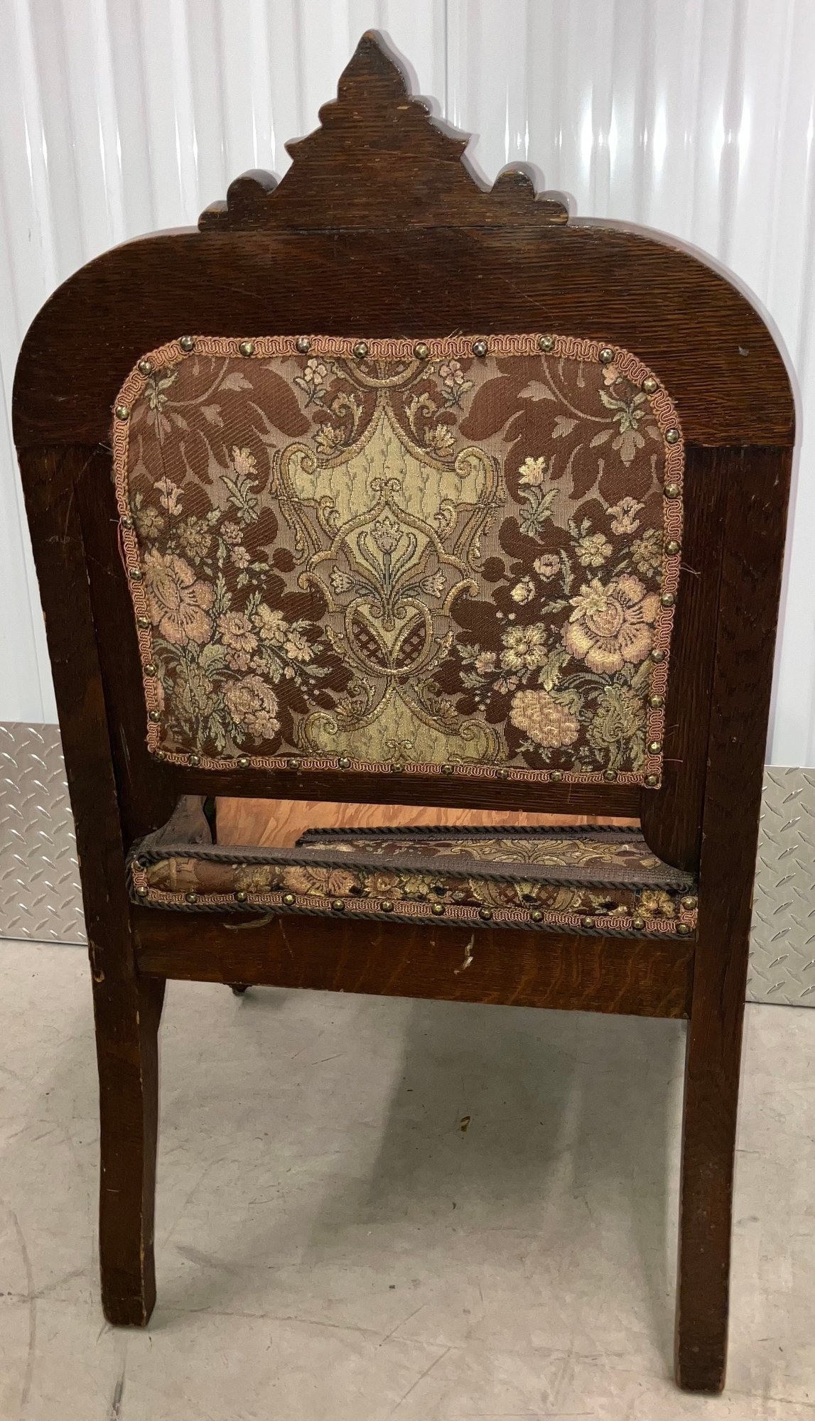 Antique solid oak chair. Dimensions are: 40 1/2” tall x 24 1/2” wide x 19 1/4” deep.