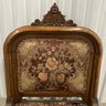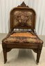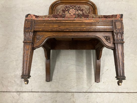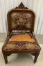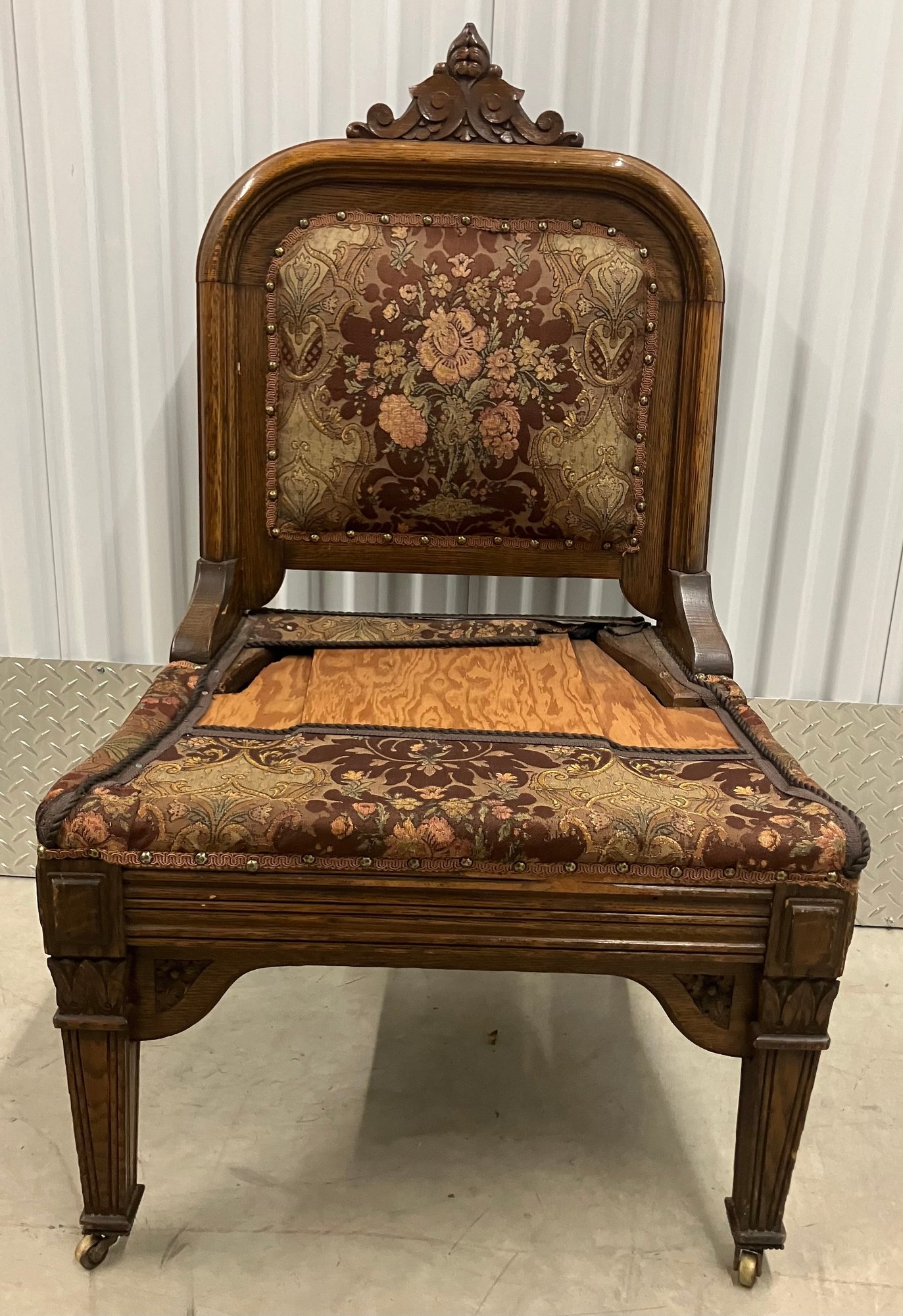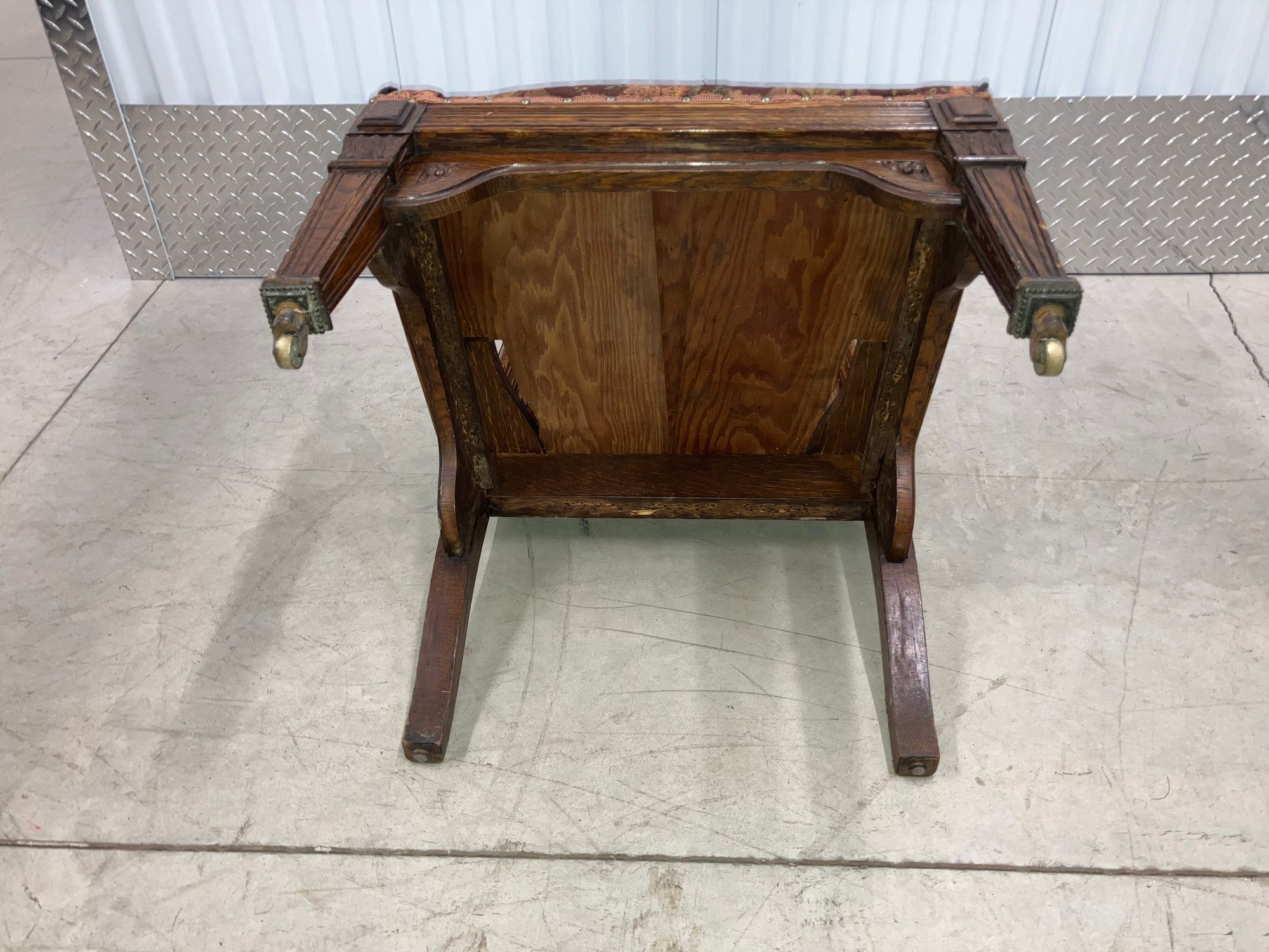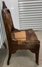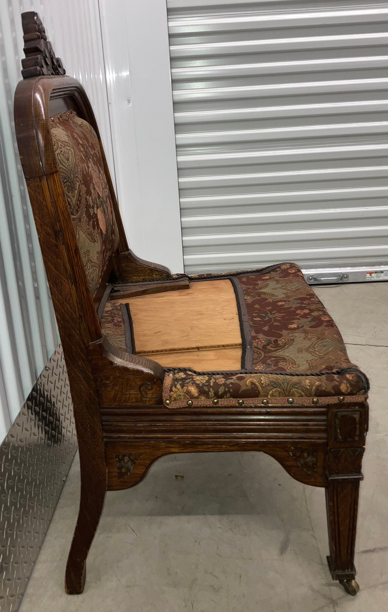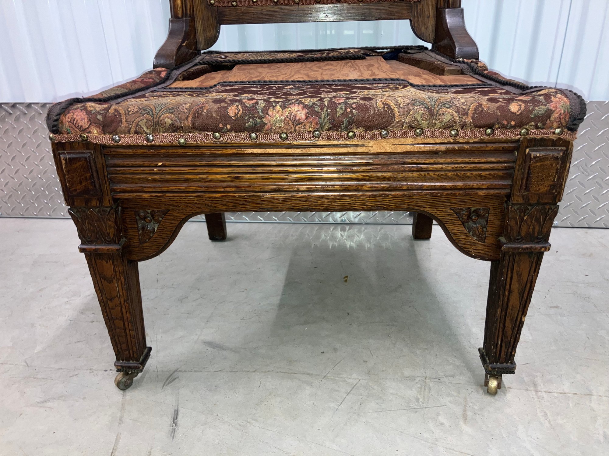 Antique solid oak chair. Dimensions are: 40 1/2” tall x 24 1/2” wide x 19 1/4” deep.