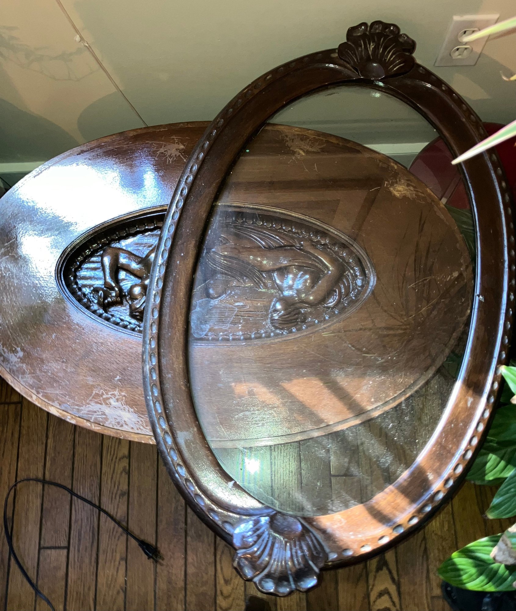 Antique table with removable glass tray. Dimensions: 20” tall x 30 1/2” wide x 18 1/2” deep. Good condition.