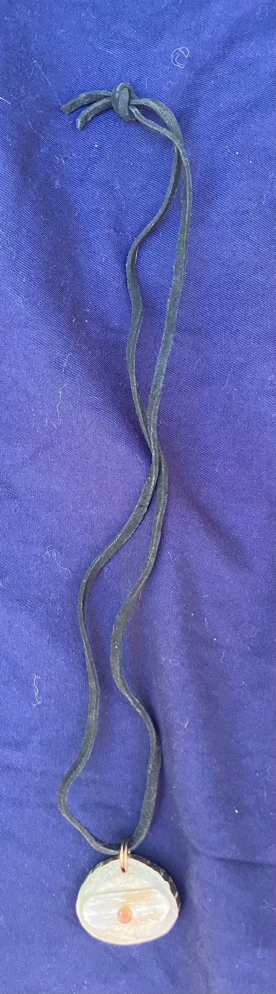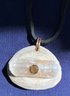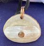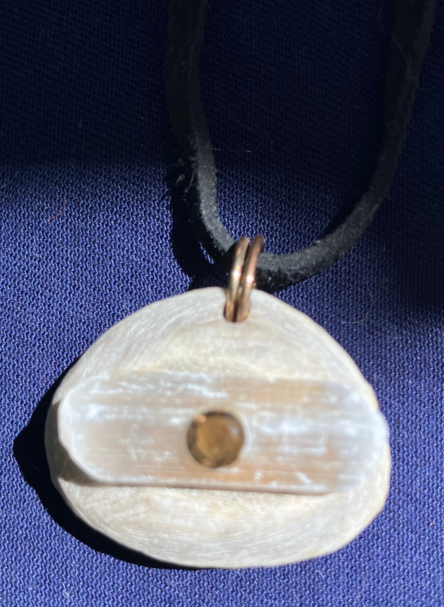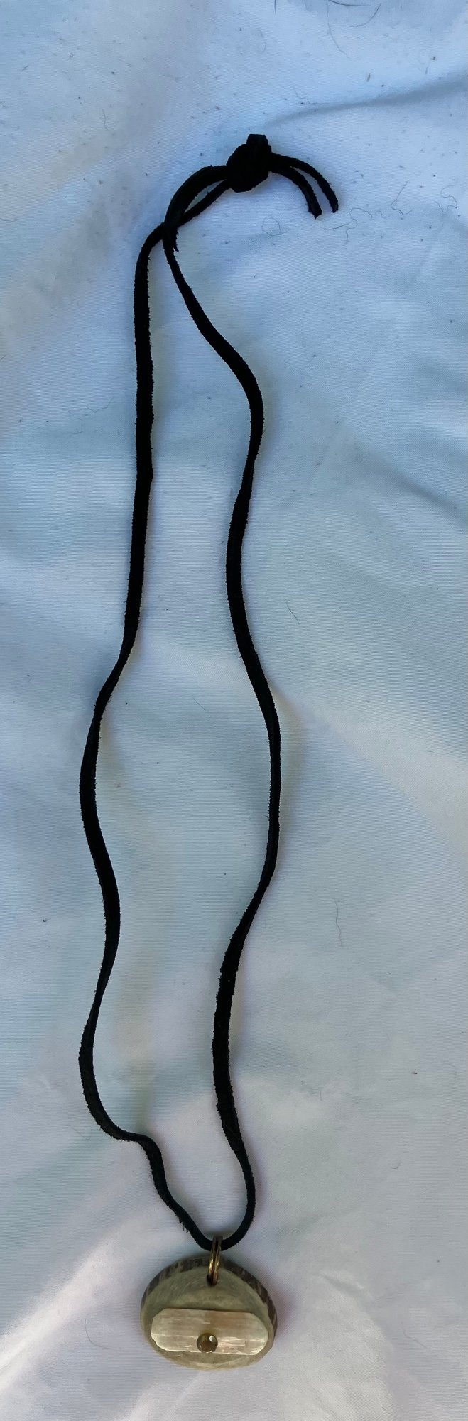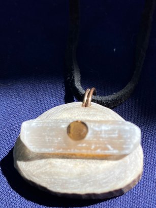 Antler Selenite & Smoky Quartz Cut Gemstones Necklace. It has a leather cord and round cut smoky Quartz. Measures: 12 inches long. The pendant is: 1 1/2” wide x 1 1/4” long.