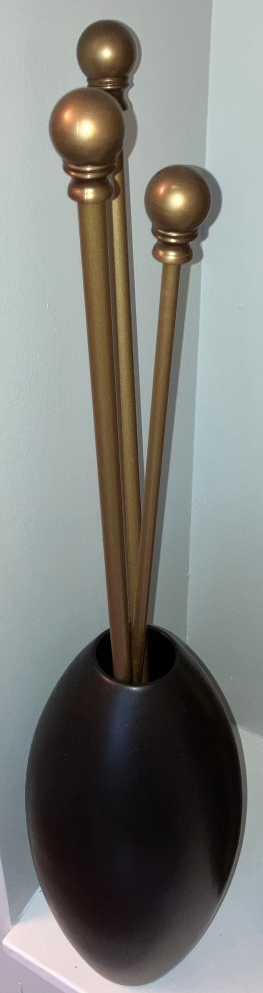 Art vase with three gold poles. Dimensions: 15 1/2” tall x 5 1/2” wide. Good condition.