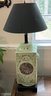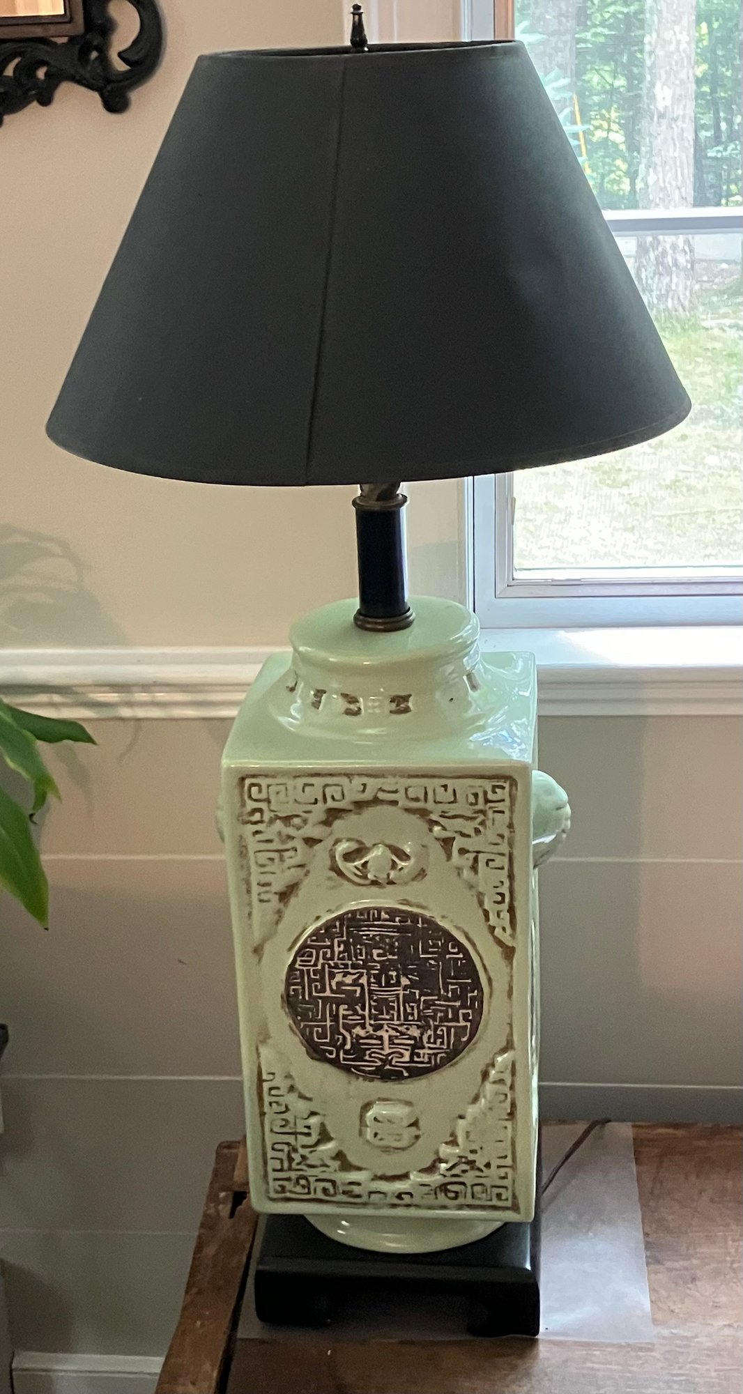 Asian green porcelain table lamp with shade and stand. Dimensions: 33” tall x 8” square. Stand dimensions: 2 1/2” tall x 8” square. Good condition.