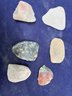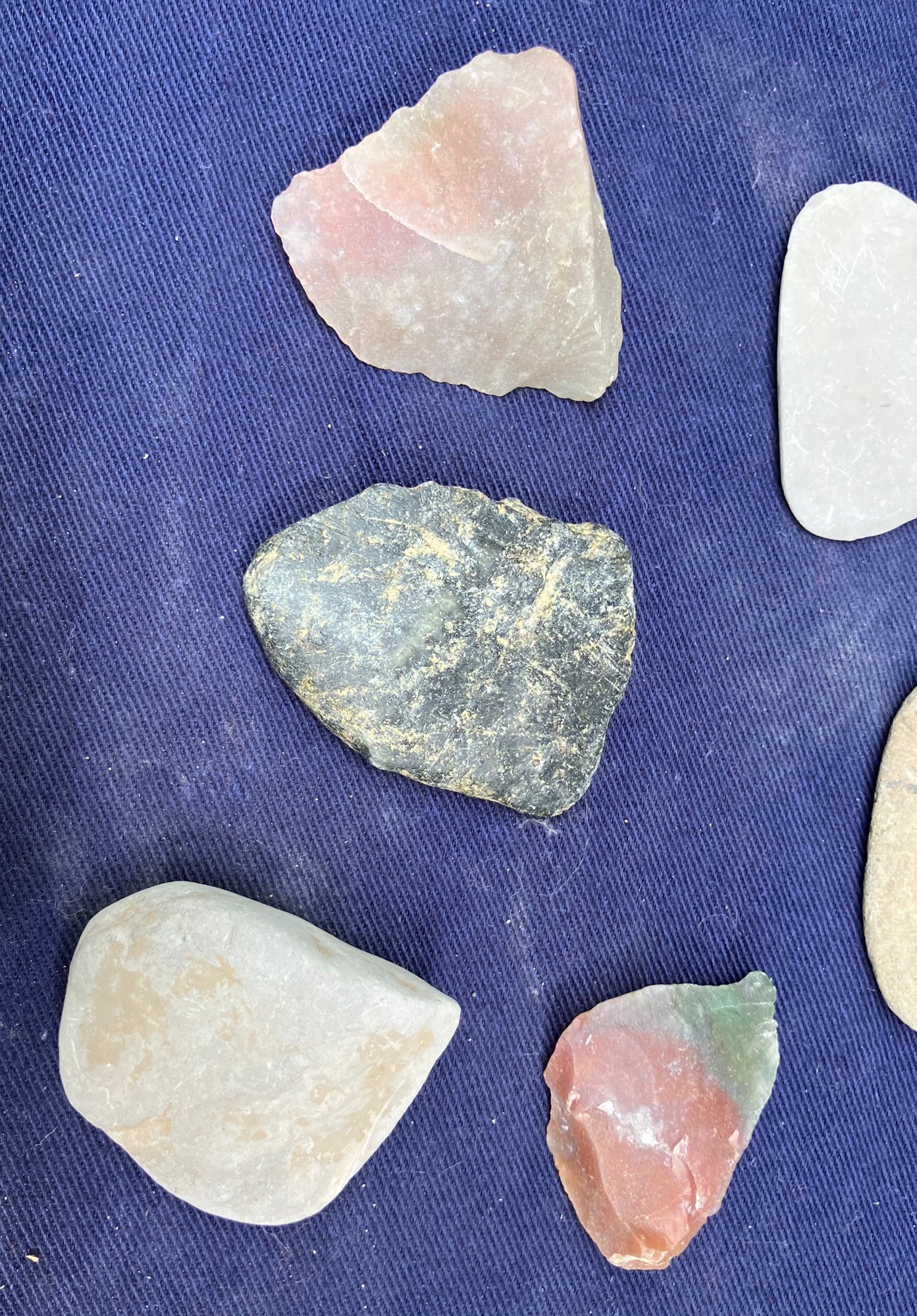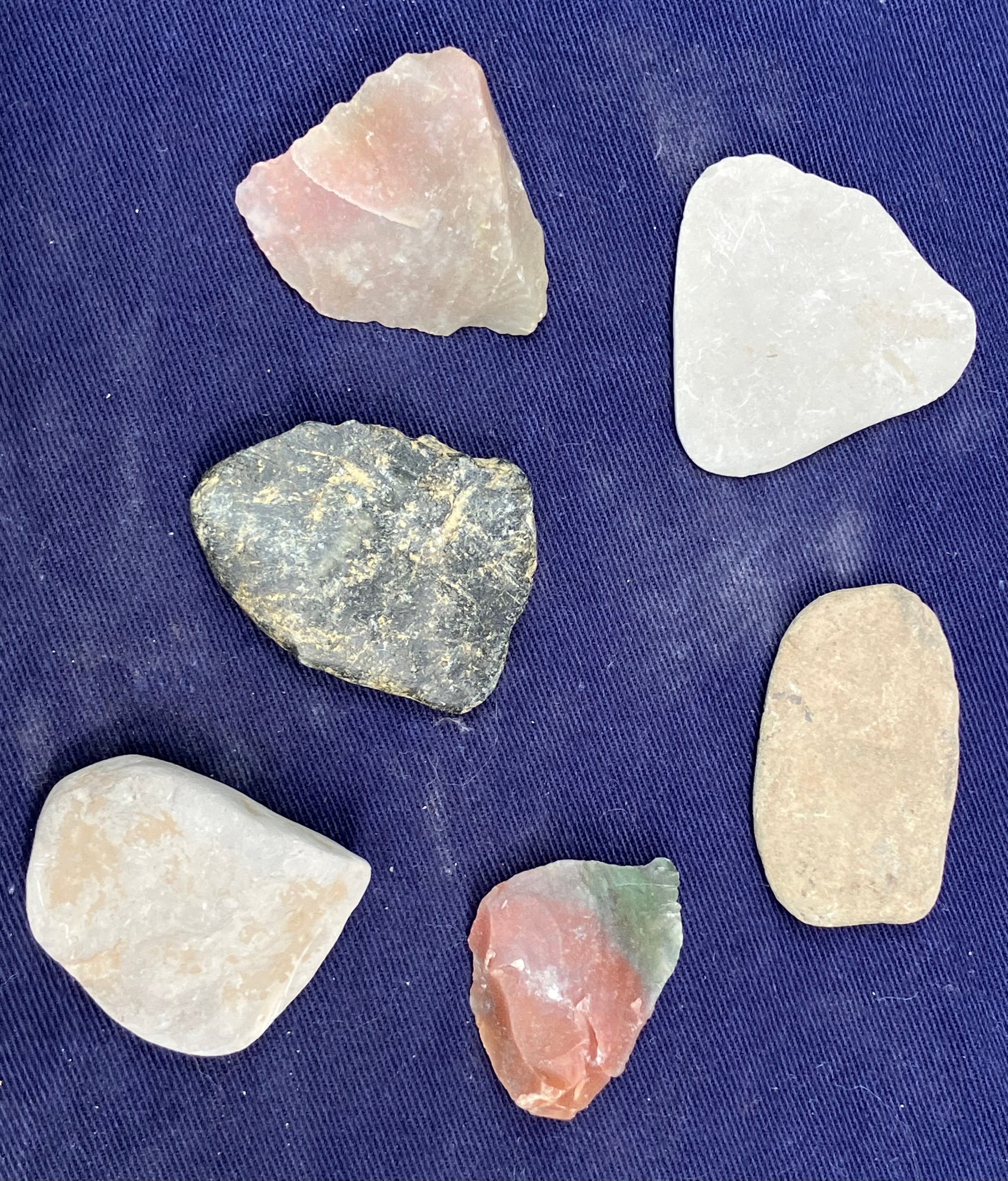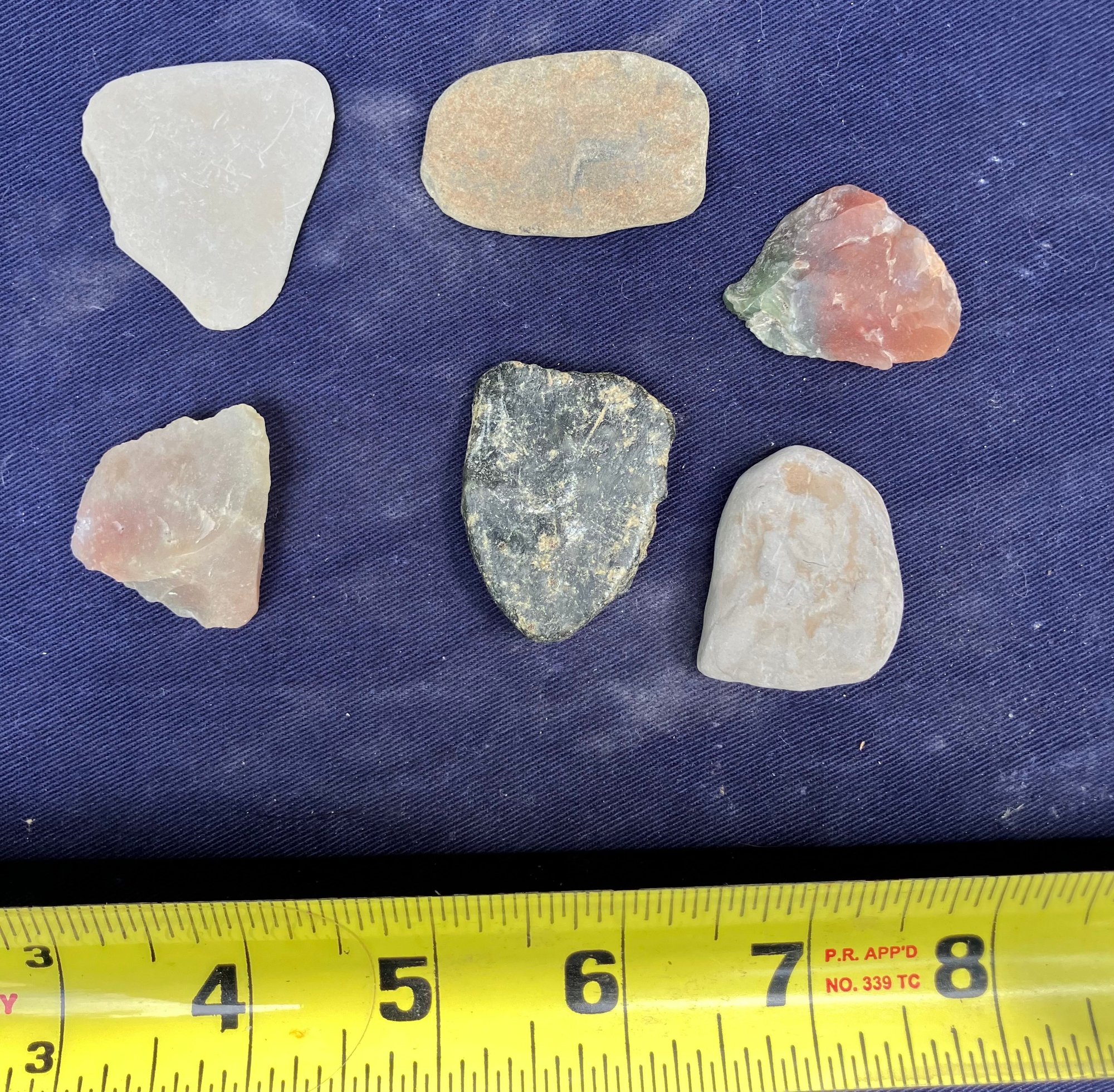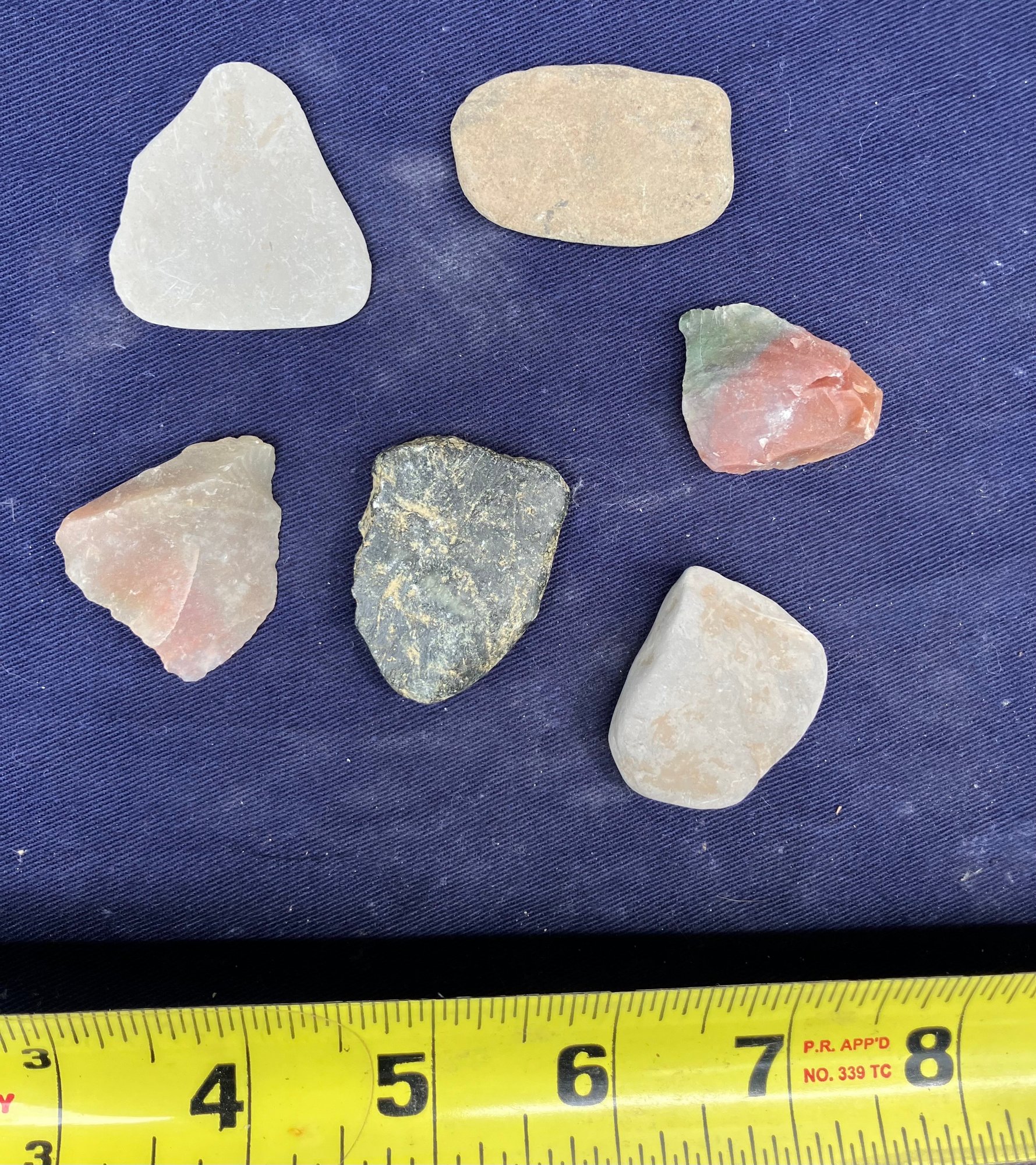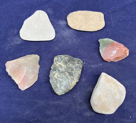Found at a Native American dig site. Three smooth worn sharpening stones. Two quartzite cutting blades and one jewelry or keepsake stone.