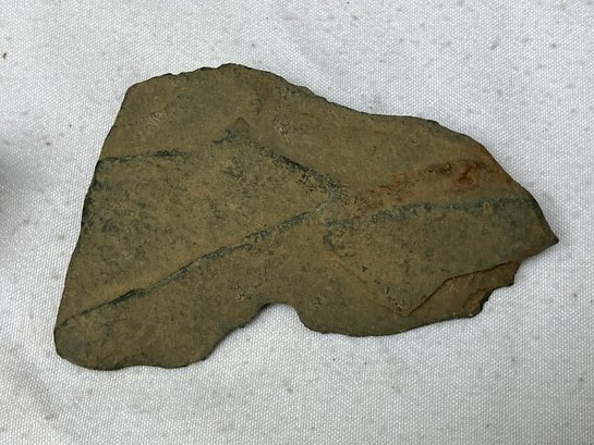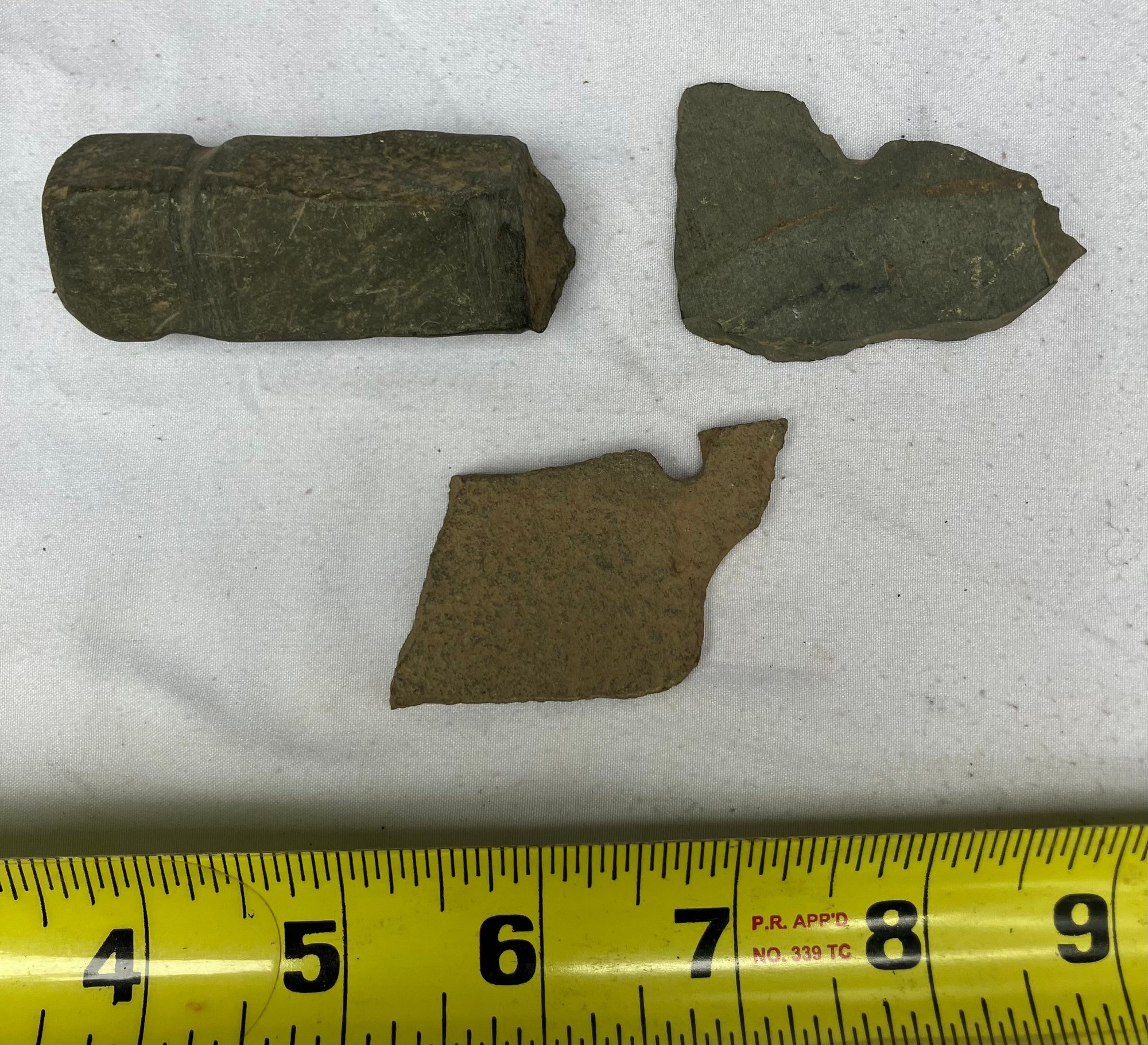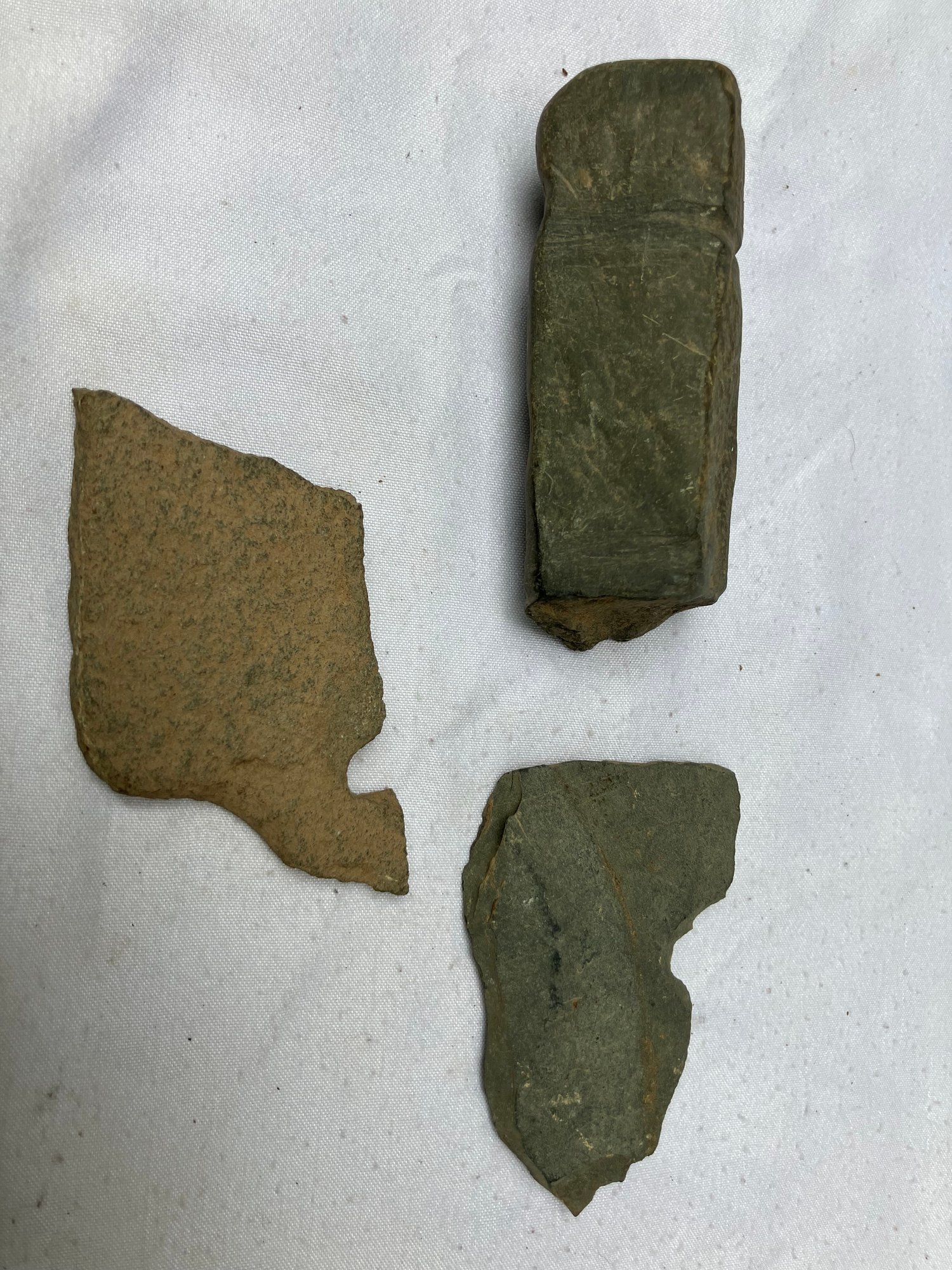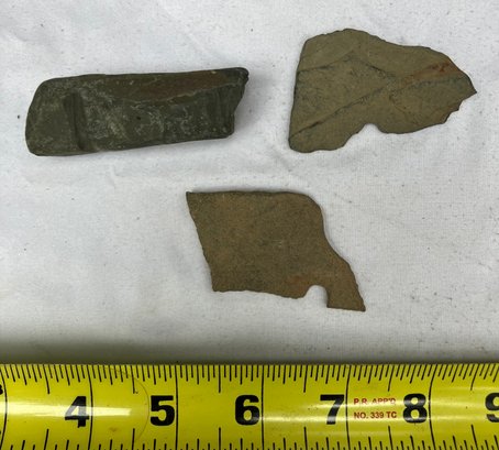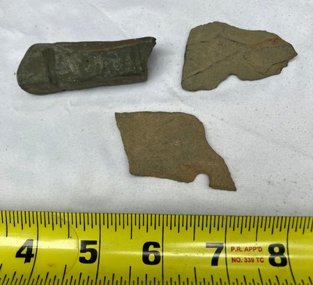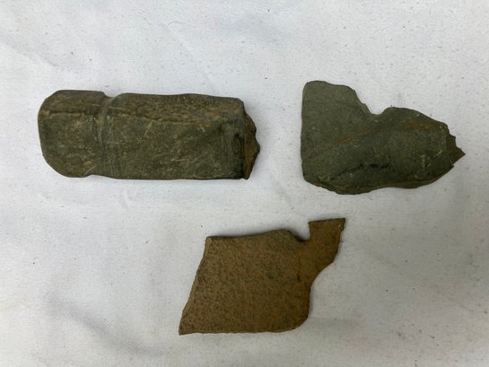 Found at a Native American dig site. One is a four sided stone with man made groove marks. And two others have partially hand drilled holes. Probably pieces from a broken stone gorget.