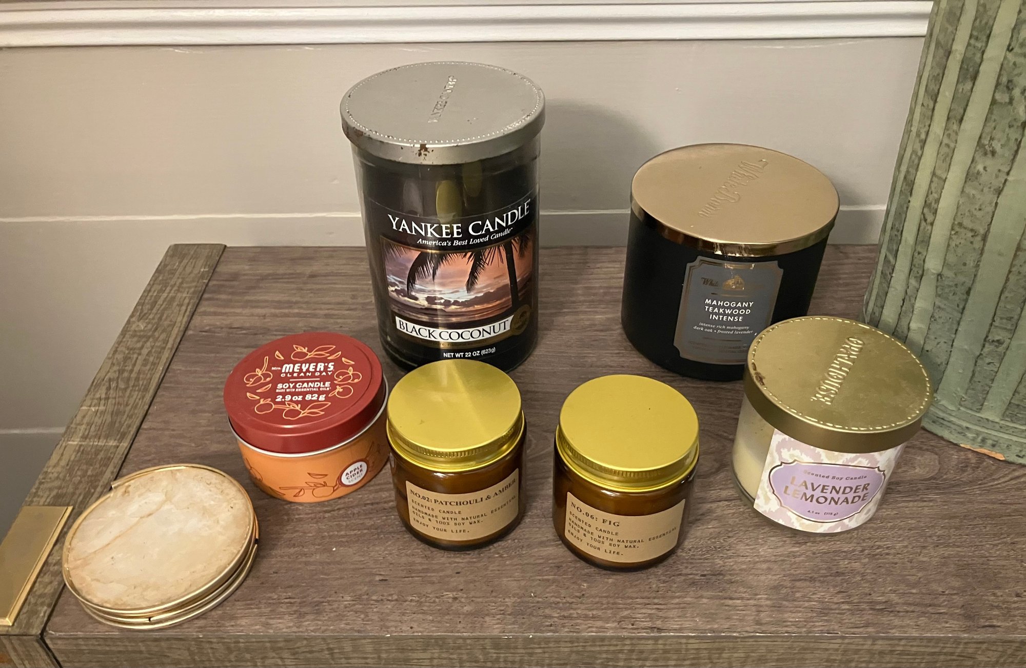 Assortment of candles. Meyer’s soy candle, Yankee candle & more.