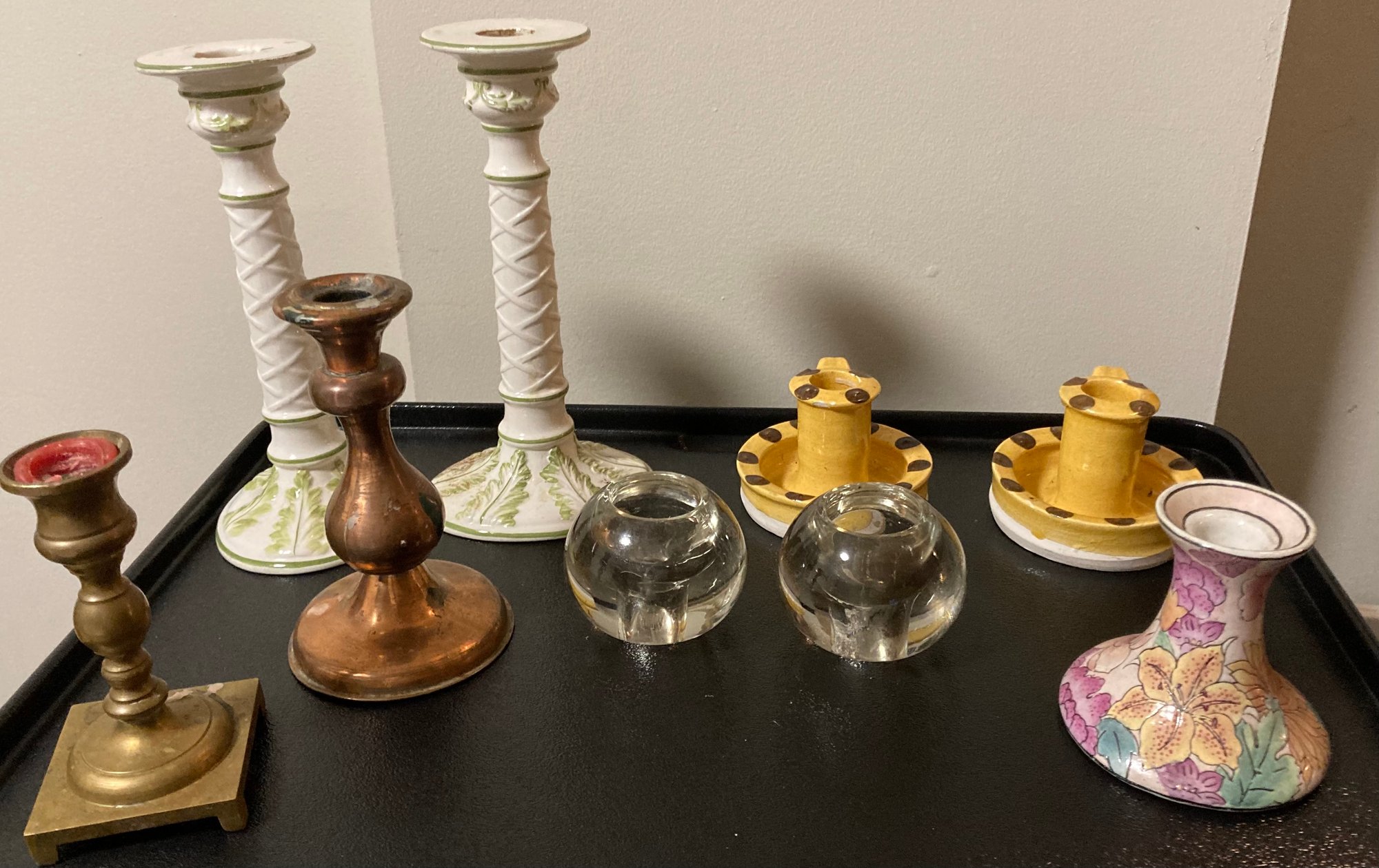 Assortment Of Candlesticks. There is a pair of matching brass candlesticks.(Missing from photos). Small chip on back handle of polka dot candlestick. Fair to good condition.