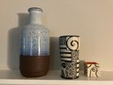 Assortment of ceramic pieces. Vase dimensions: 13” tall x 5 1/2” wide, cup dimensions: 7 1/4” tall x 3 1/4” round & square piece dimensions: 2 1/4” tall x 2” square. Good condition.