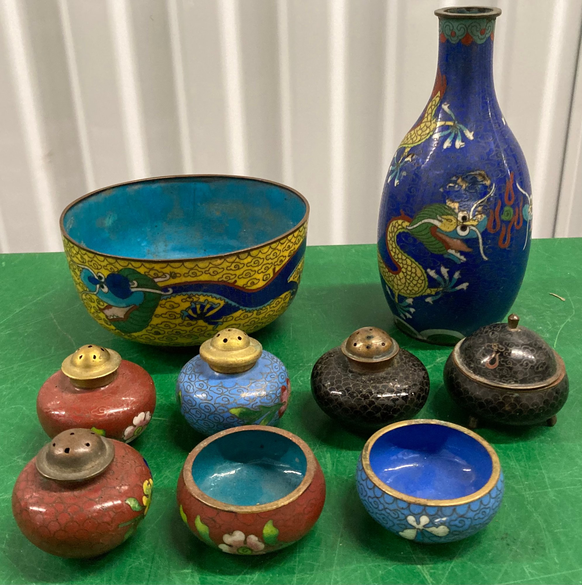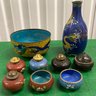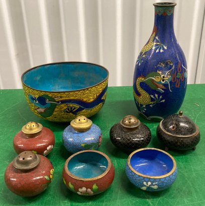 Assortment Of Cloissione Salt & Pepper Shakers Vase & Enameled Bowl. The vase has a dent. Vase dimensions are: 5 1/2” tall x 2” wide. Salt & pepper shakers are in good condition. Bowl dimensions are: 2” tall x 4 1/4” round.