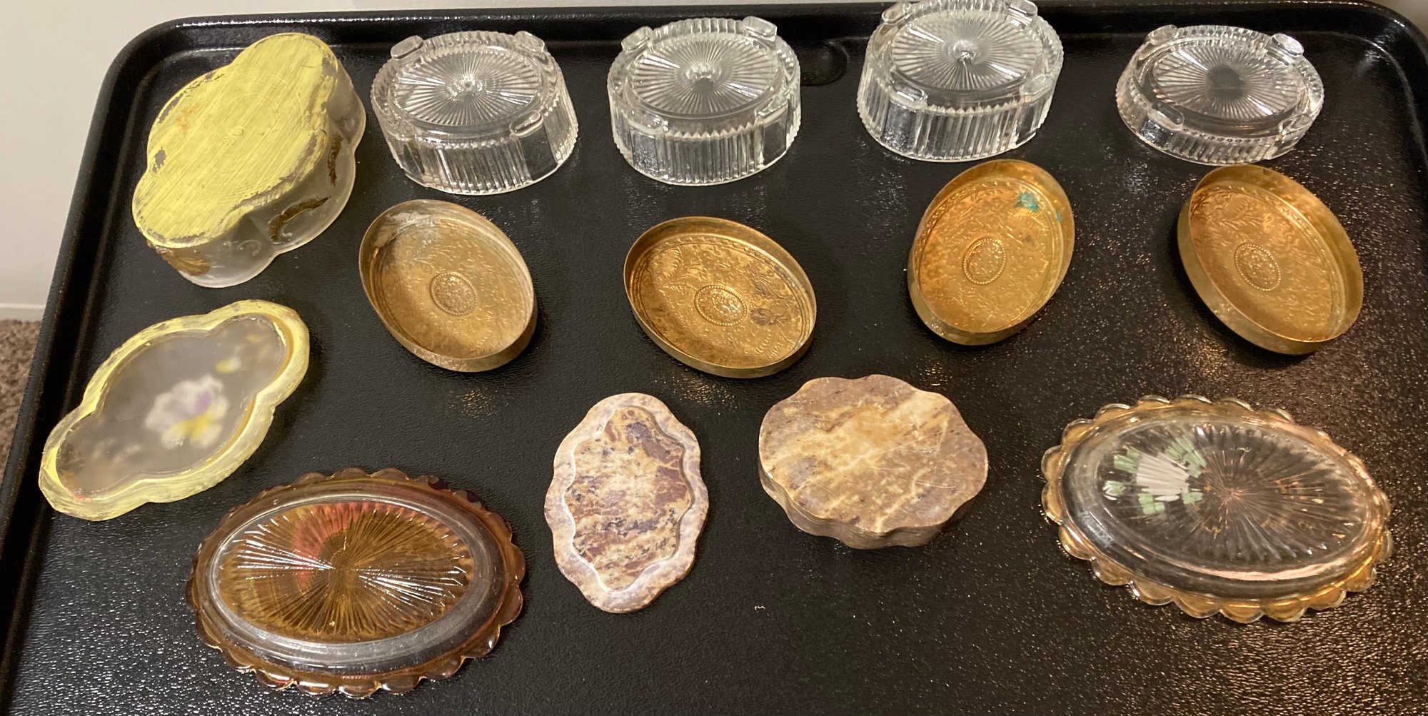 Assortment Of Decorative Boxes. Dimensions of yellow painted box is: 1 1/2” tall x 3” deep x 4 1/4” deep, cranberry dish dimensions: 4 1/2” long x 3” wide, gold painted dish dimensions: 4 1/2” long x 3” wide, stone dish dimensions are: 1 1/4” tall x 2 1/4” deep x 3” long, (3) crystal dishes with brass lids dimensions are: 1 3/4” tall x 2 1/8” deep x 3” long and one crystal dish with brass lid dimensions are: 1 1/4” tall x 2 1/8” deep x 3” long. Good condition.