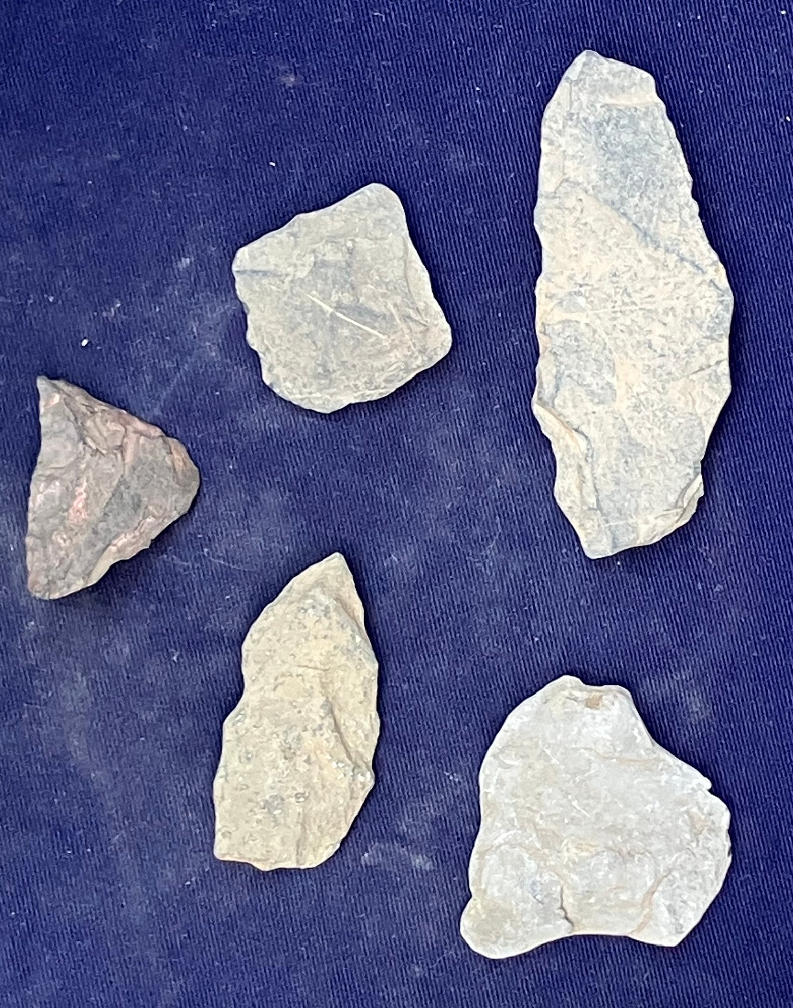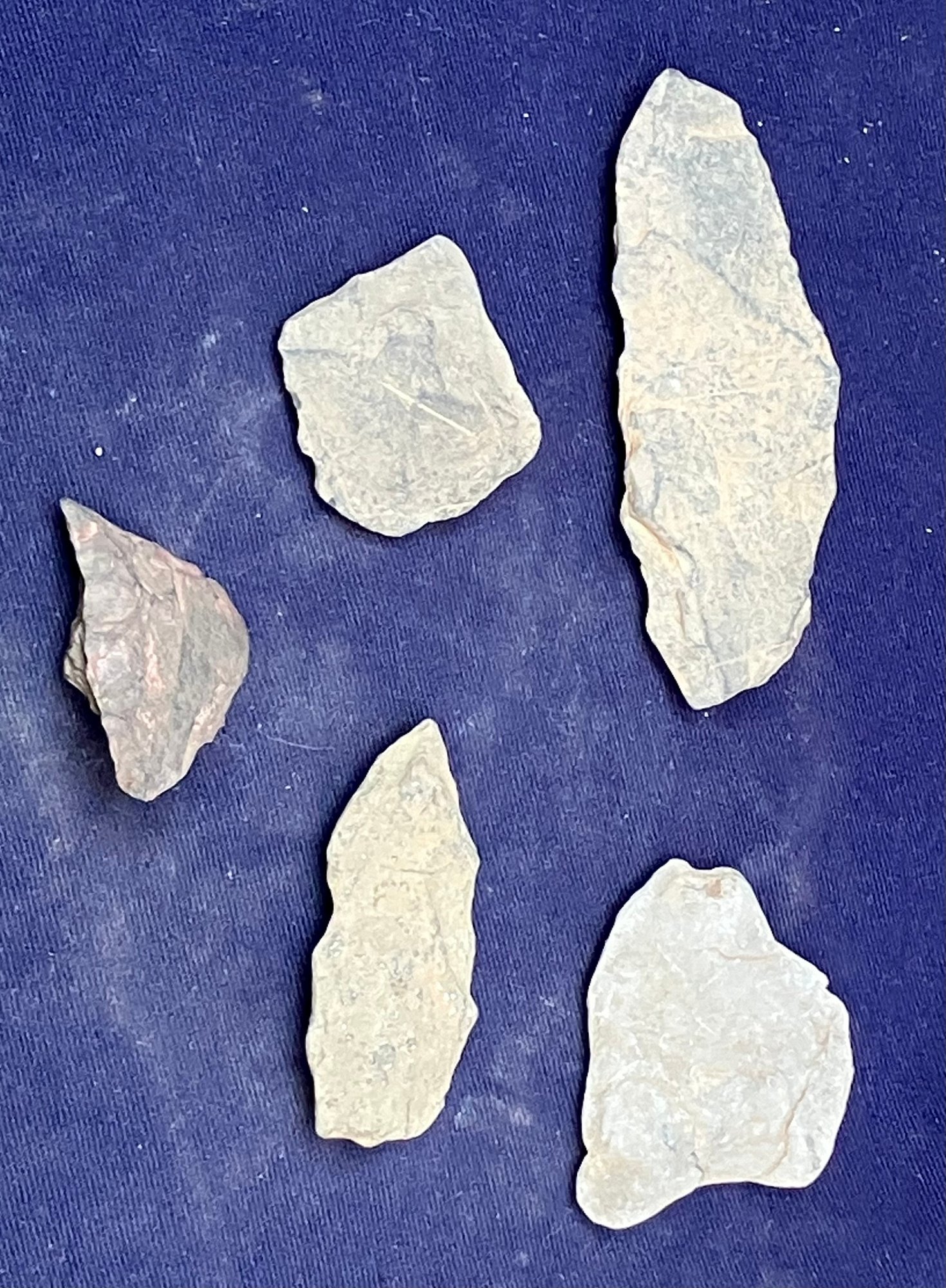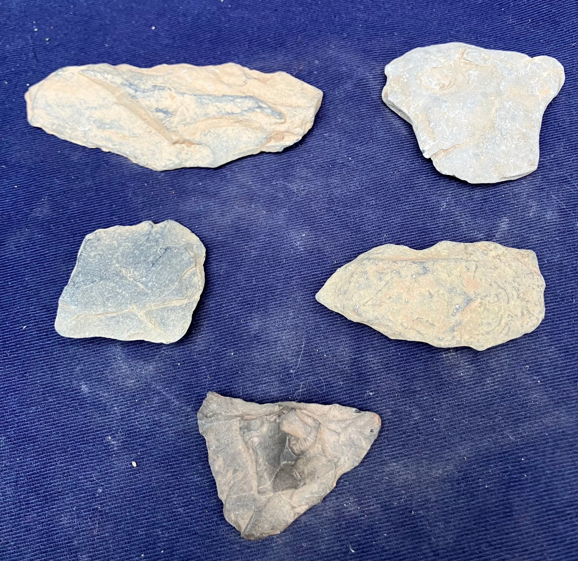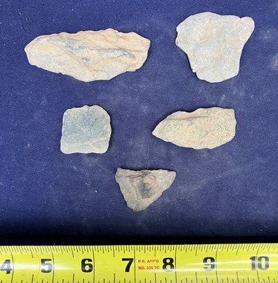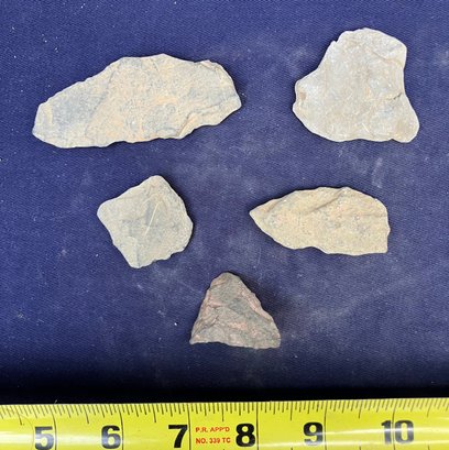 Found at a Native American dig site. Four are cutting tools and/or knife blades. One appears to be a sharpening tool or grinding stone.