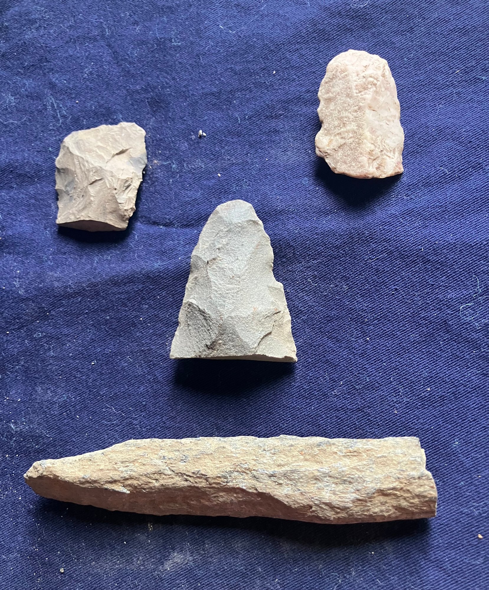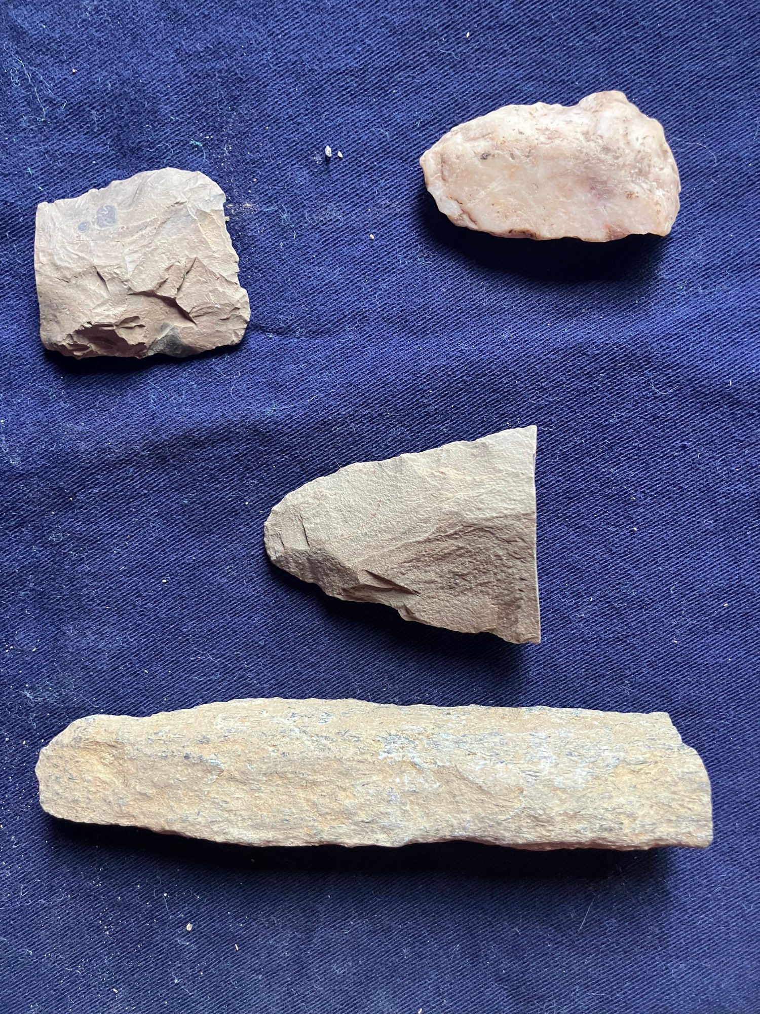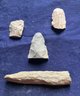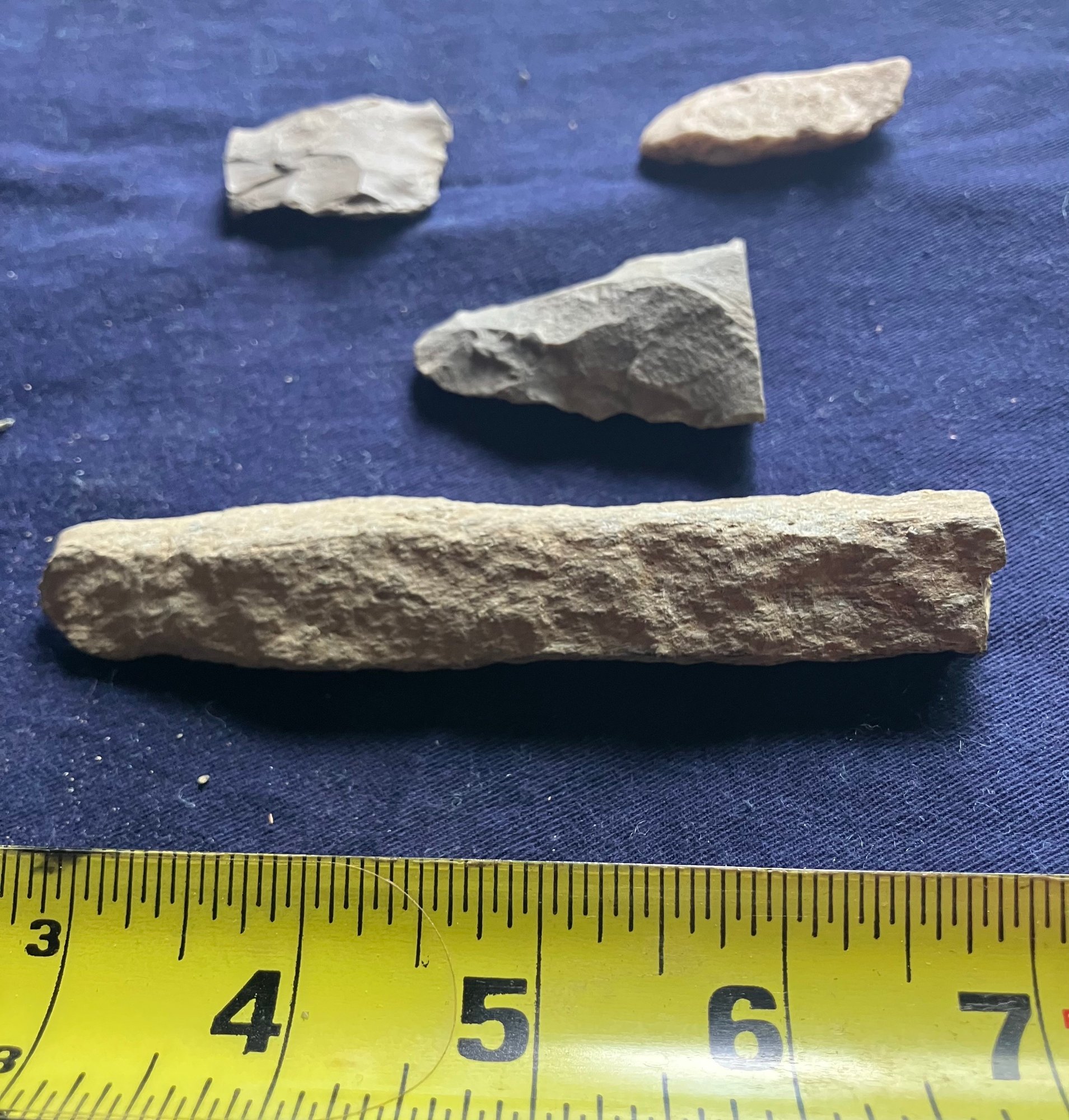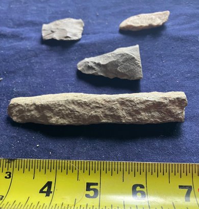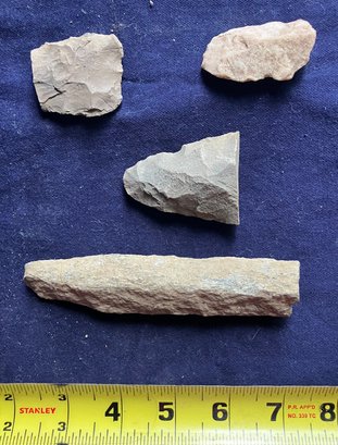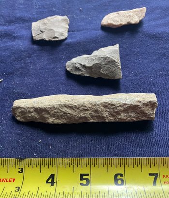 Found at a Native American dig site. One large bi-facial blade or possibly sharpening stone. Two broken projectile points and one repurposed bi-facial cutting/scraping tool.