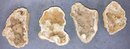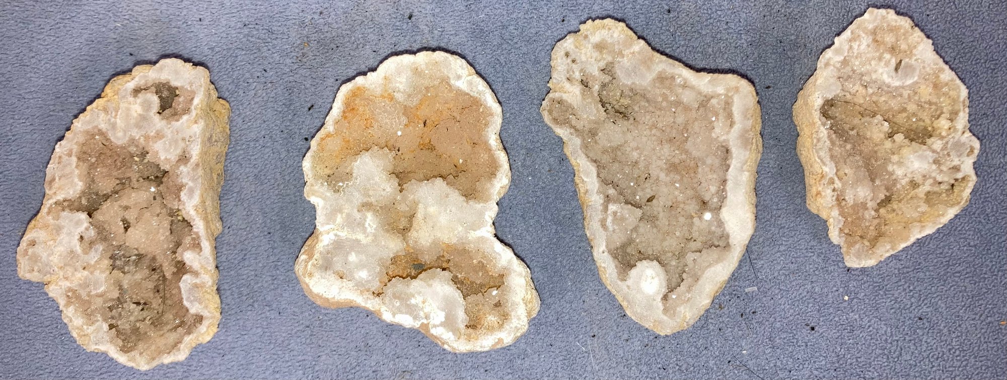 Assortment of geodes. Dimensions are: 1” tall x 3 1/4” long x 2” wide, 1” tall x 3 1/4” long x 2 1/4” wide, 1 1/2” tall x 3 1/4” long x 2 1/4” wide and 1” tall x 2 3/4” long x 1 3/4” wide. Condition: See photos.