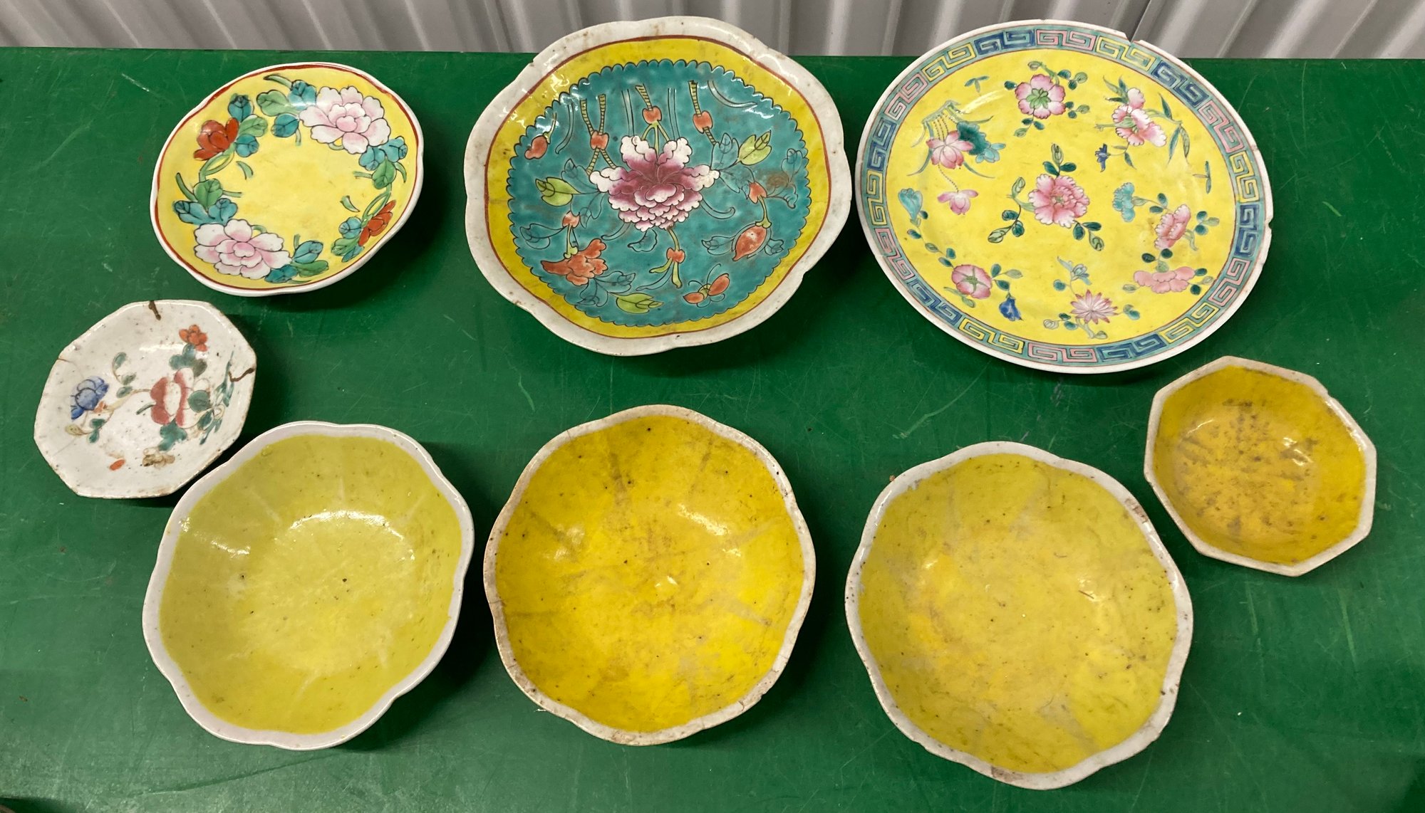 Assortment Of Glazed Painted Porcelain Bowls. Some chips. Sizes range from 4” to 6”. Bowl is 8” & plate is 9”. Fair condition.