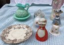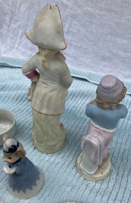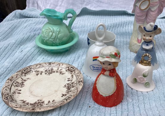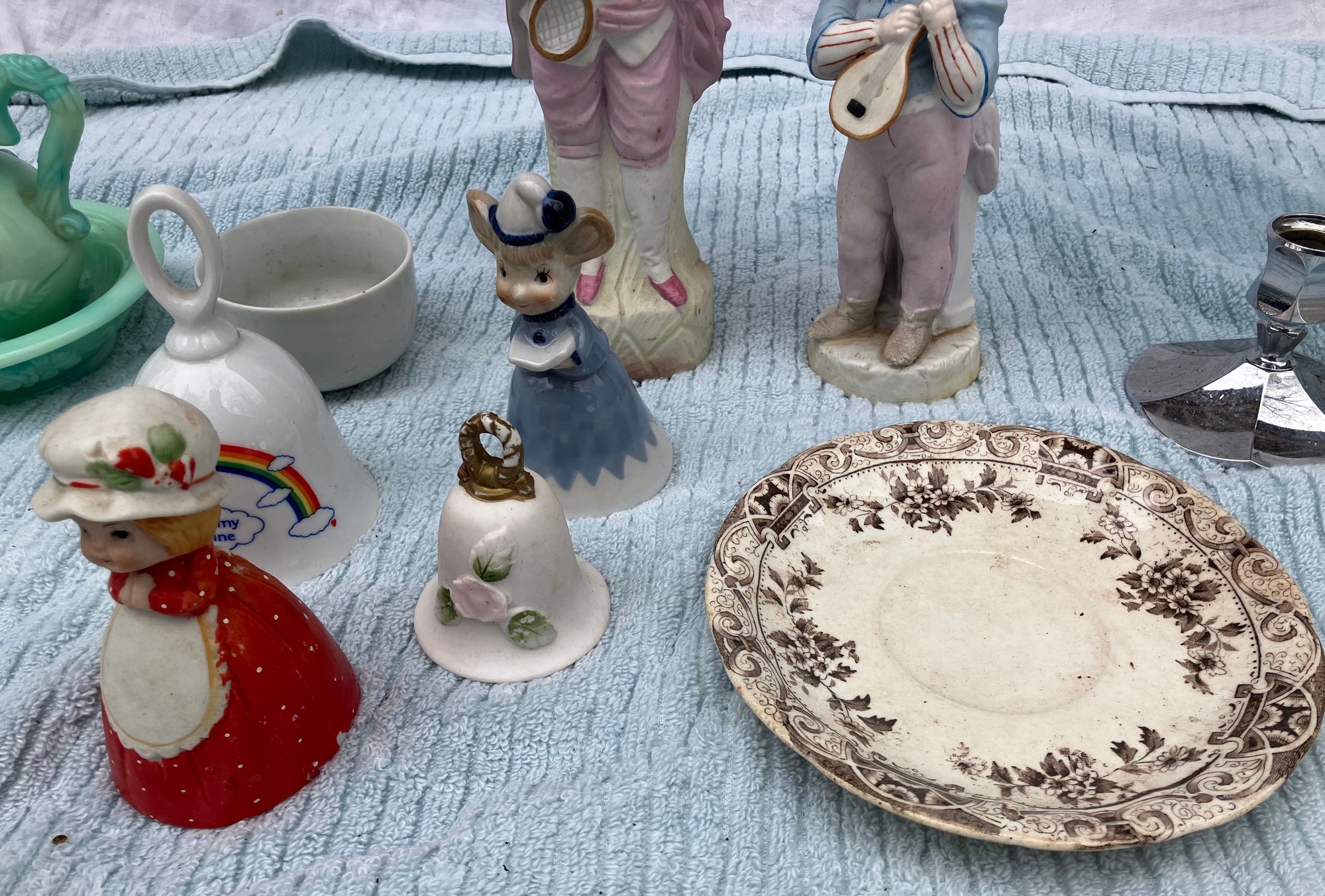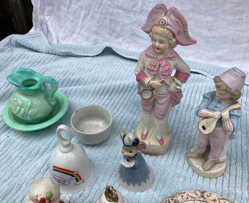 Assortment of items. Porcelain figures, chinaware, bells and more.