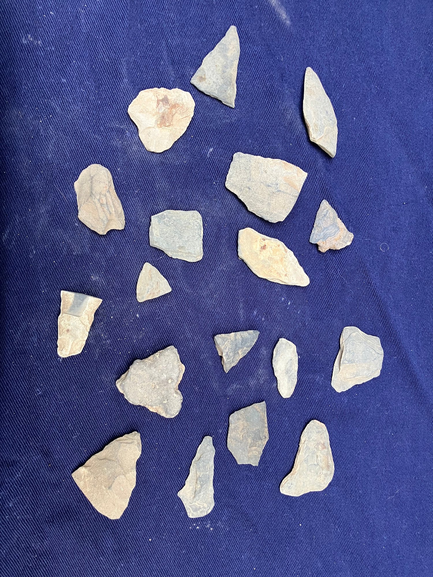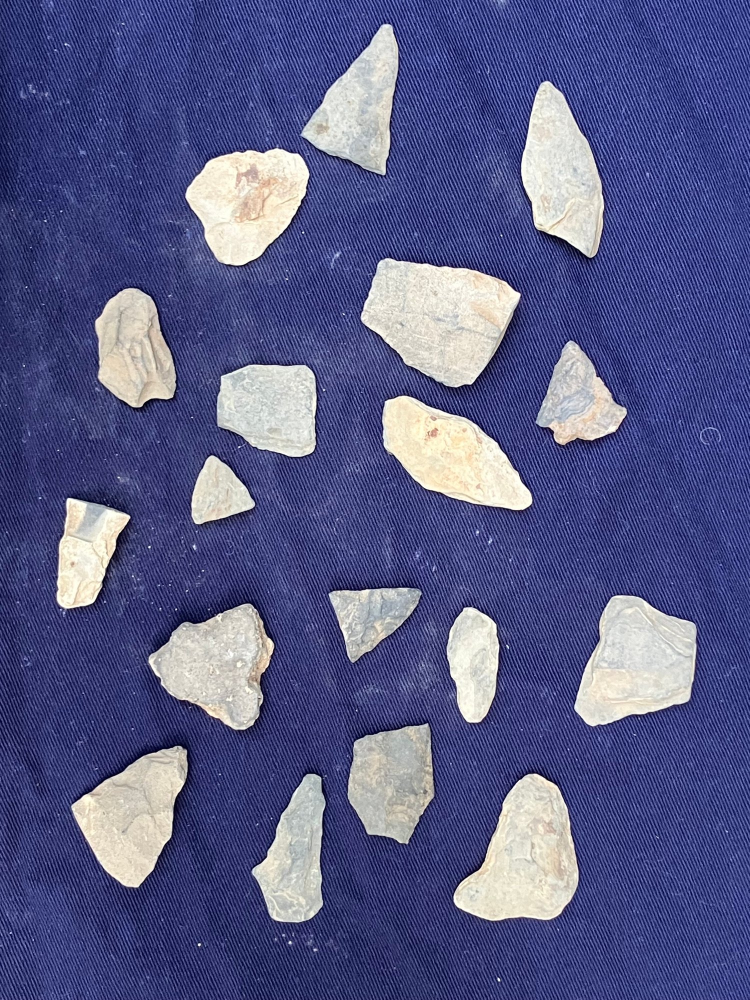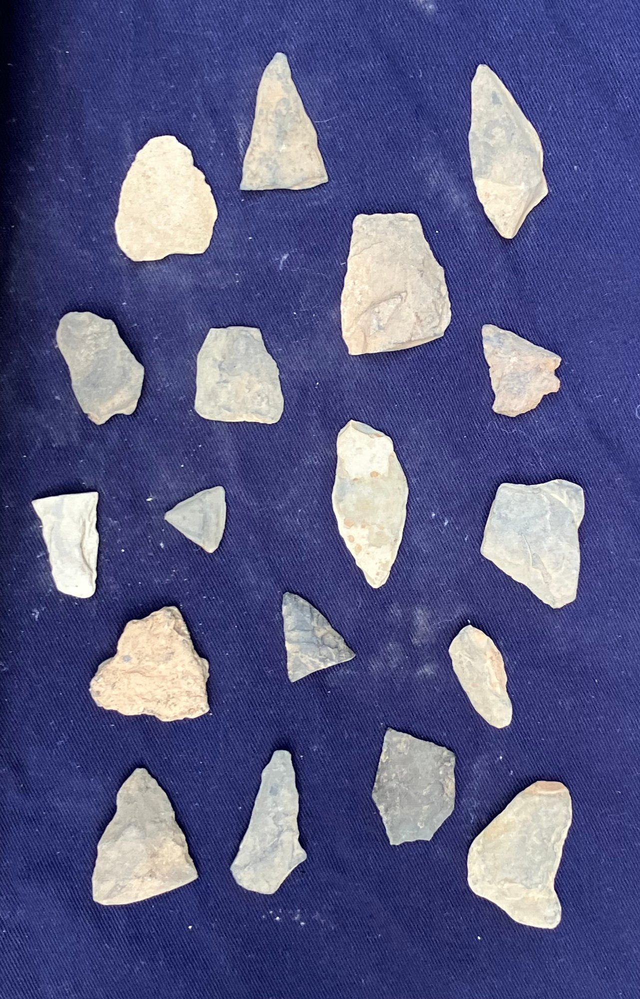 Found at a Native American dig site. Assortment of Archaic/Paleo-Indian Period projectile points and tools. Several are broken or repurposed. There is one pottery shard.