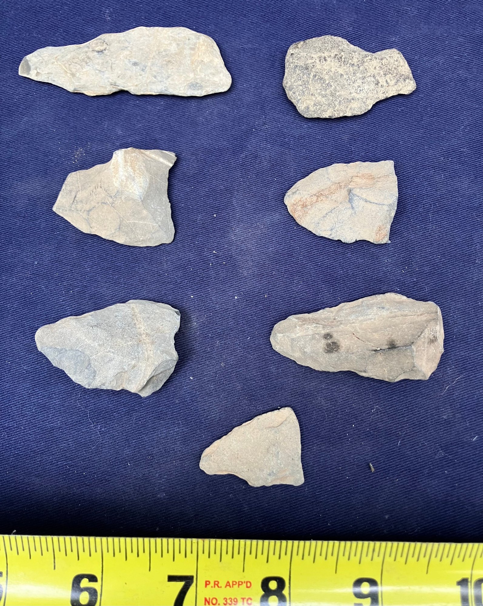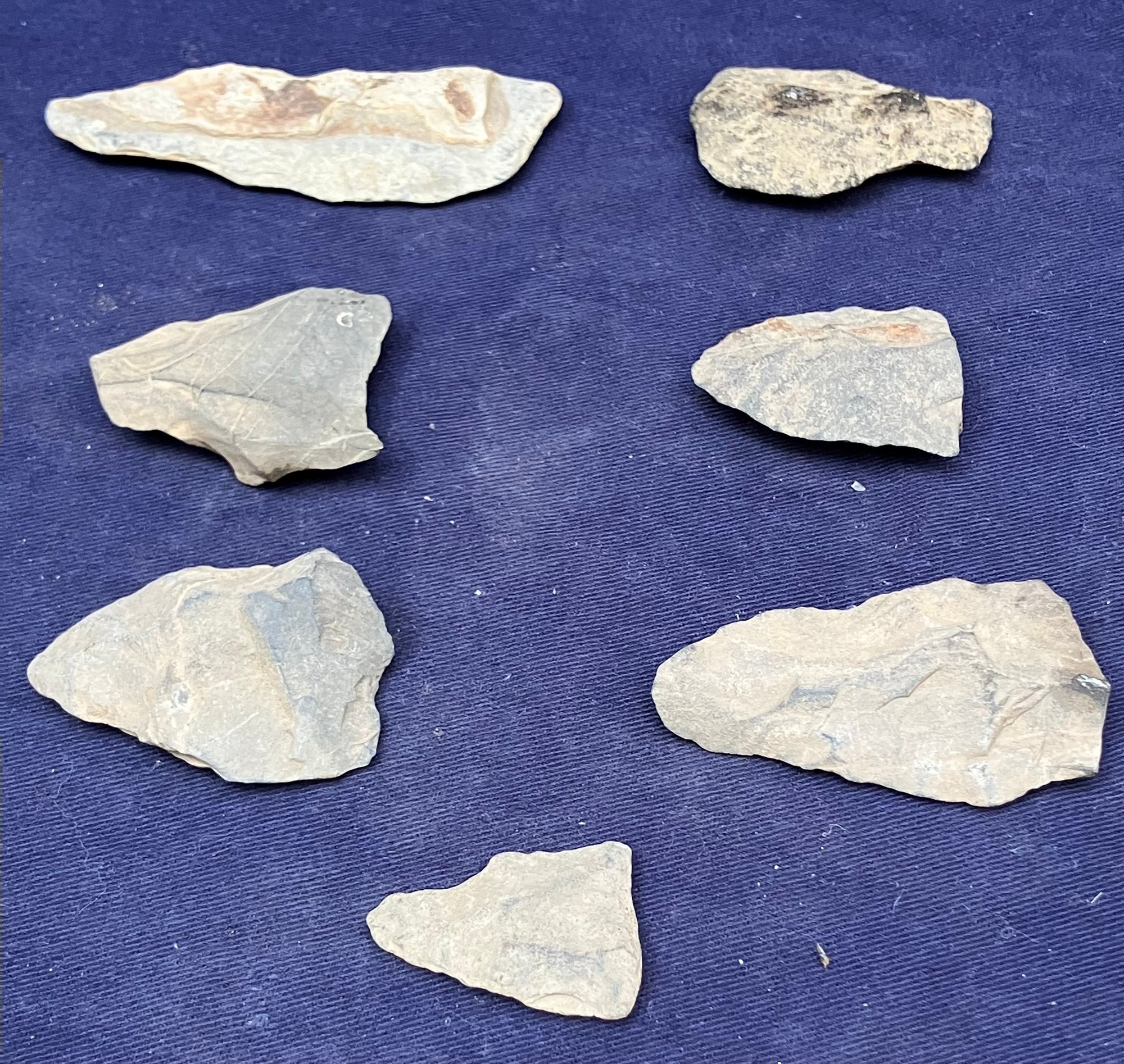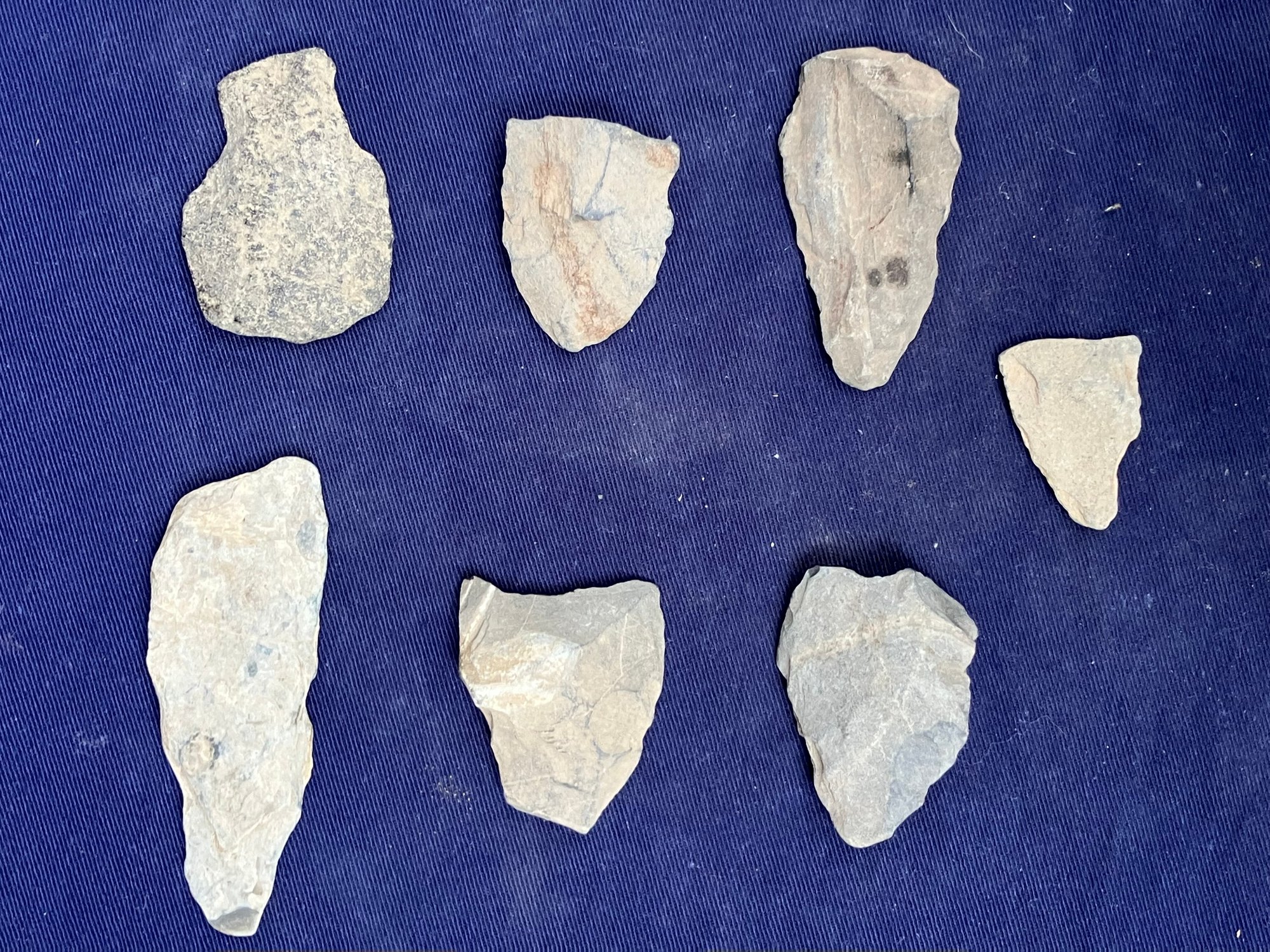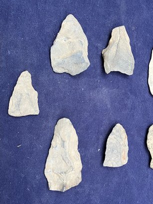 Found at a Native American dig site. There are two broken points and five blades and/or scrapers.