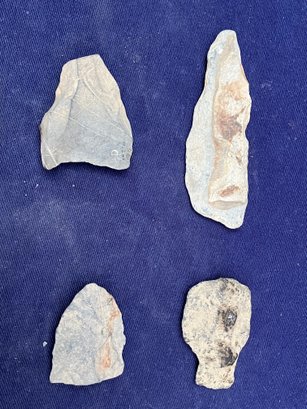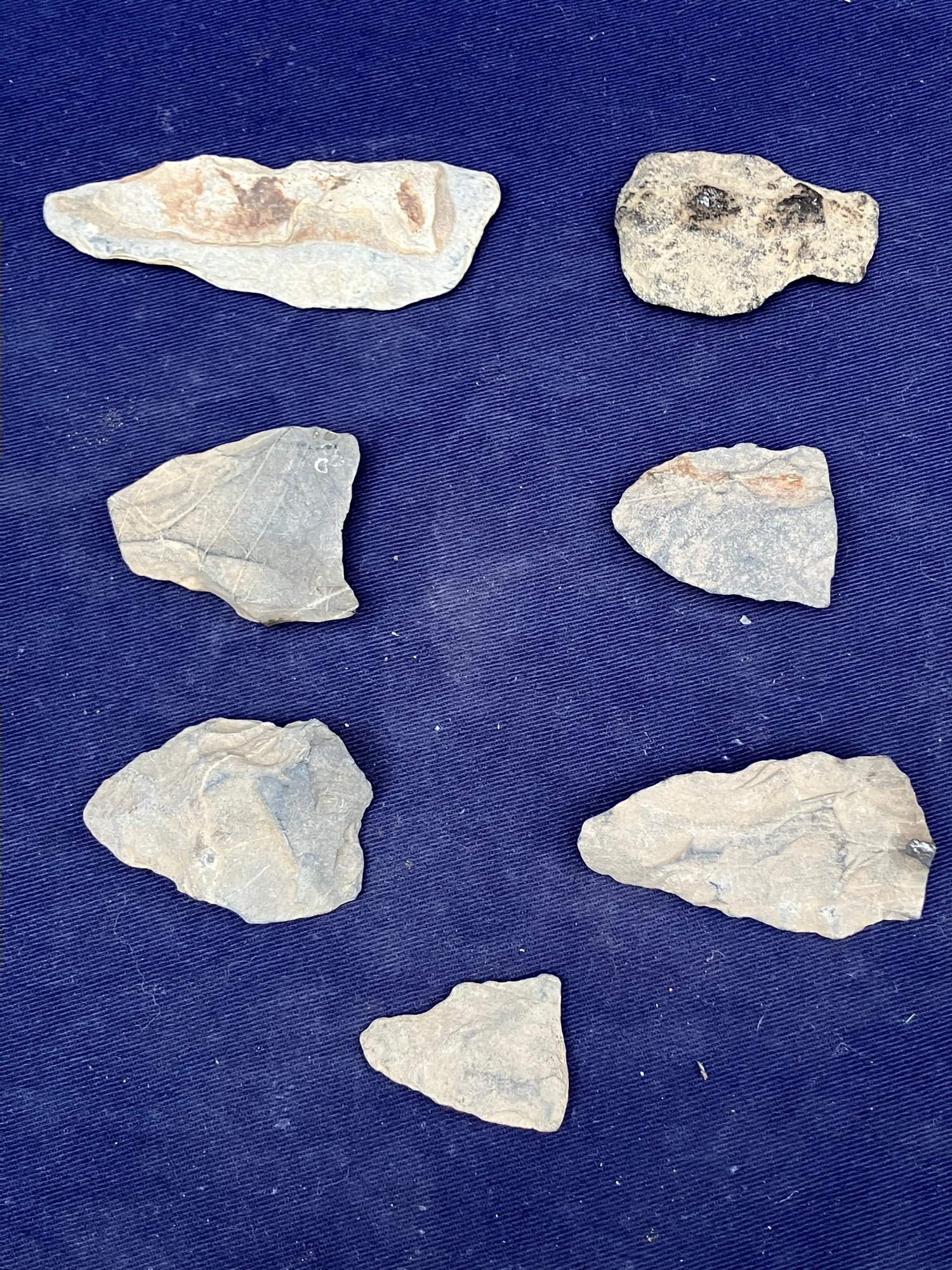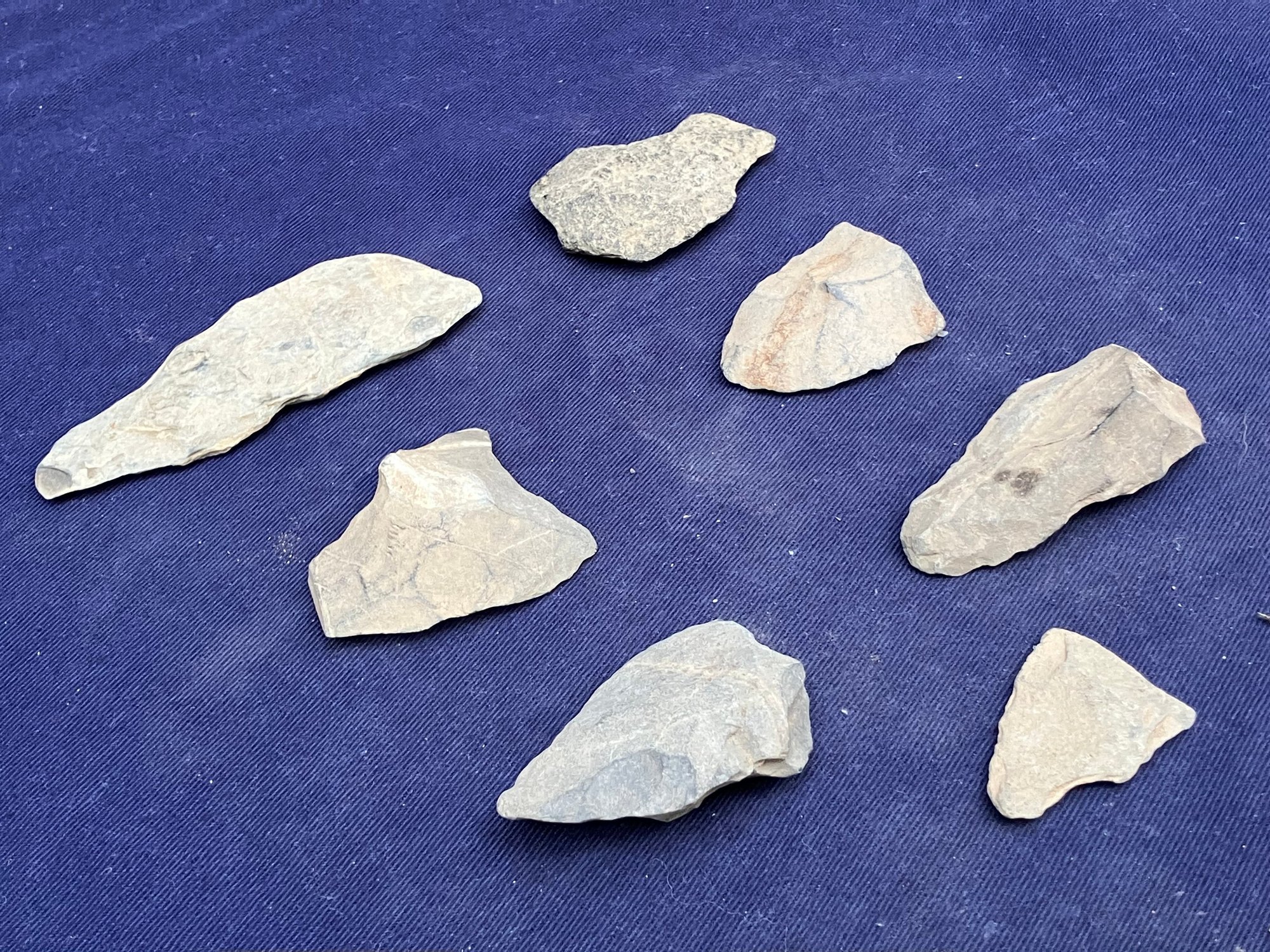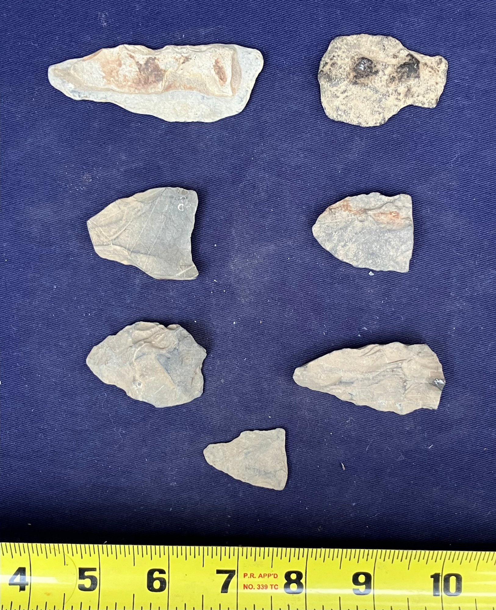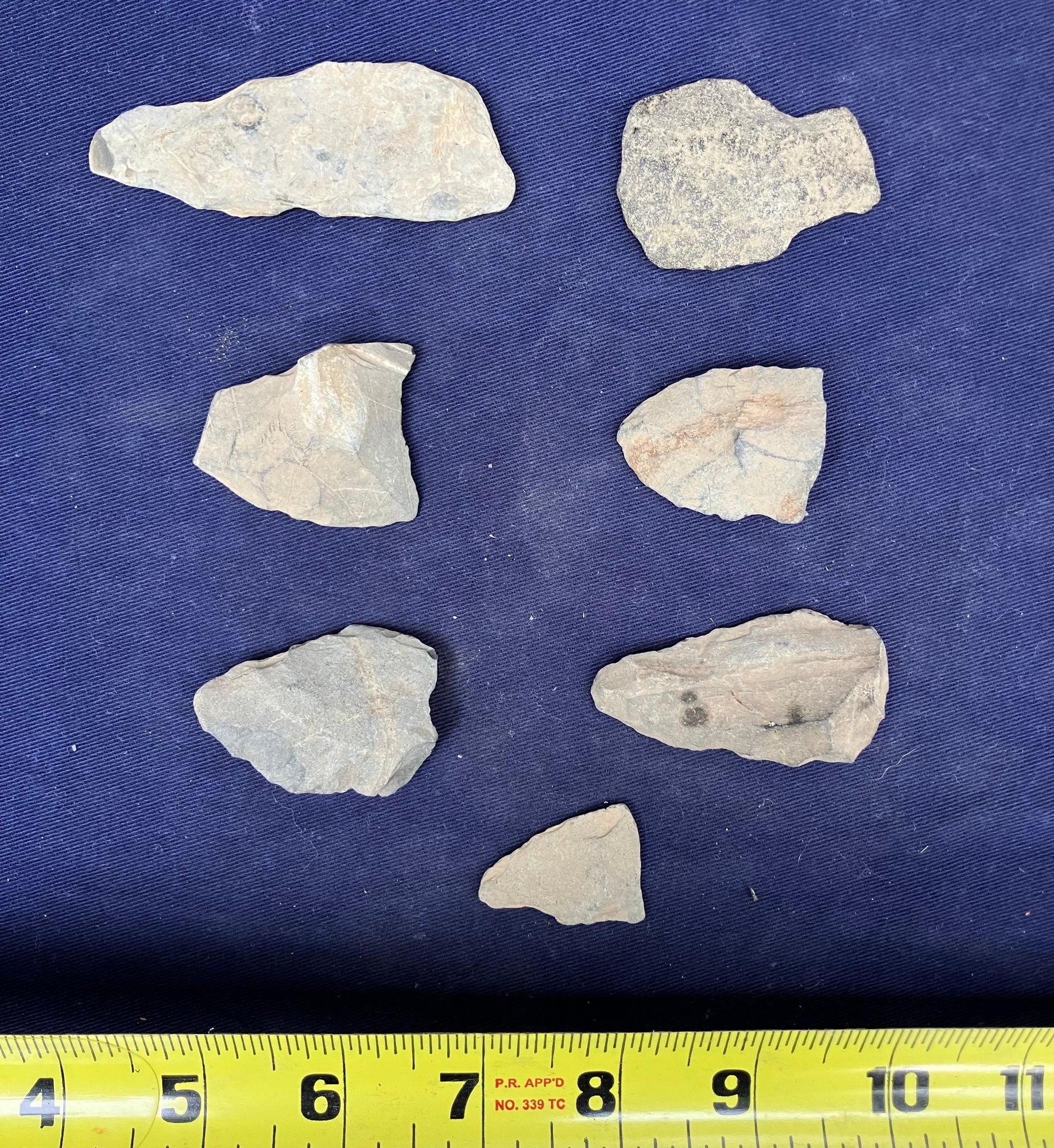 Found at a Native American dig site. There are two broken points and five blades and/or scrapers.