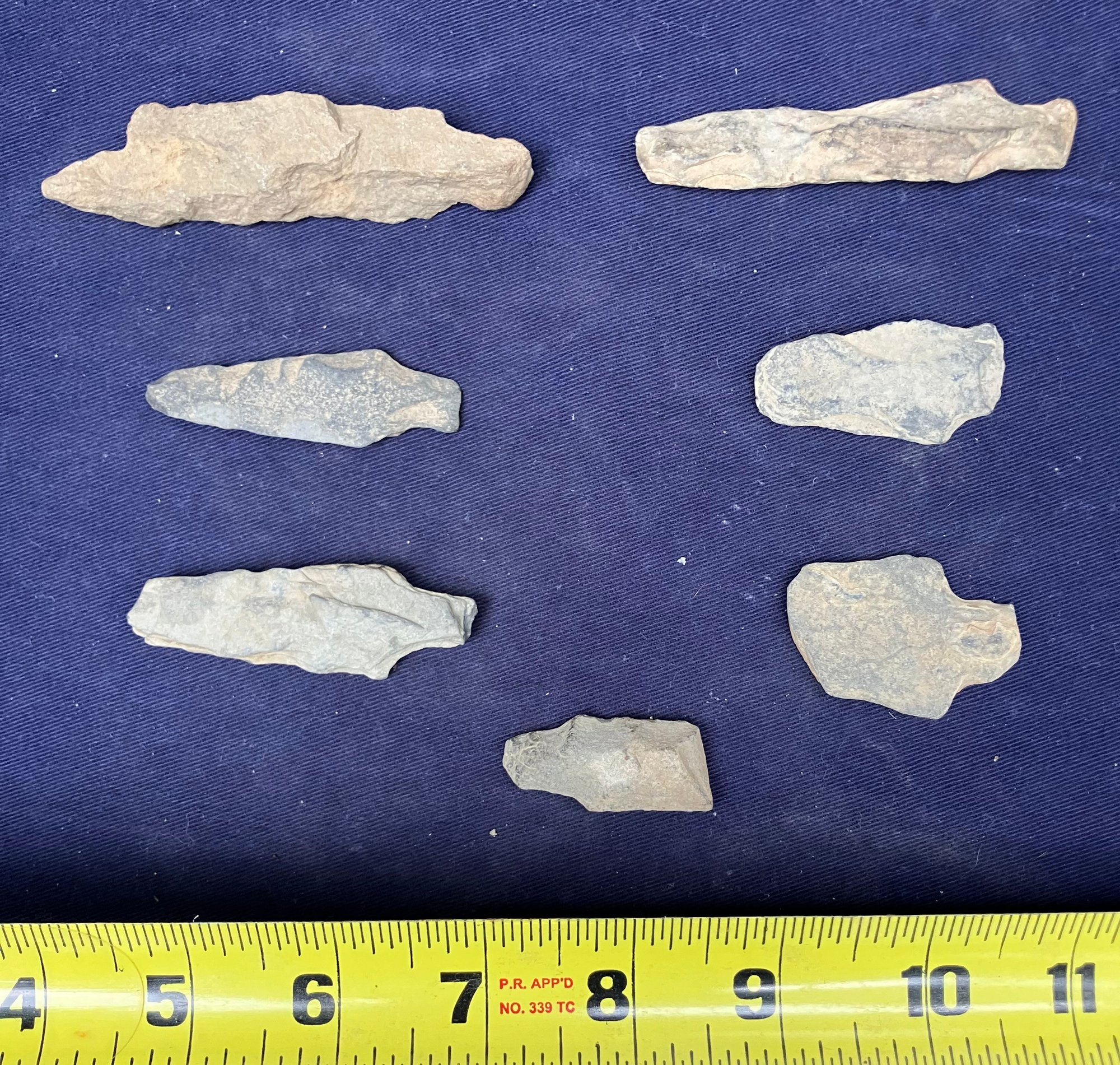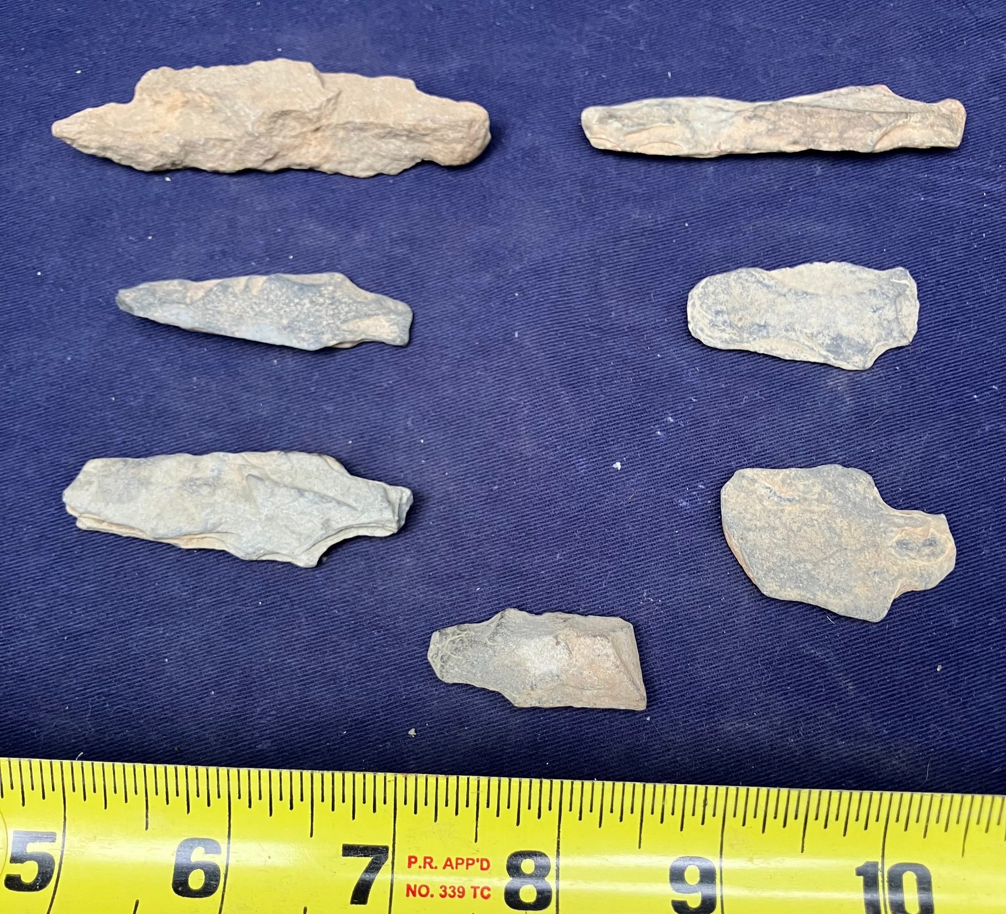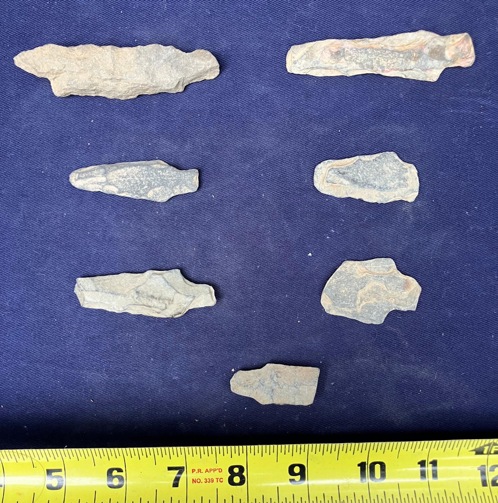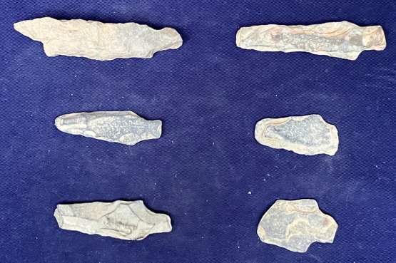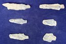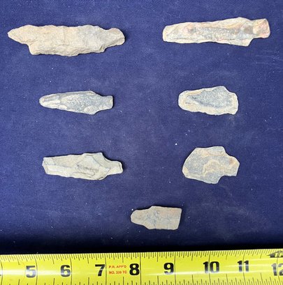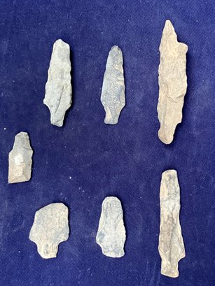 Found at a Native American dig site. They are all single stemmed. There are six points and one knife blade.