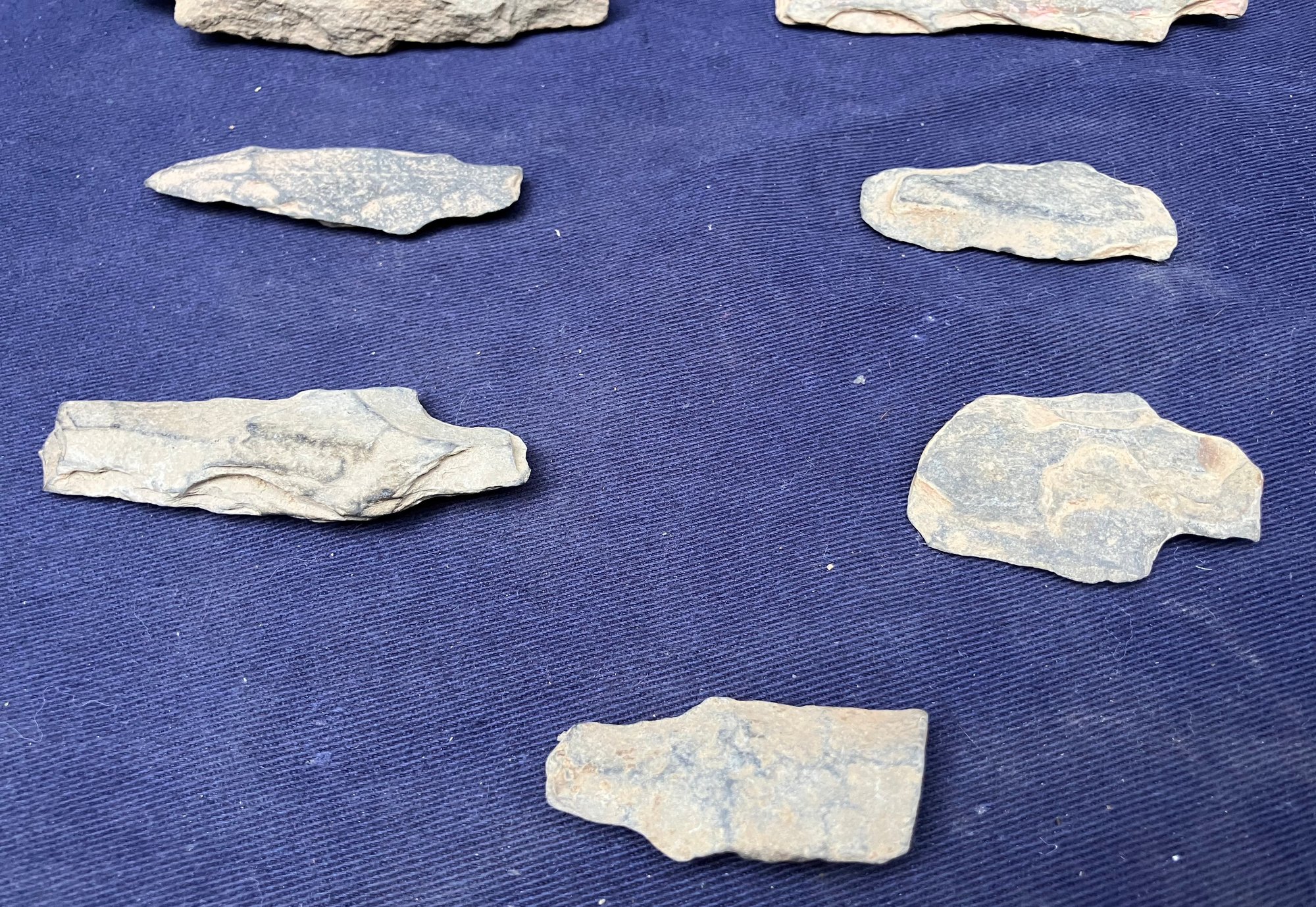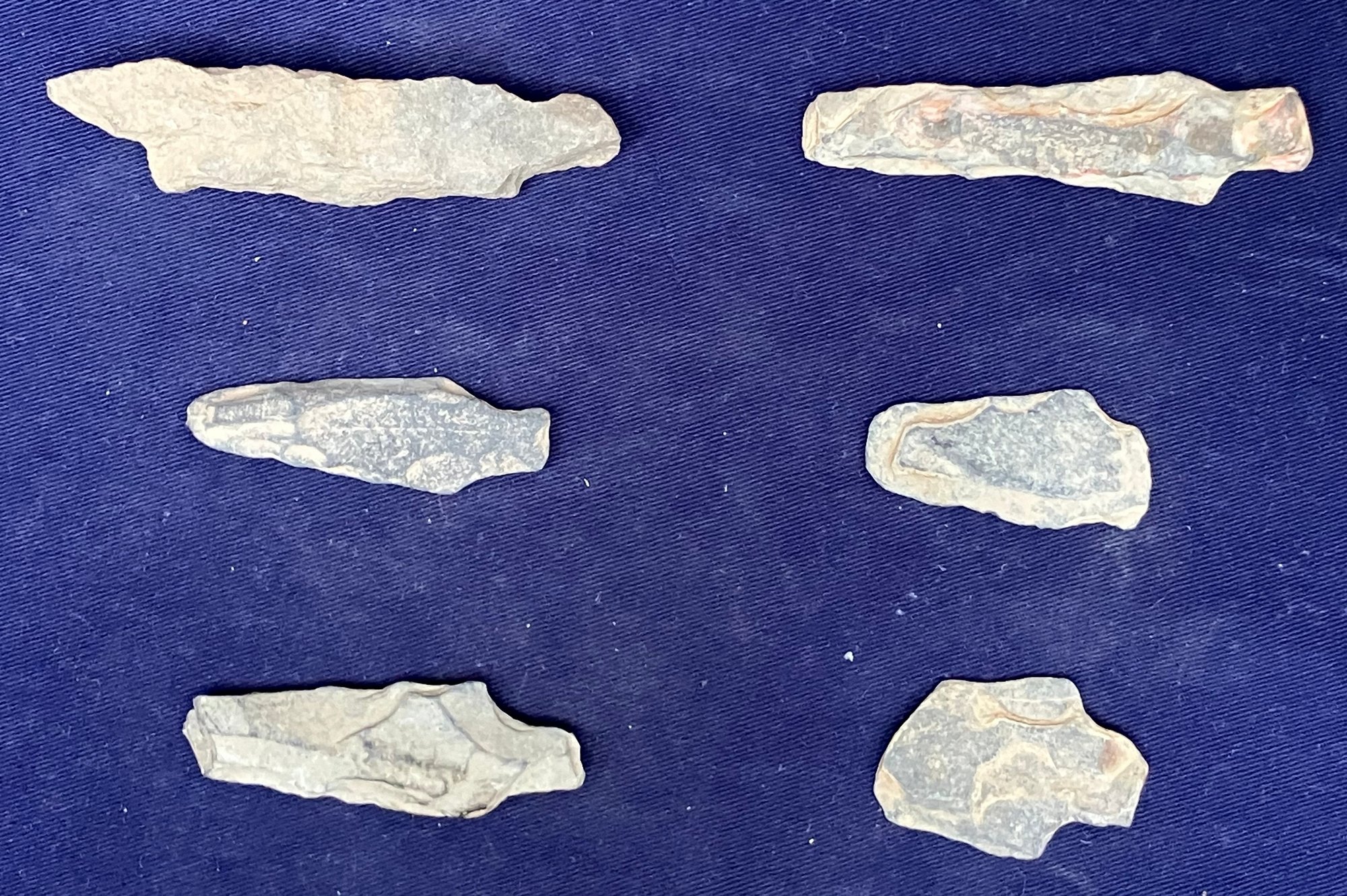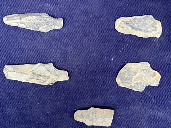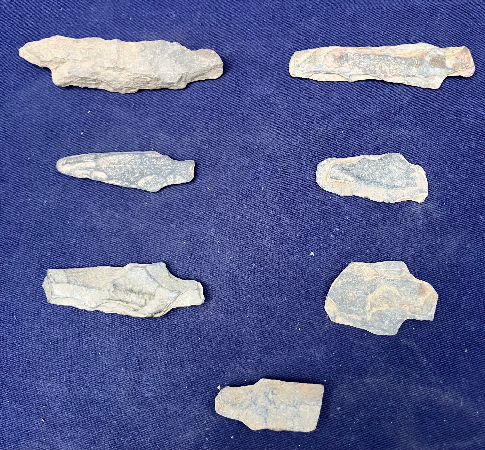 Found at a Native American dig site. They are all single stemmed. There are six points and one knife blade.