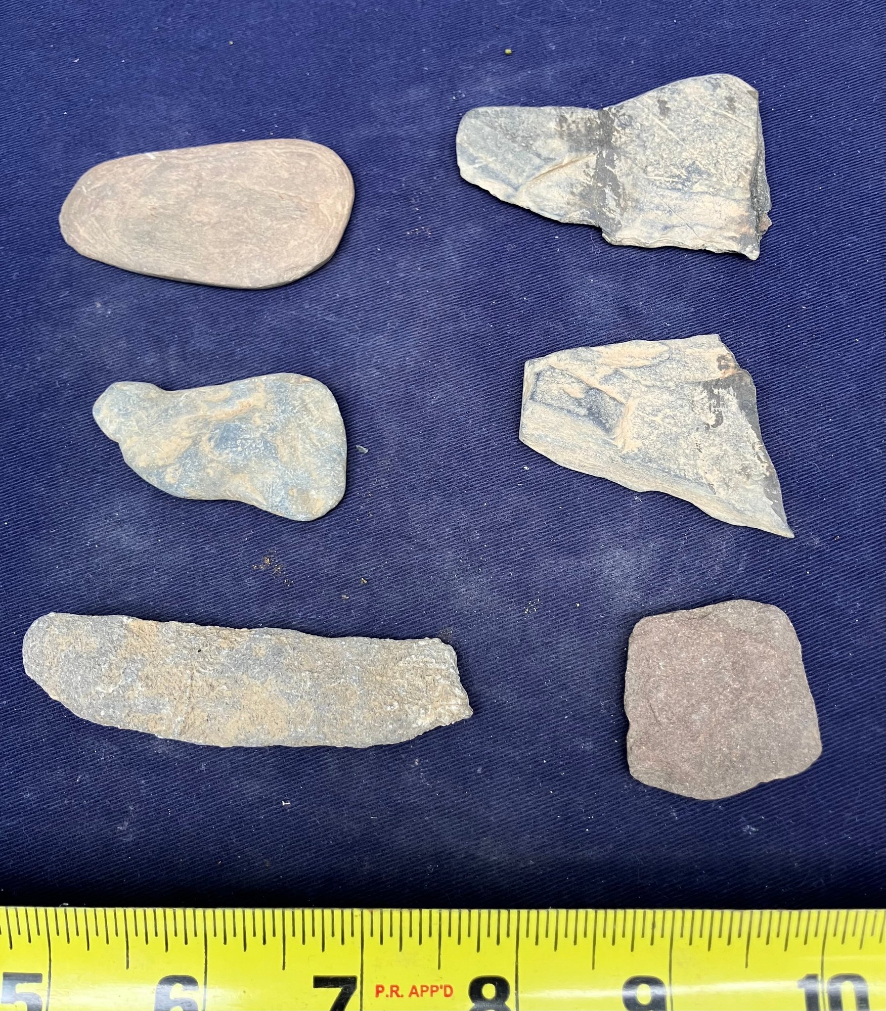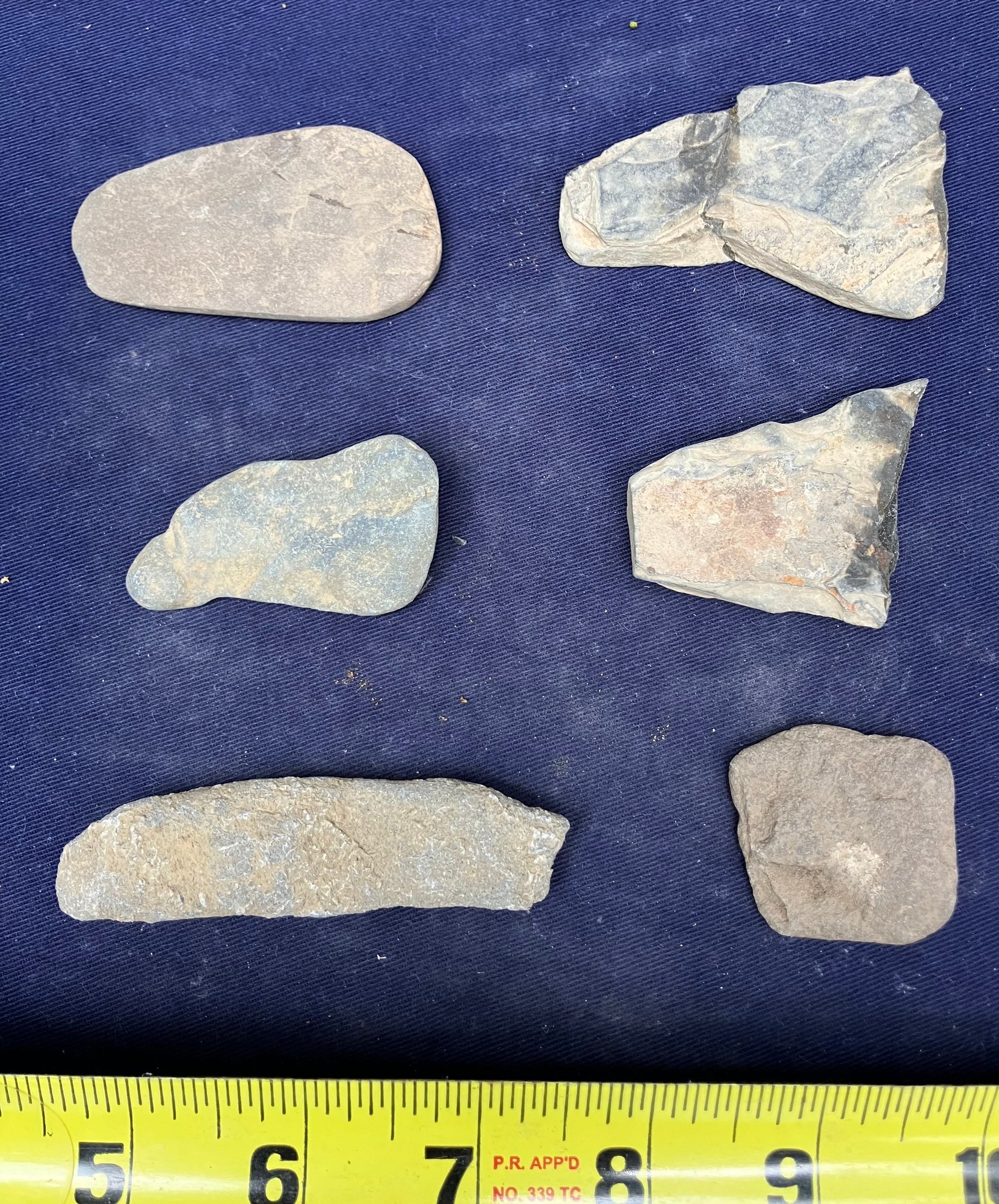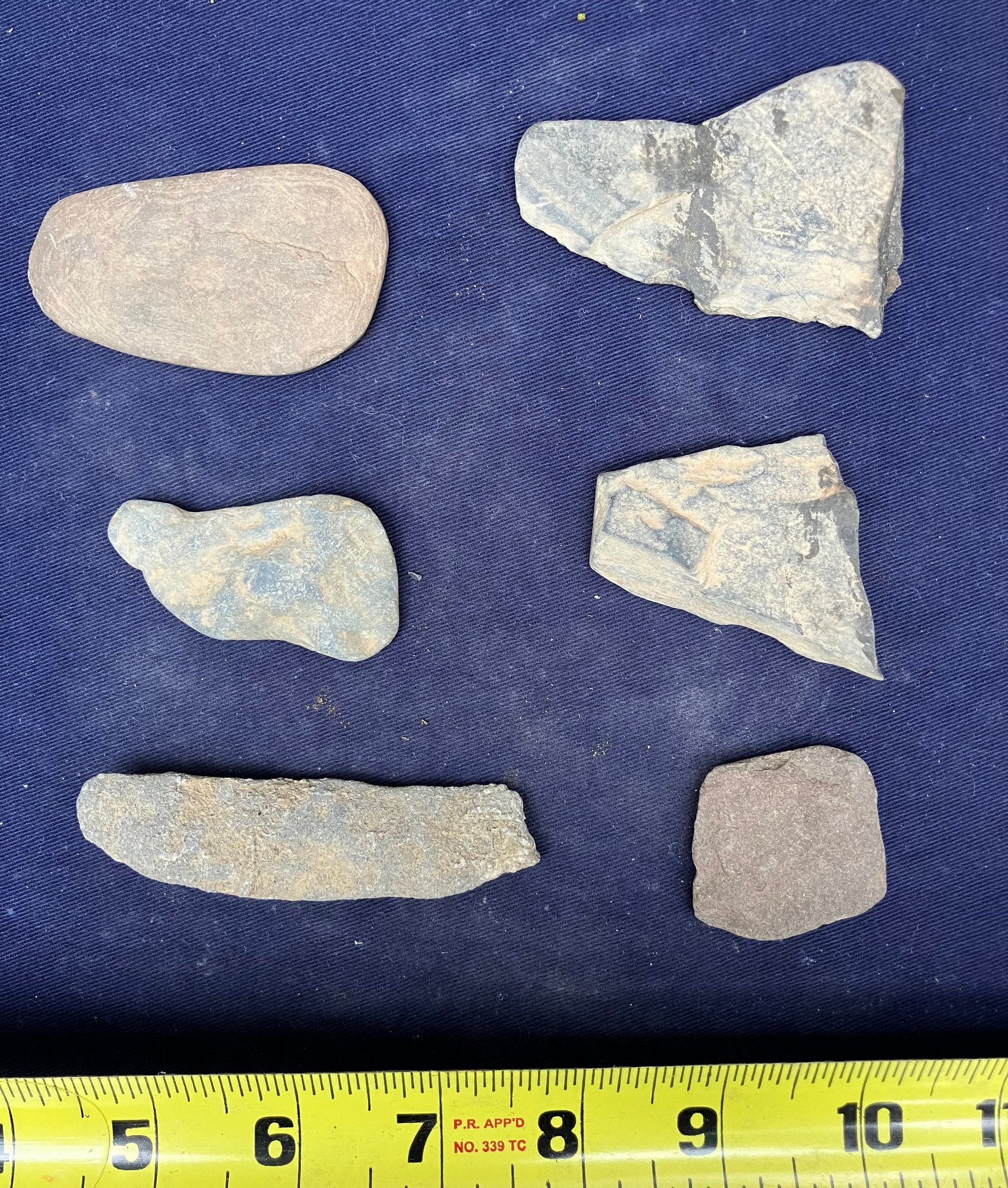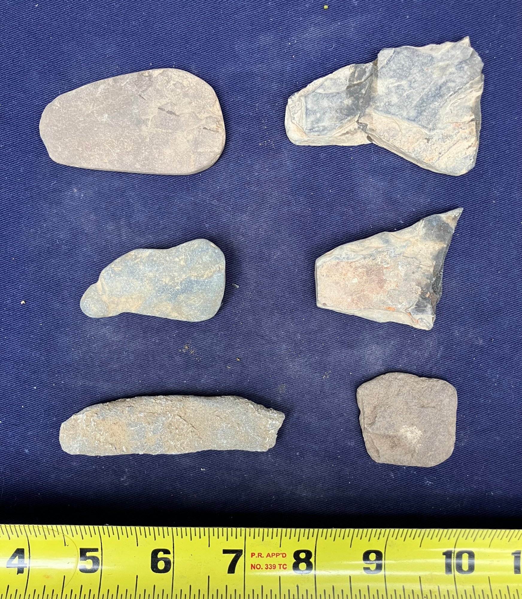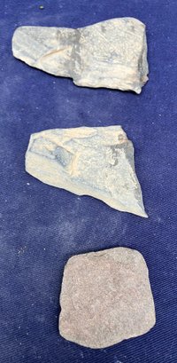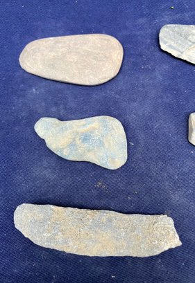 Found at a Native American dig site. Assortment of four sharpening and grinding tools and one large broken knife blade.