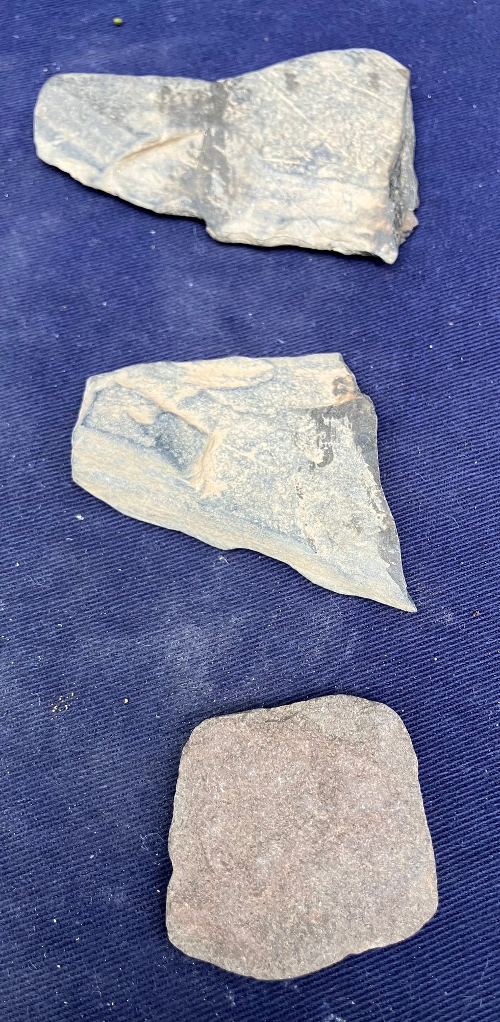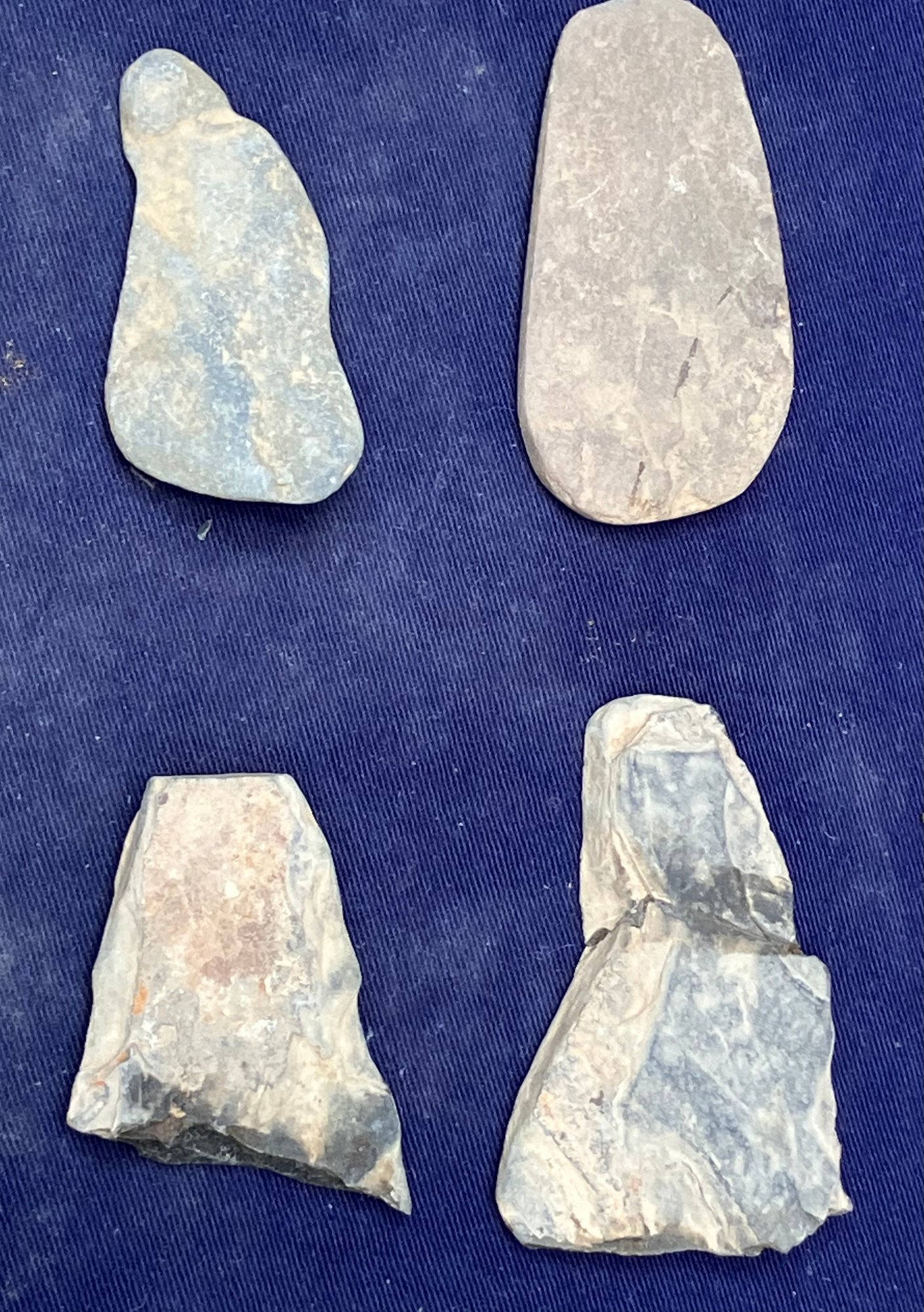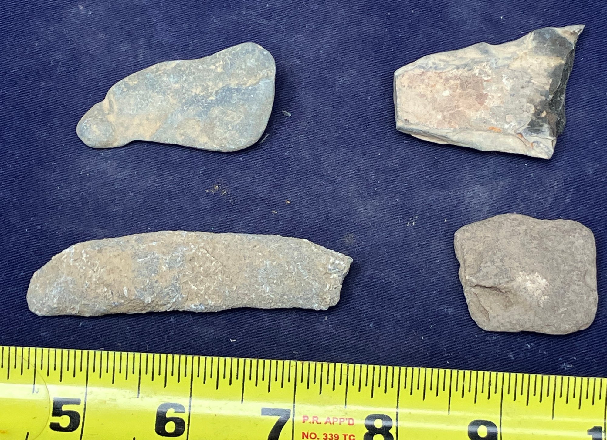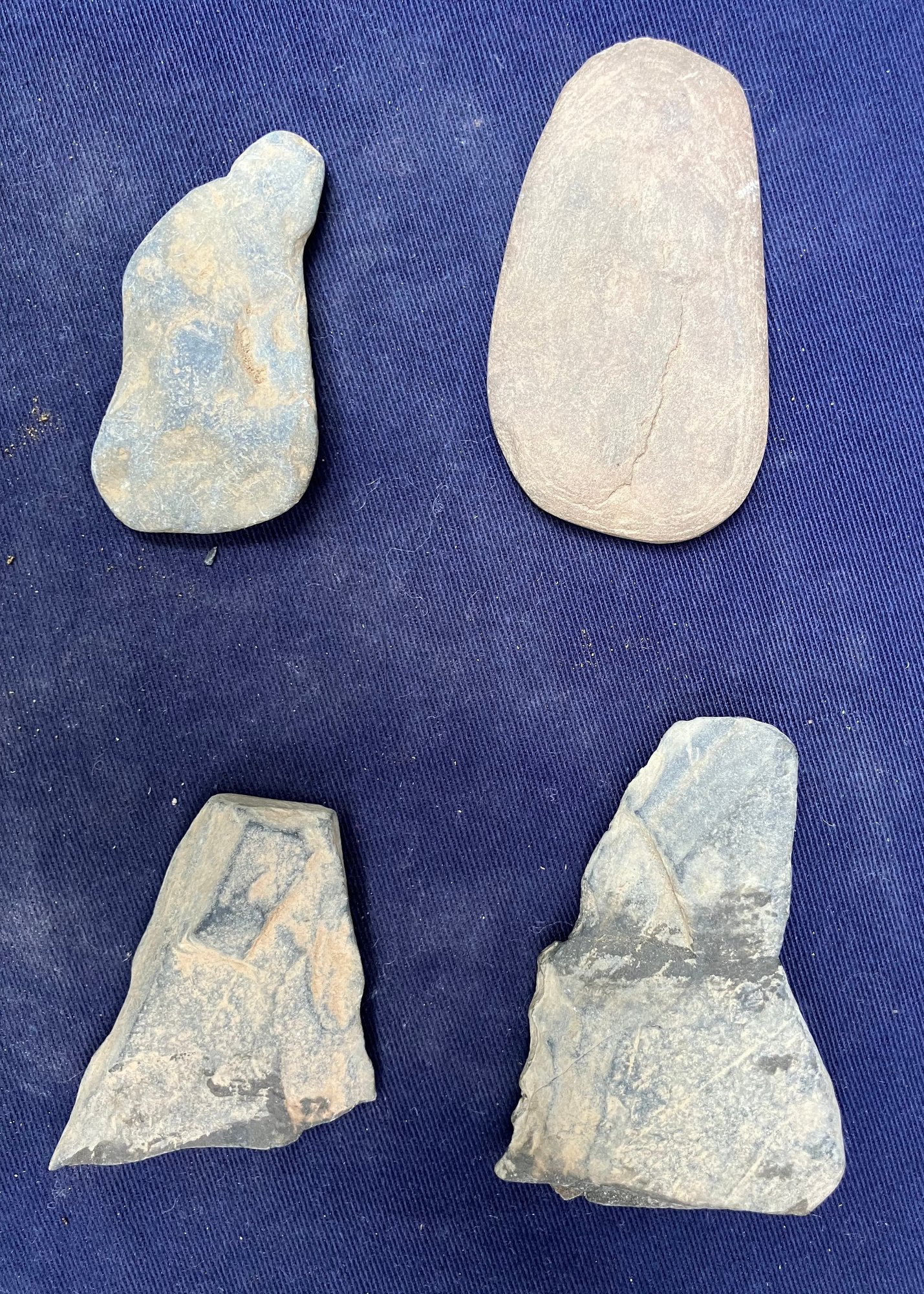 Found at a Native American dig site. Assortment of four sharpening and grinding tools and one large broken knife blade.