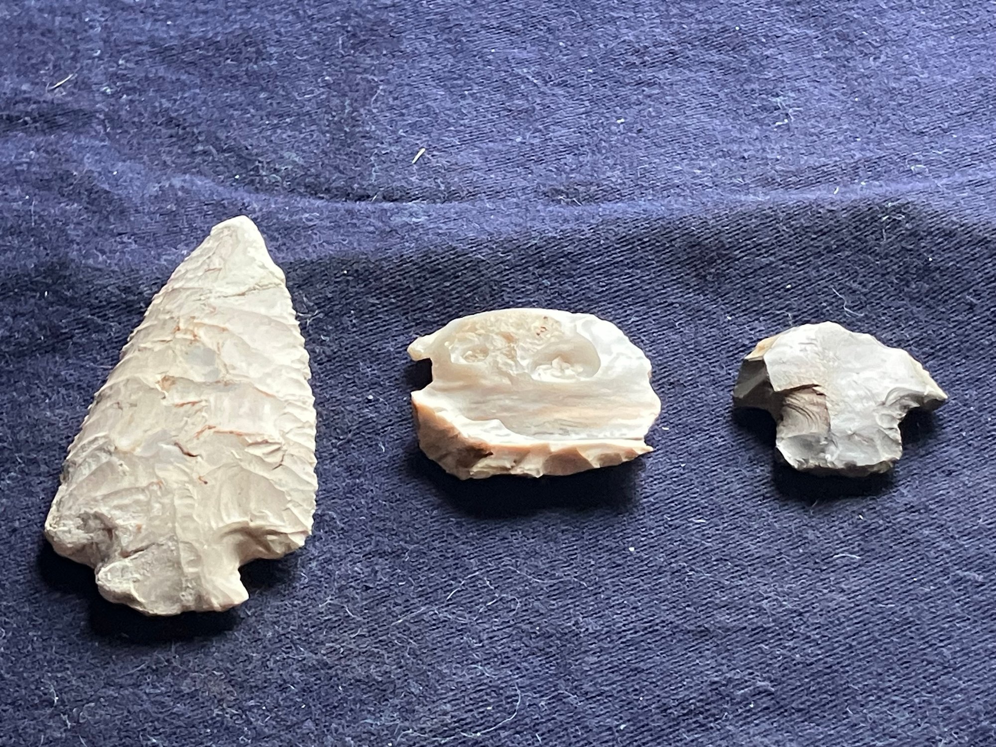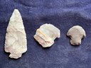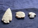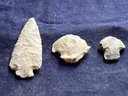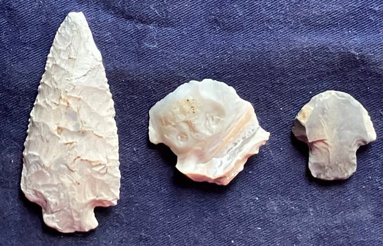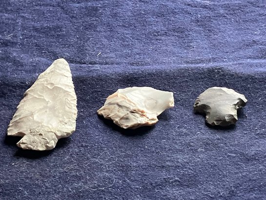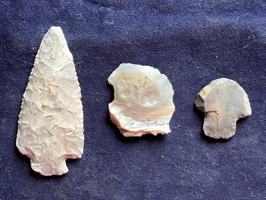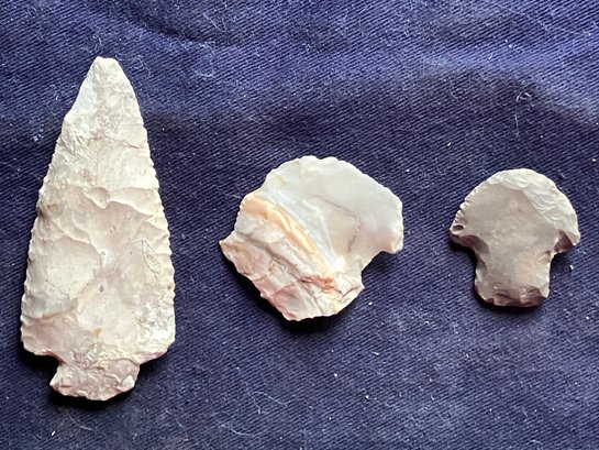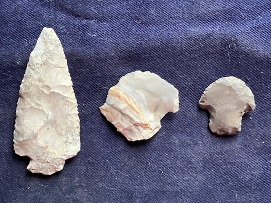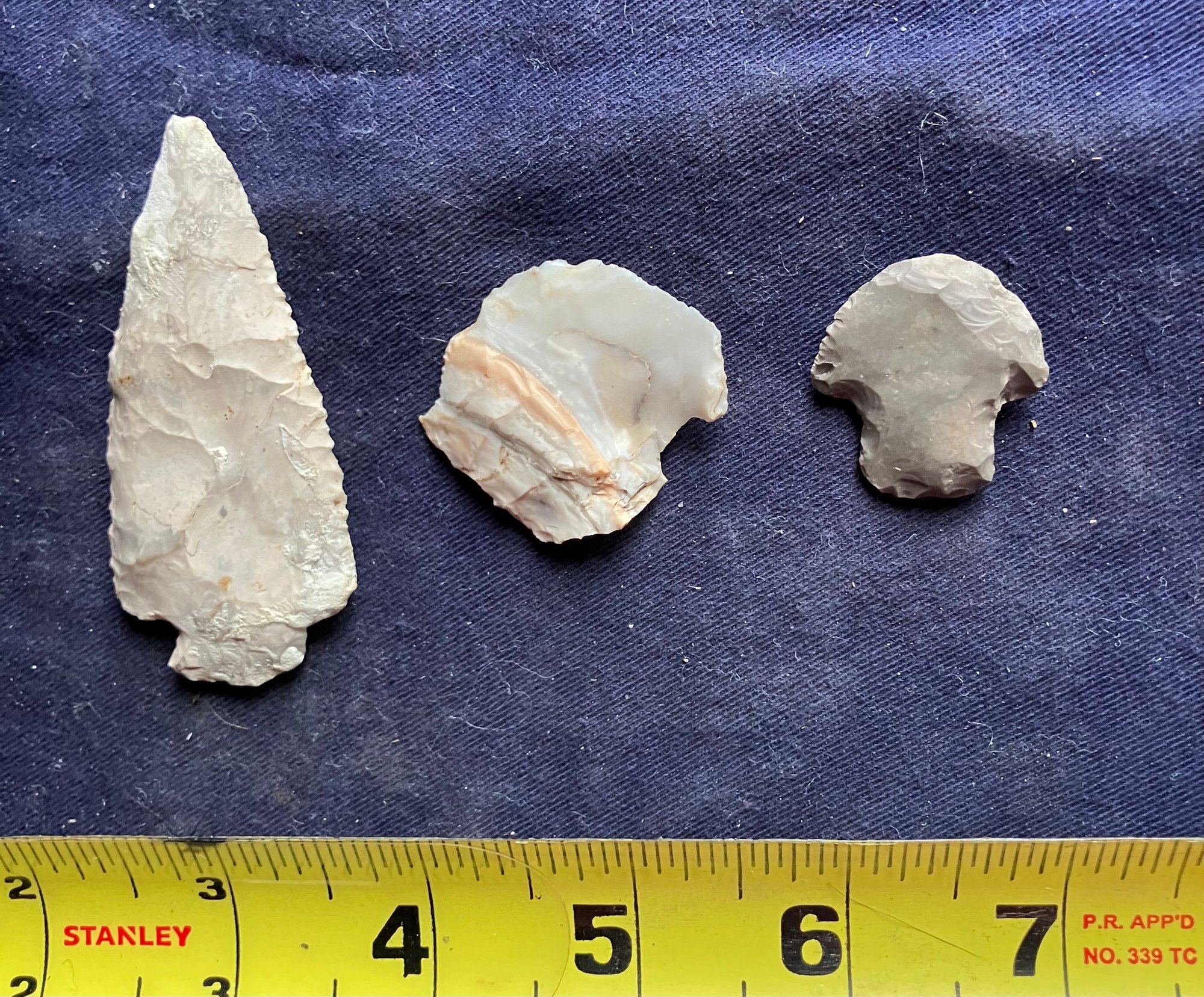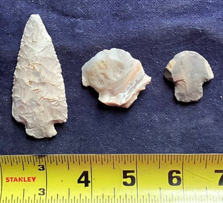 Found at a Native American dig site. Nice bi-facial blade and chirt arrowhead. The third one is a scraper/micro blade.