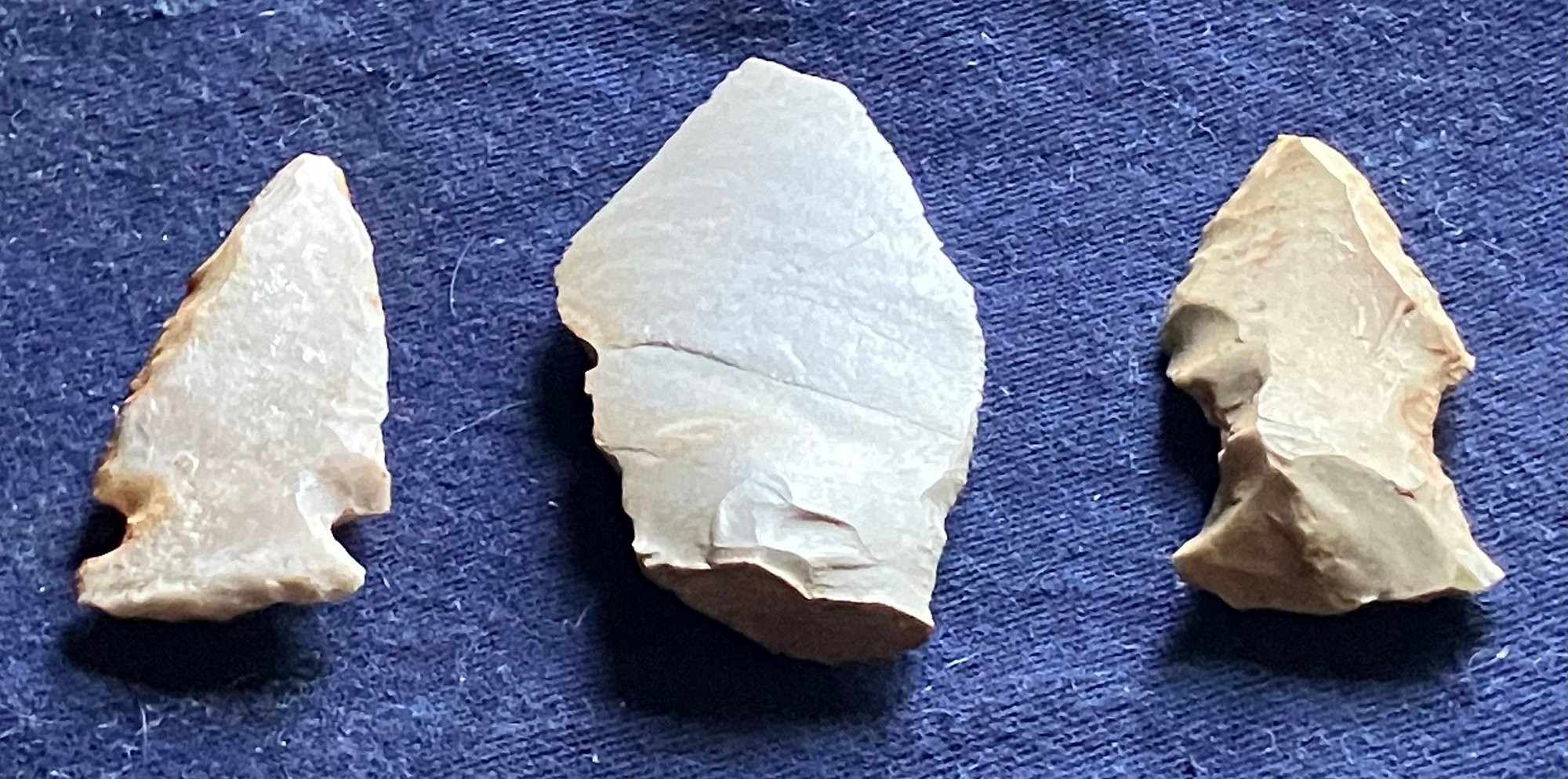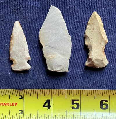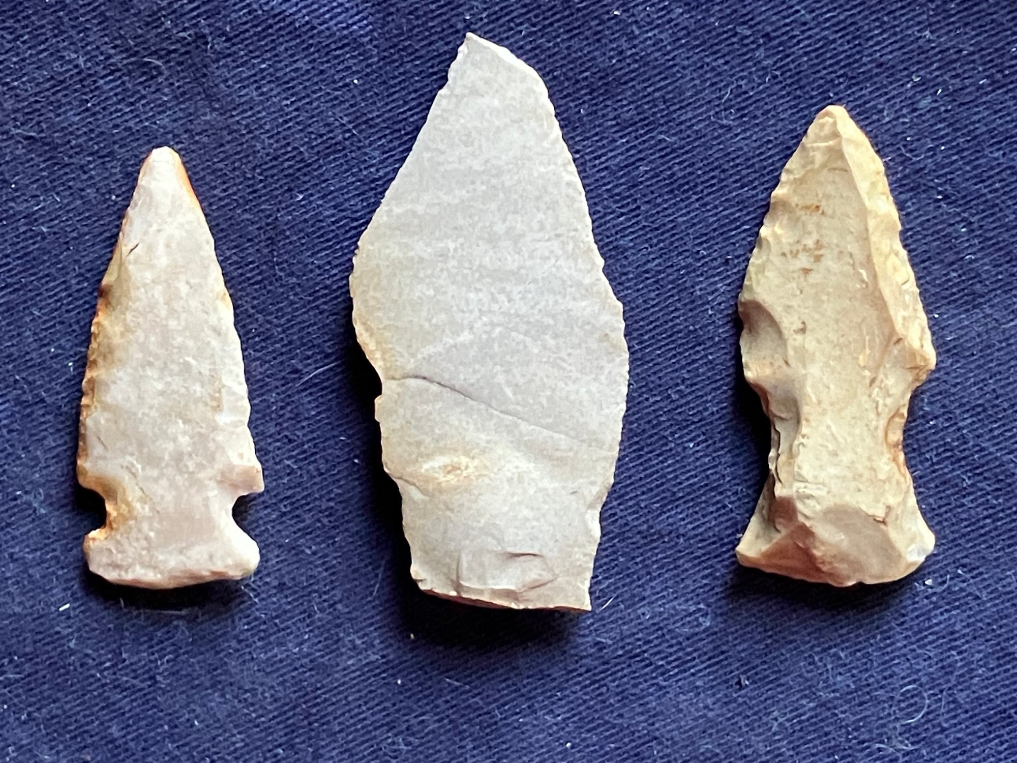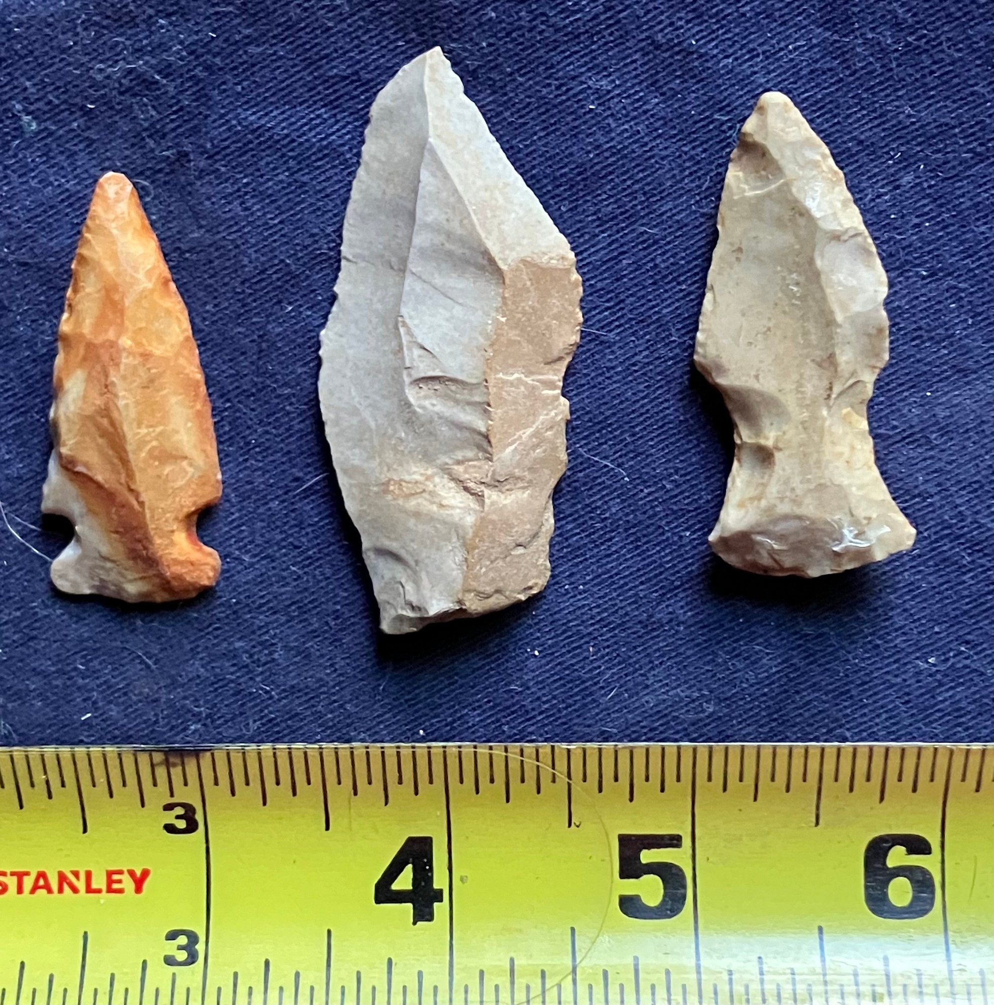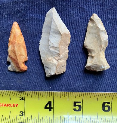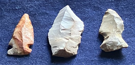 Found at a Native American dig site. Made of chirt. Two complete projectile points and one bi-facial cutting blade.