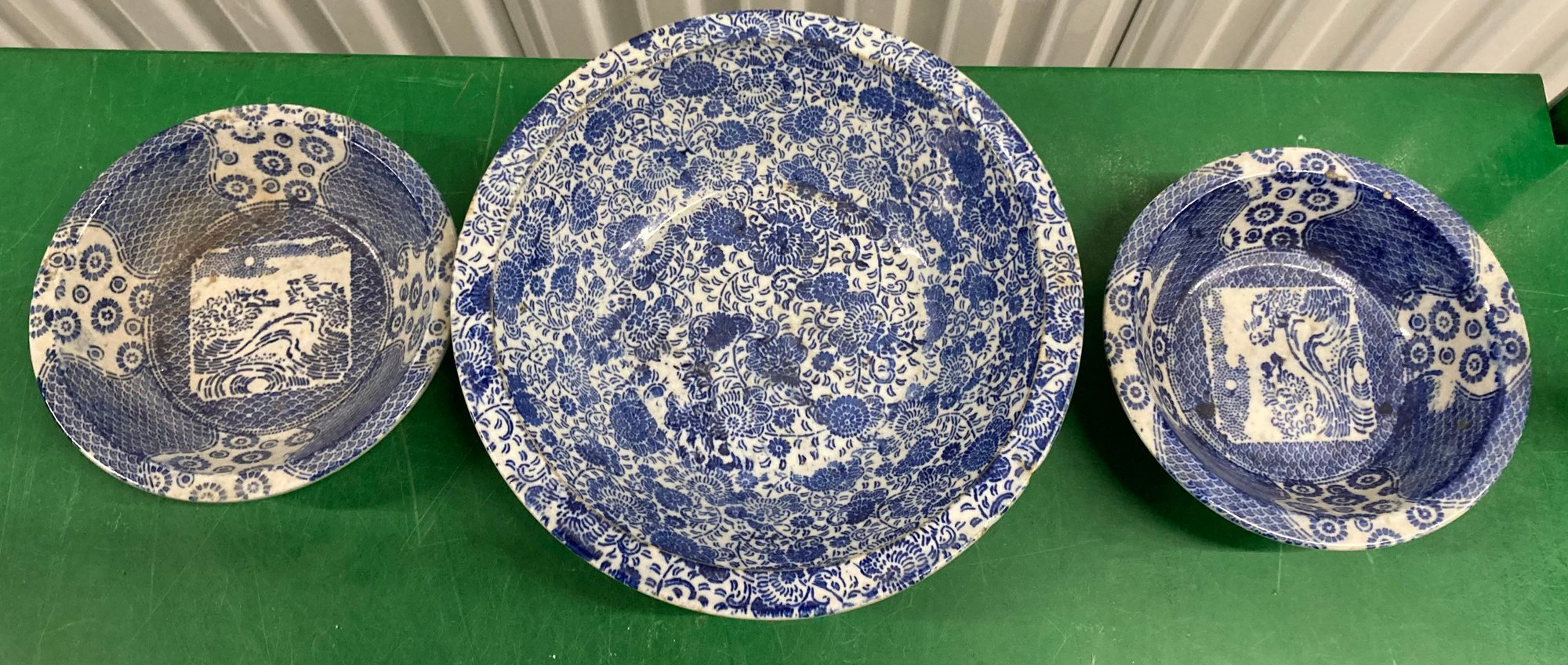 Assortment Of Three Blue And White Oriental Bowls. Dimensions are: 11” round and (2) are: 7 1/2” round. Some discoloration. Fair to good condition.