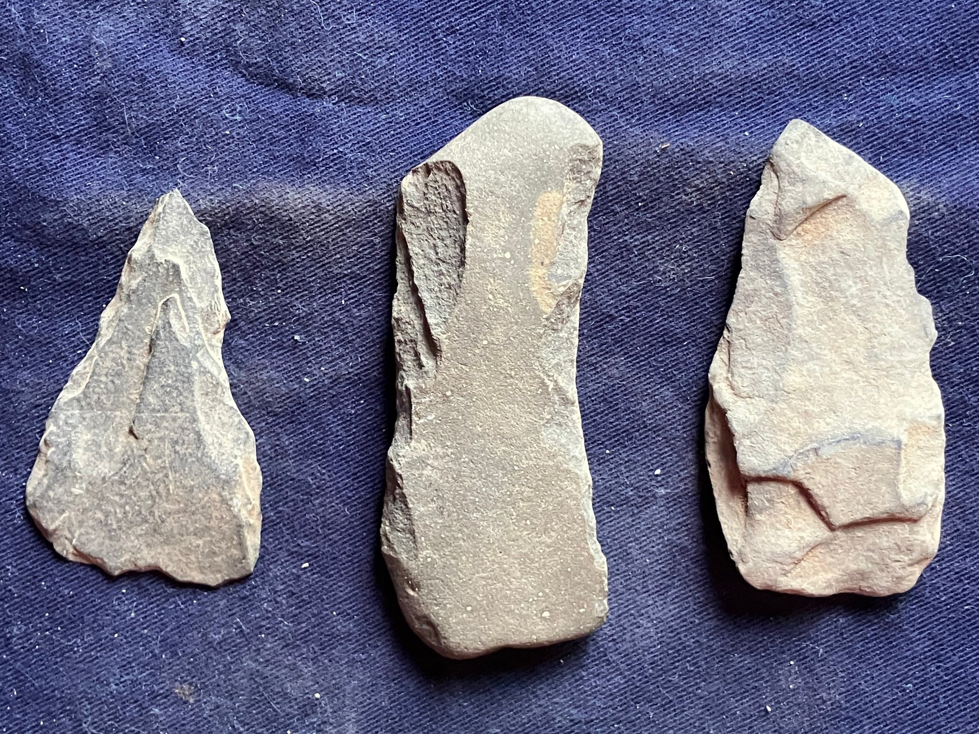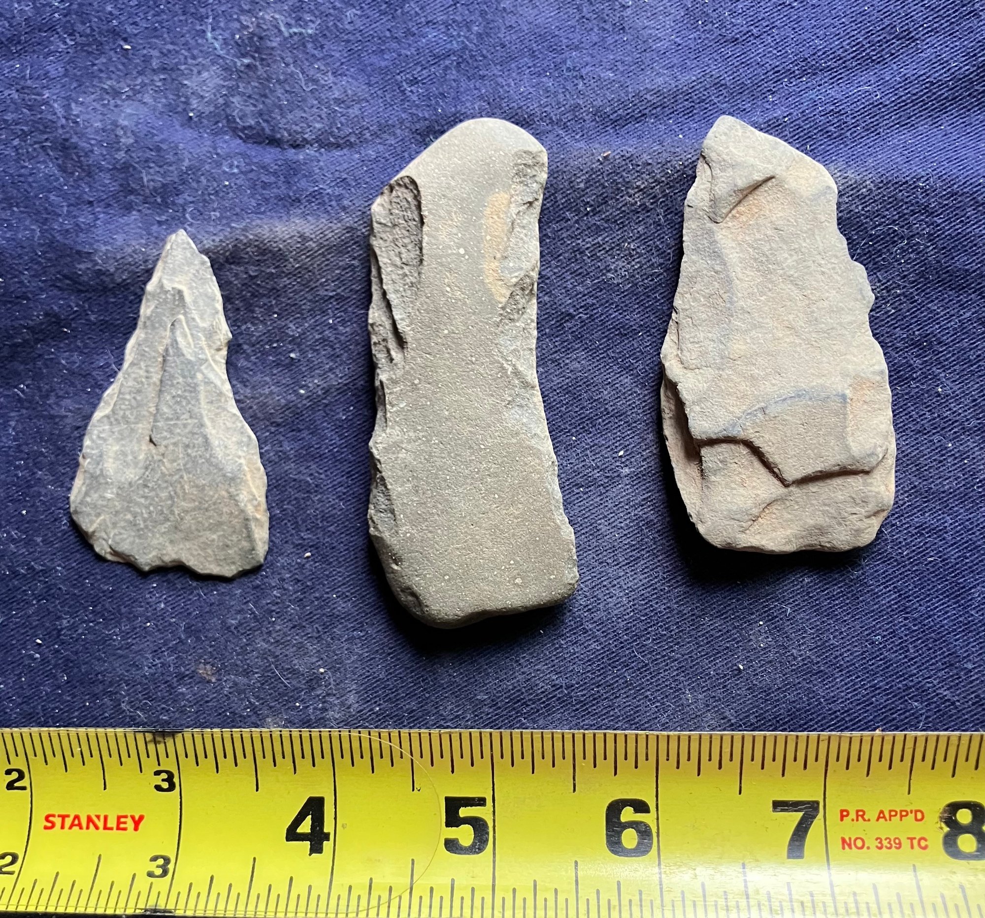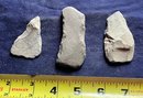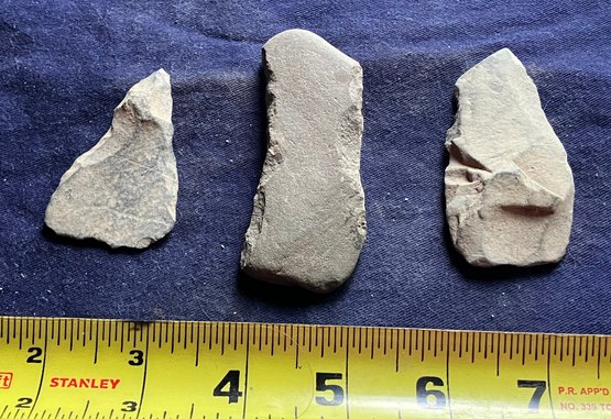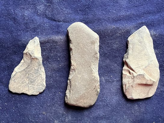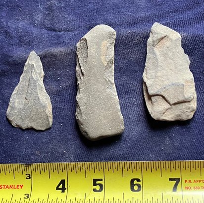 Found at a Native American dig site. One is a scraper that has parallel lines scratched into one side. Another is some sort of bi-facial blade and the third is probably some sort of grinding or sharpening stone that is smooth on both flat sides but is knapped on both edges.