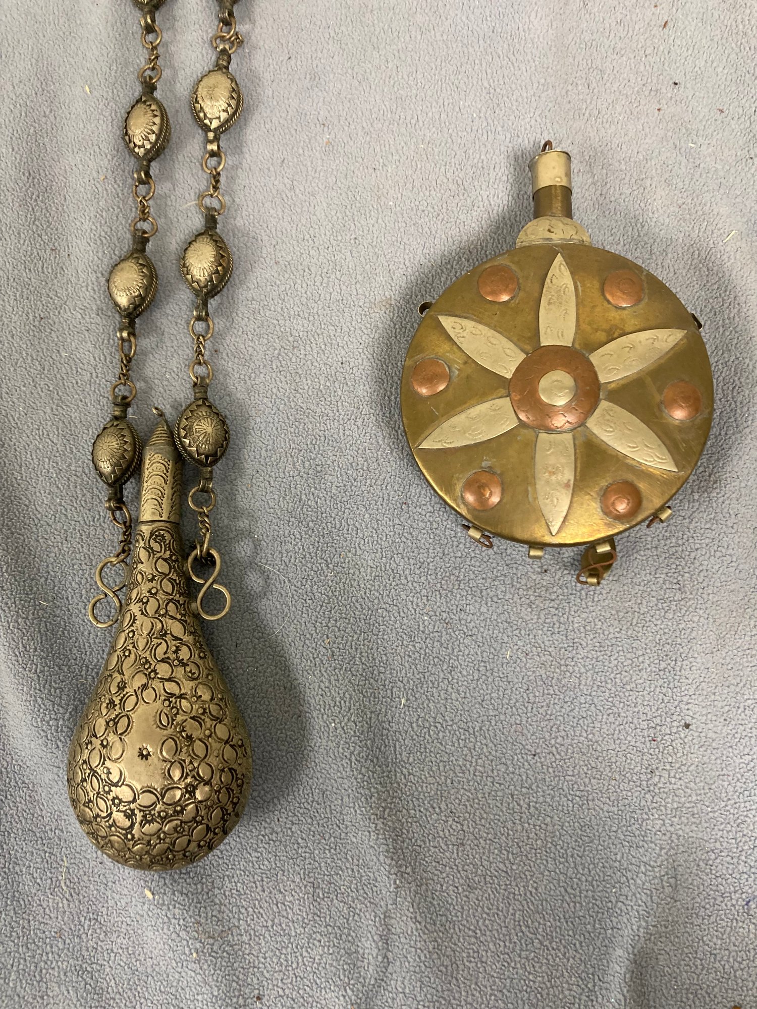 Assortment of Tibetan Jewelry. Dimensions of the long flask are: 6” long x 2 1/2” wide x 1 1/4” thick. Dimensions of the long flask with chain are: 13 1/2” long. The balls on the chain are: 1” long. Dimensions of round flask are; 3 3/4” round x 5 1/2” long x 1” thick. Condition: See photos.