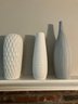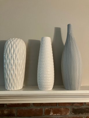 Assortment of vases. Dimensions: 14 1/2” tall x 6” wide, 14 1/2” tall x 4 1/4” wide and 18 1/2” tall x 5 1/2” wide. Good condition.