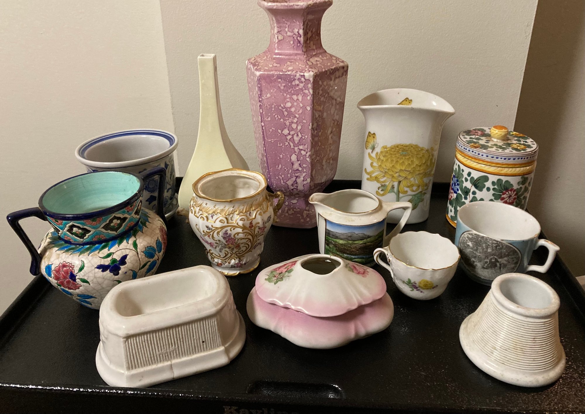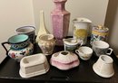 Assortment Of Vases, Cups, Jars And More. Pink box was repaired. Fair to good condition.