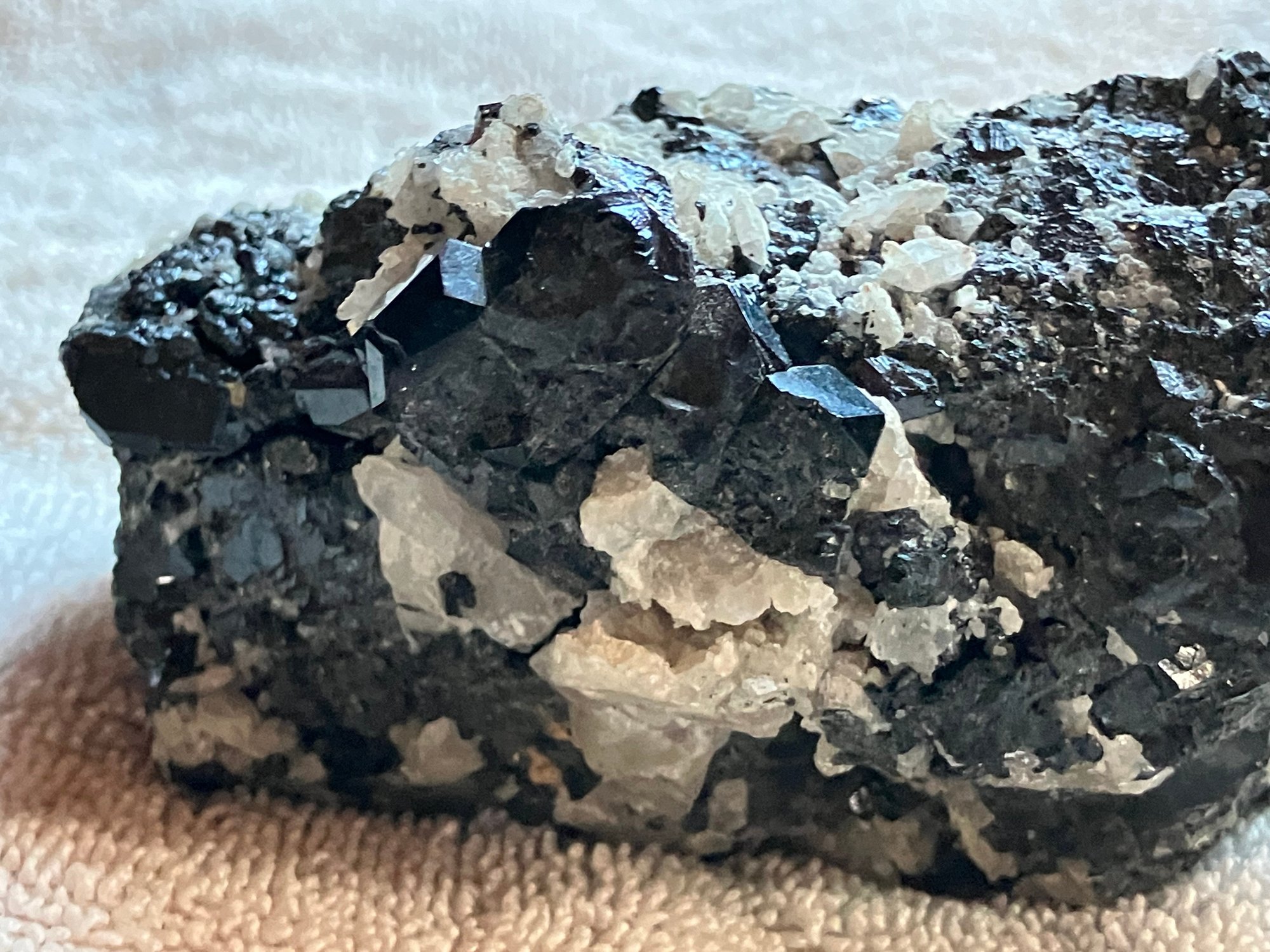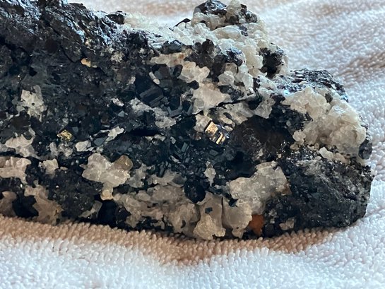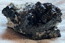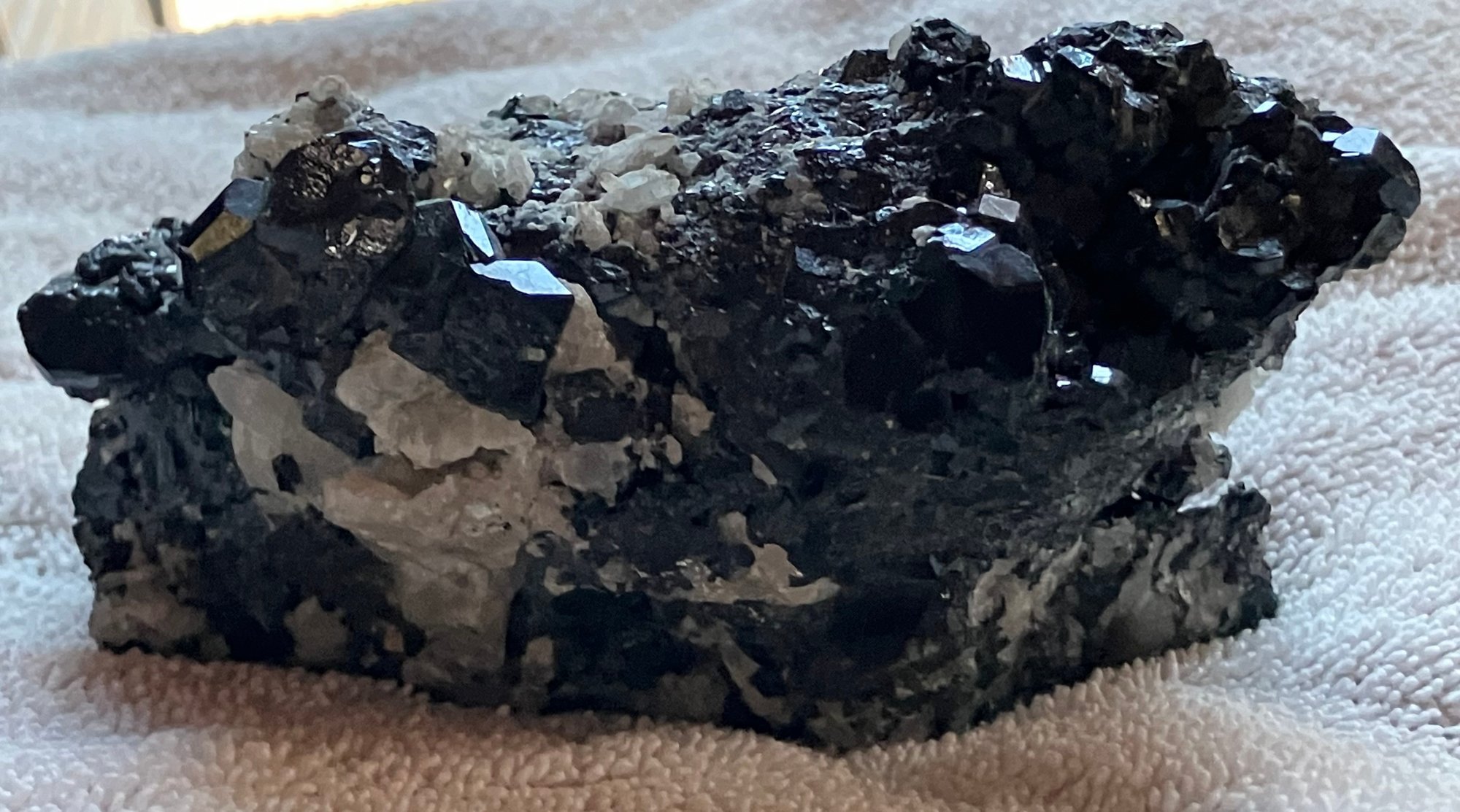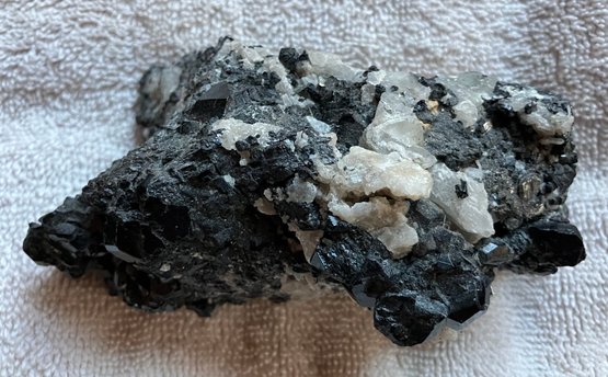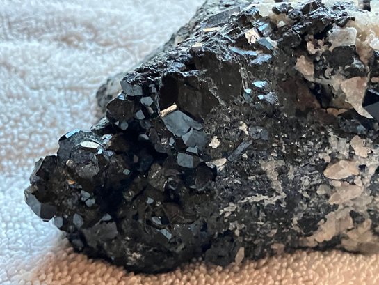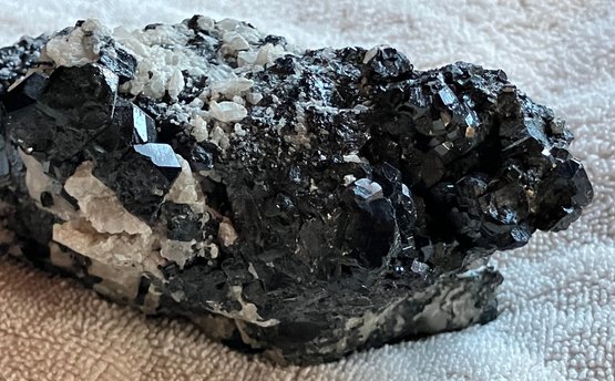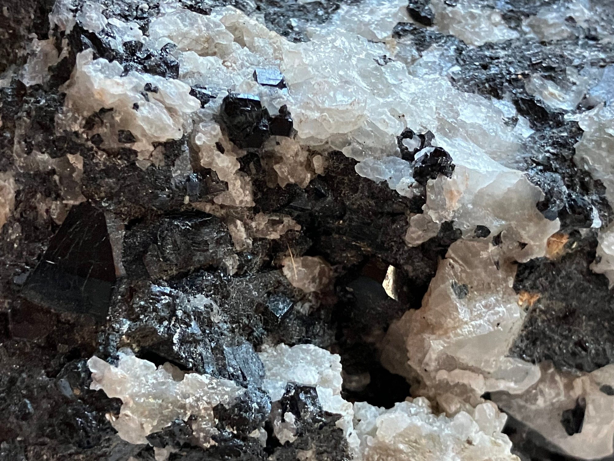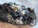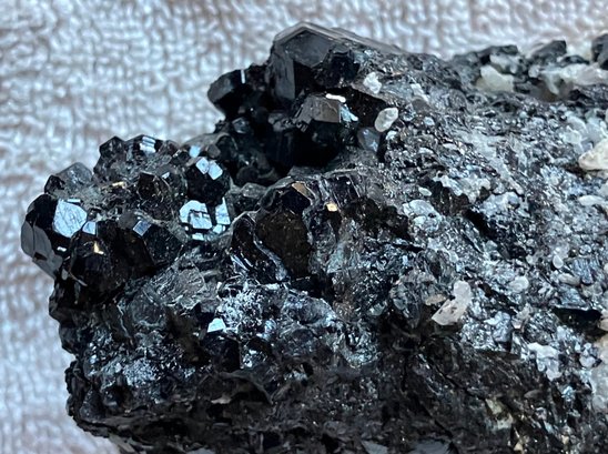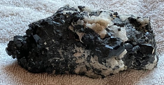 Nice specimen of black andradite garnet in quartz matrix. It has a small cube of galena.