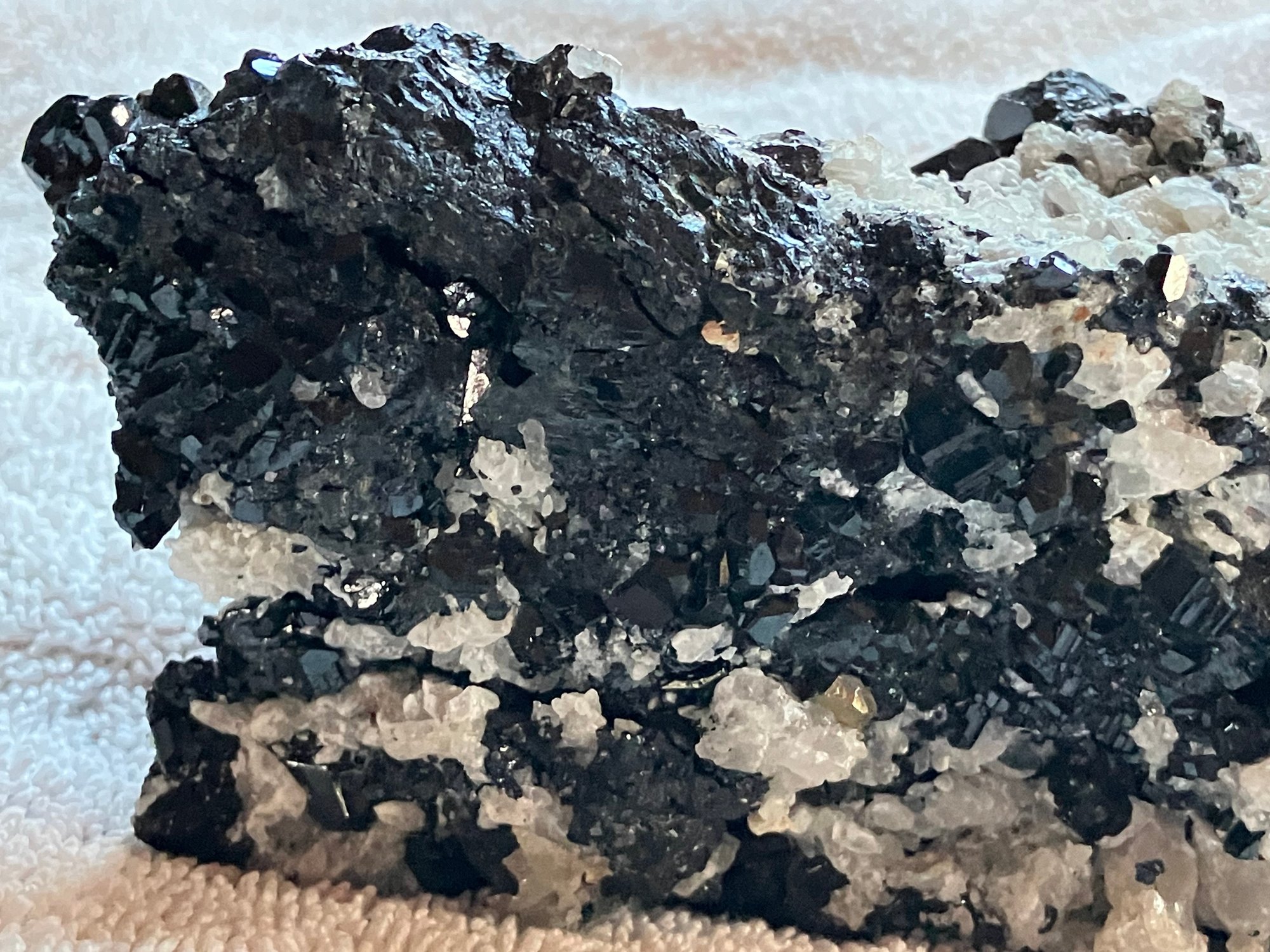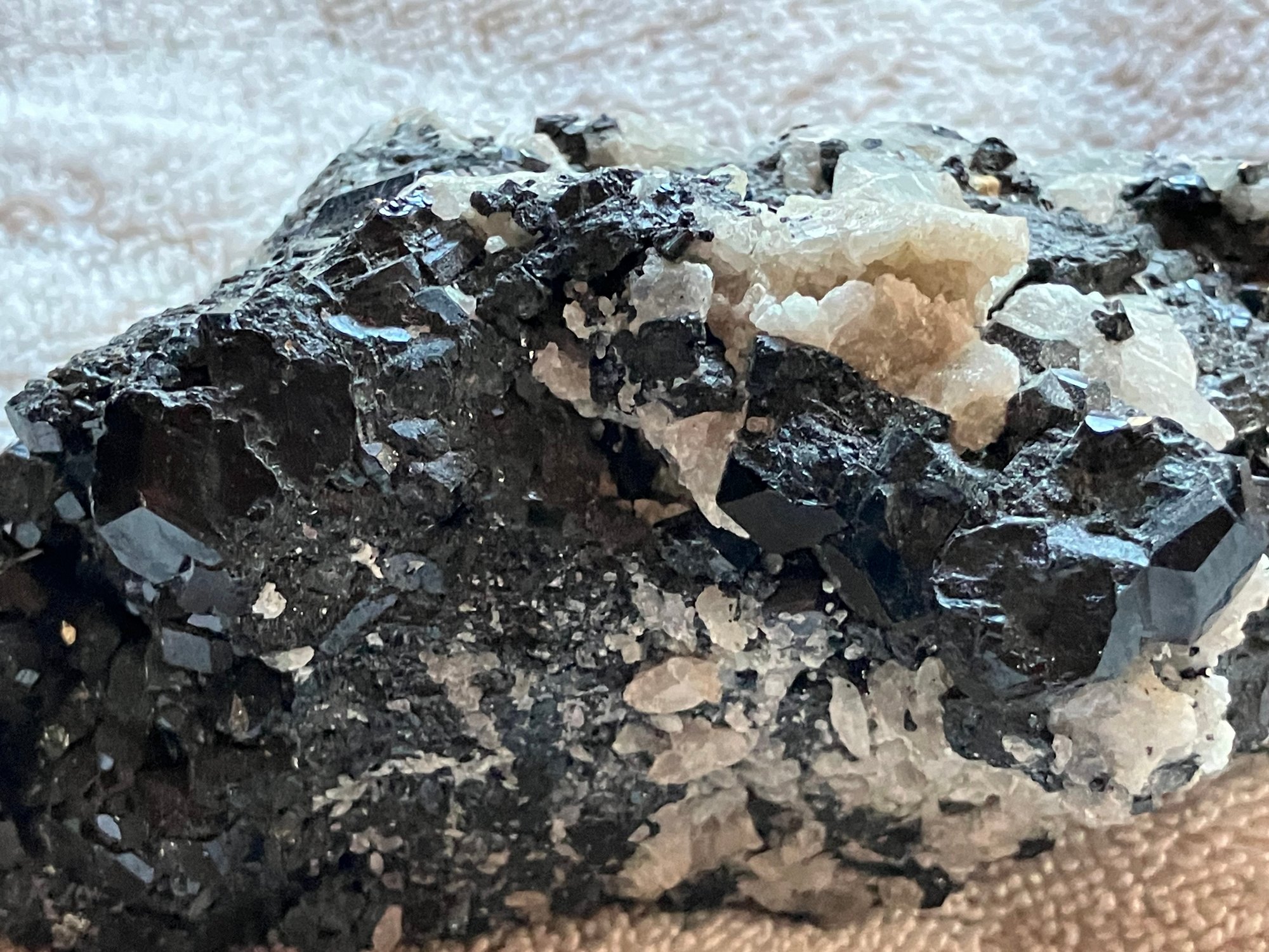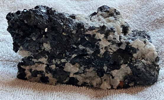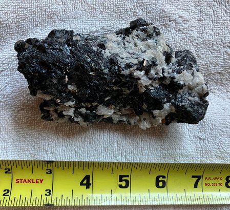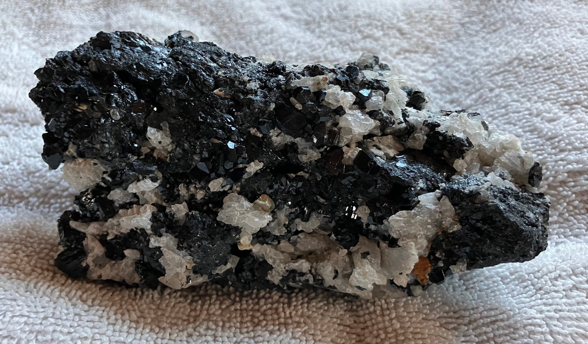 Nice specimen of black andradite garnet in quartz matrix. It has a small cube of galena.