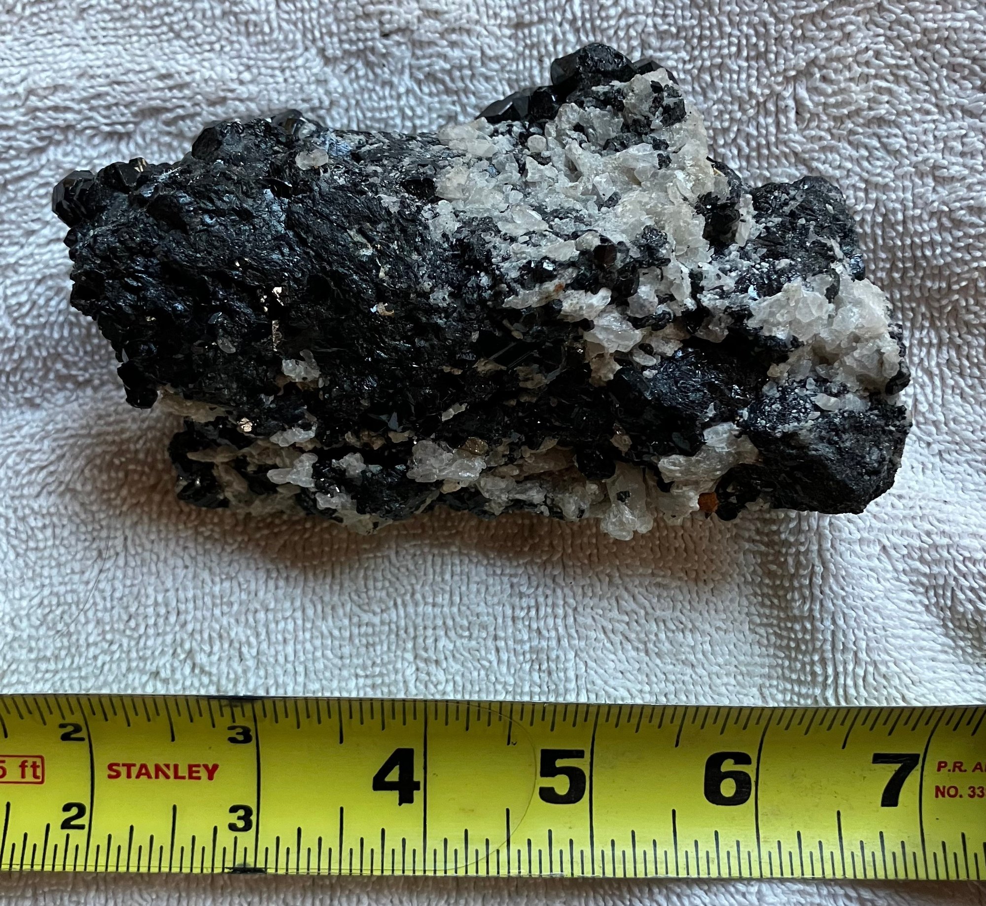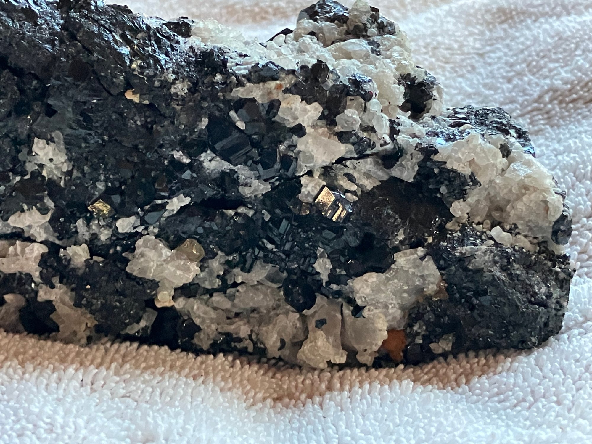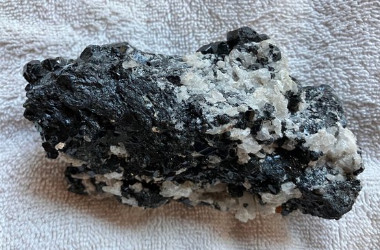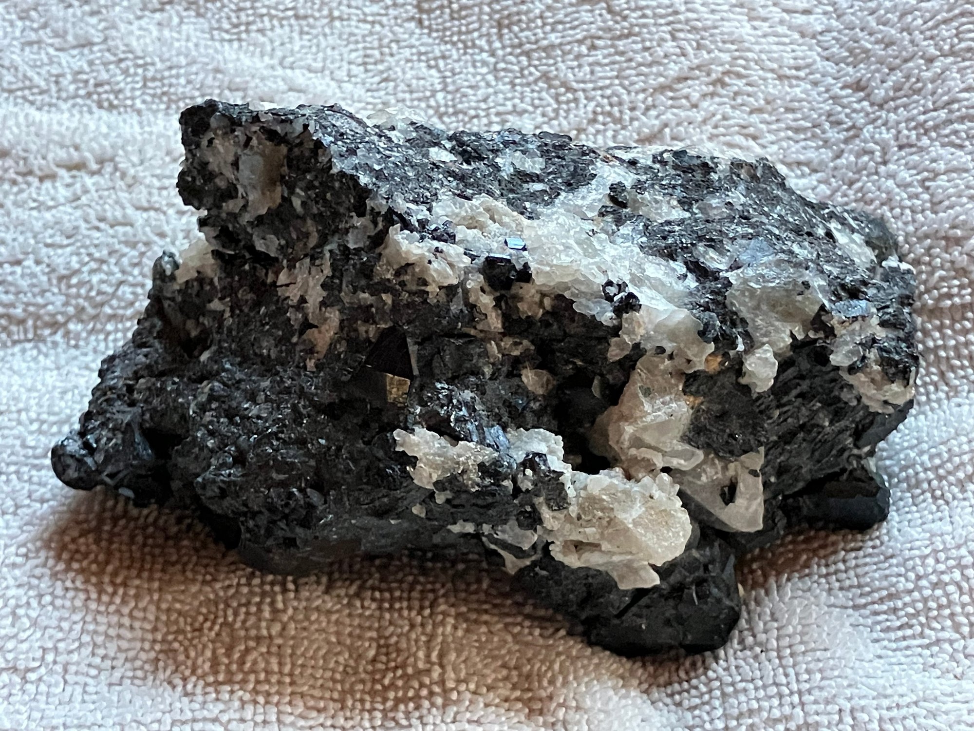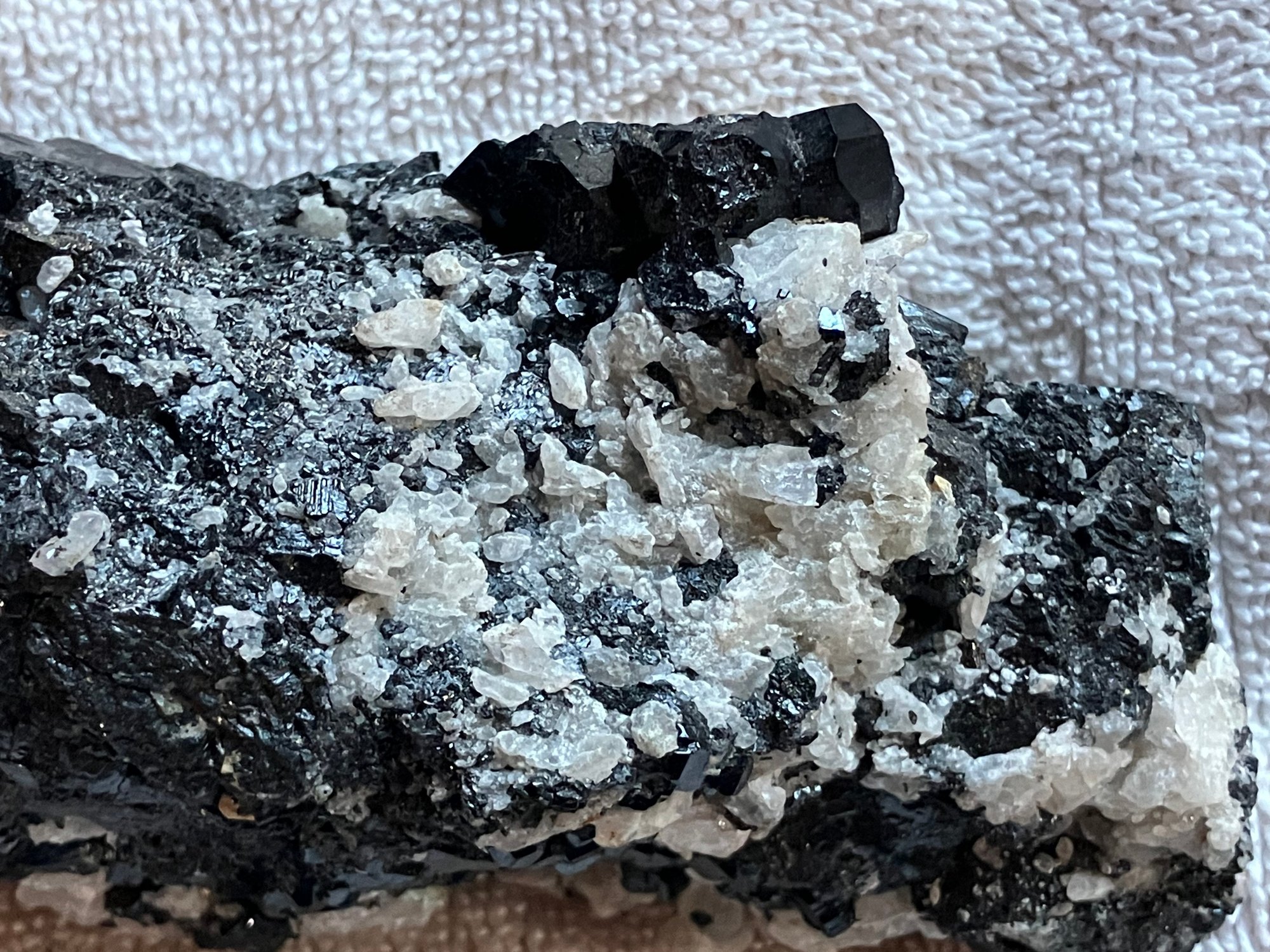 Nice specimen of black andradite garnet in quartz matrix. It has a small cube of galena.