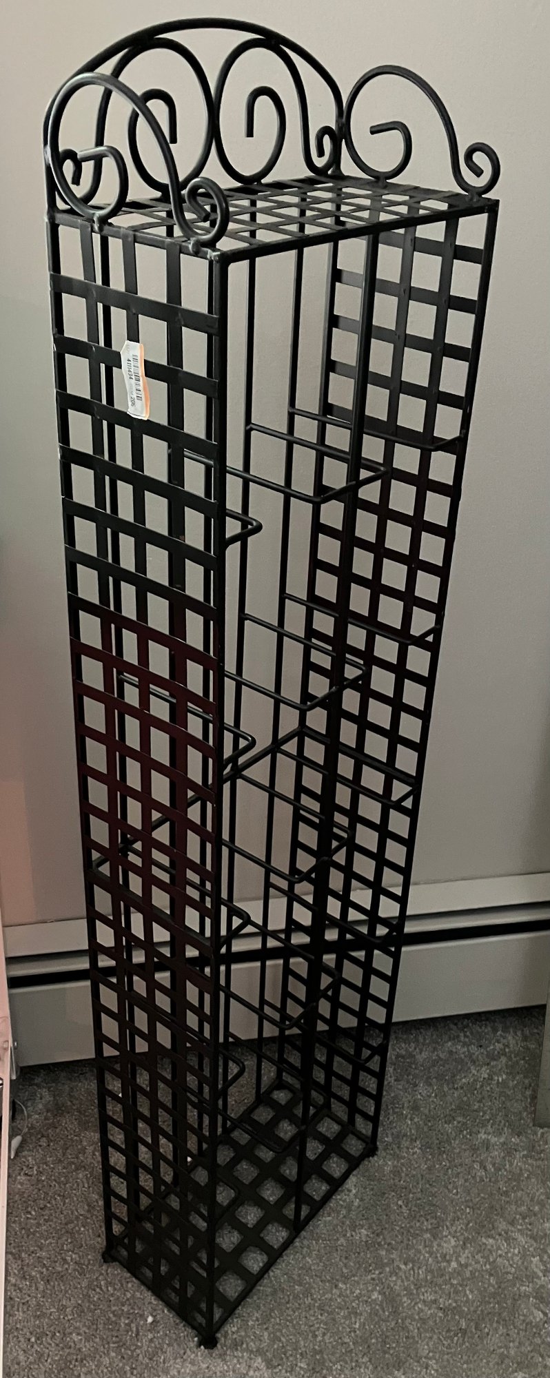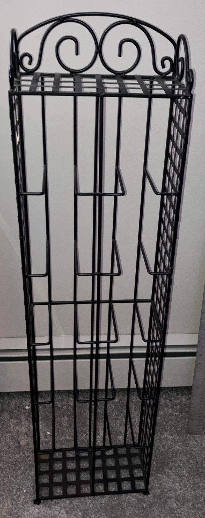 Black metal wire shelf. Dimensions: 43” tall x 11” wide x 6” deep. Good condition.