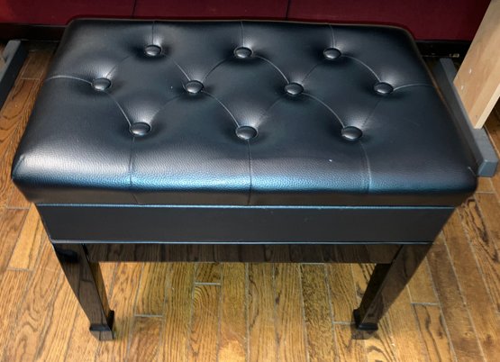 Black tufted seat with interior compartment. Dimensions: 18 3/4” tall x 22” wide x 14” deep. Very good condition.