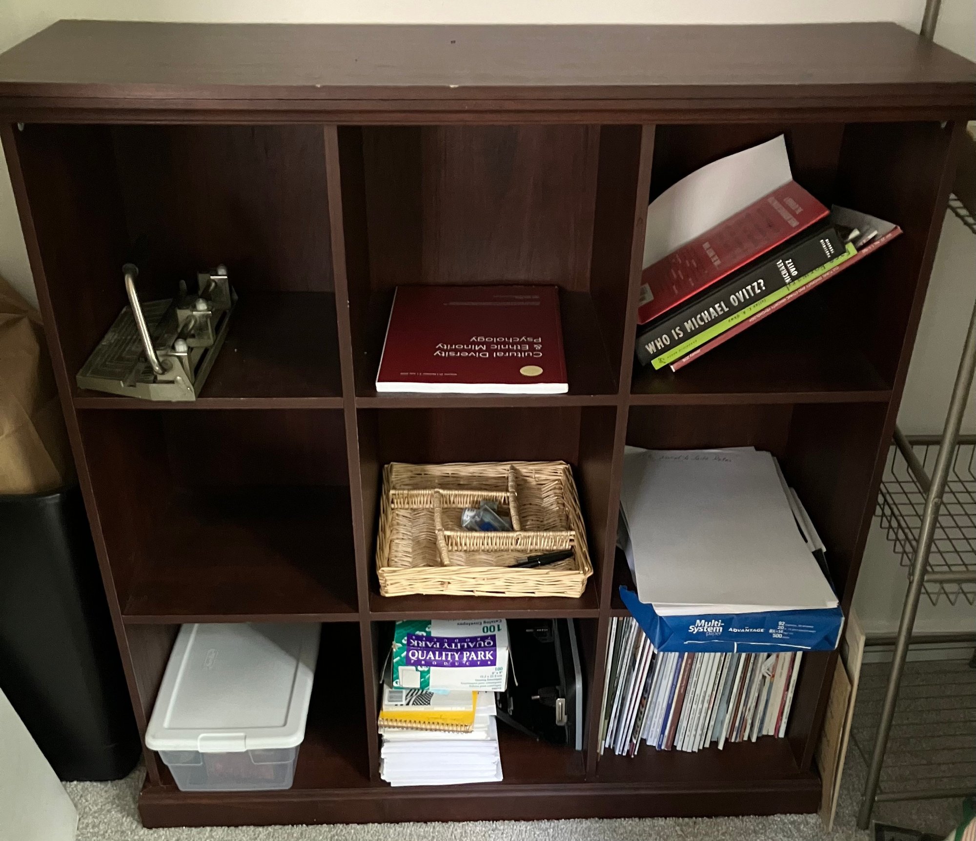 Brown shelving unit bookcase. Dimensions: 39 1/2” tall x 7 1/2” wide x 12 3/4” deep. Good condition. **THE ITEMS ON THE SHELF ARE NOT INCLUDED WITH THIS LOT. IT IS JUST THE SHELVING UNIT FOR THIS LOT**.