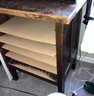 Brown wooden cabinet. There are no shelves. There is thick cardboard that is currently being used for shelving. Dimensions: 40” tall x 32” wide x 25” deep. Fair condition.
