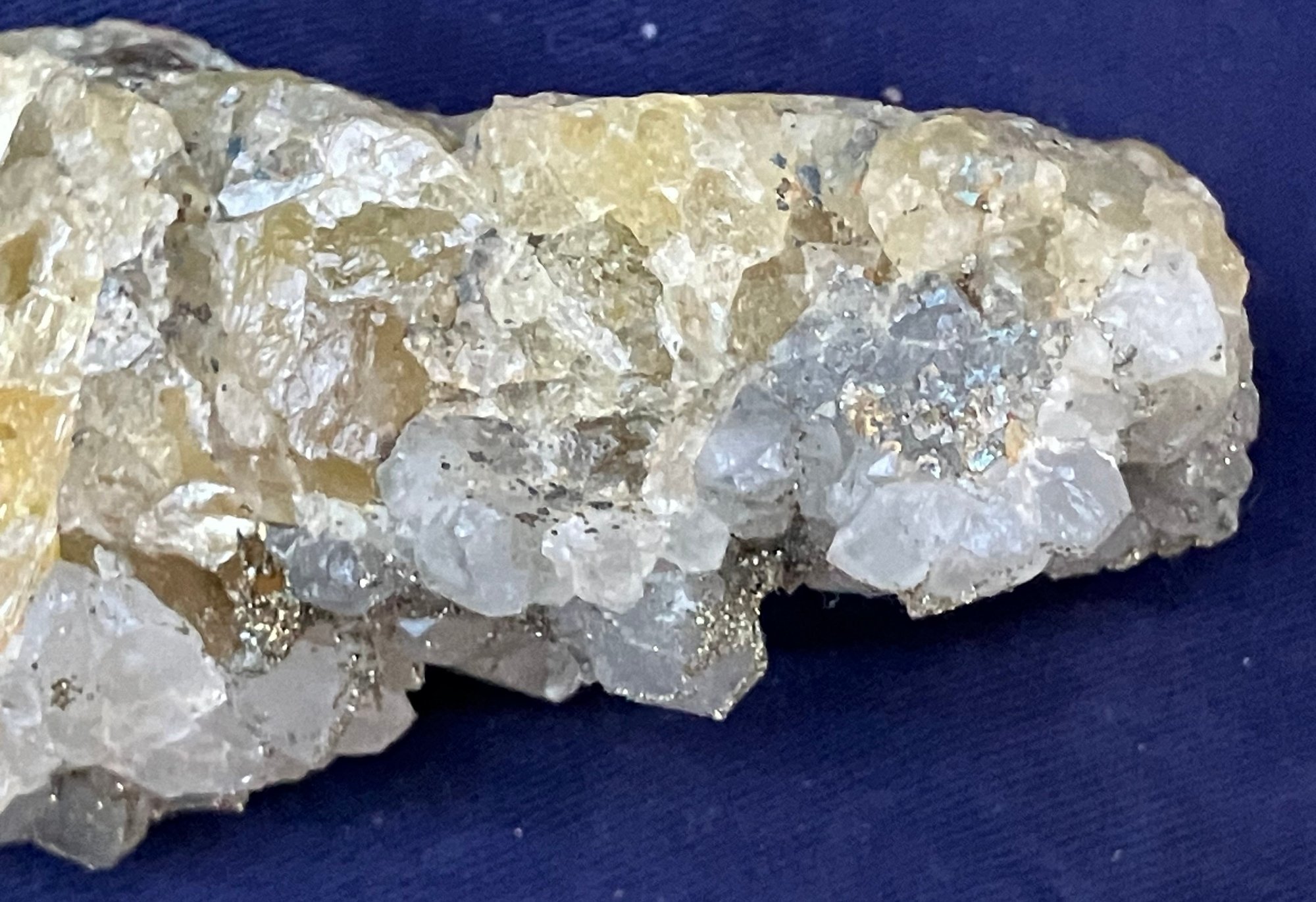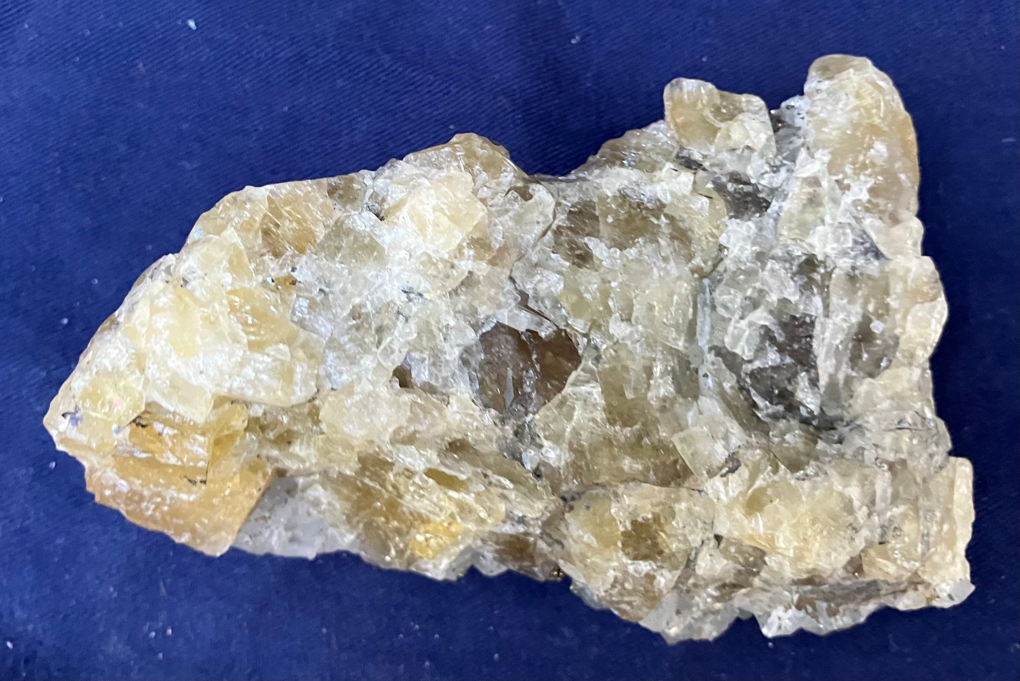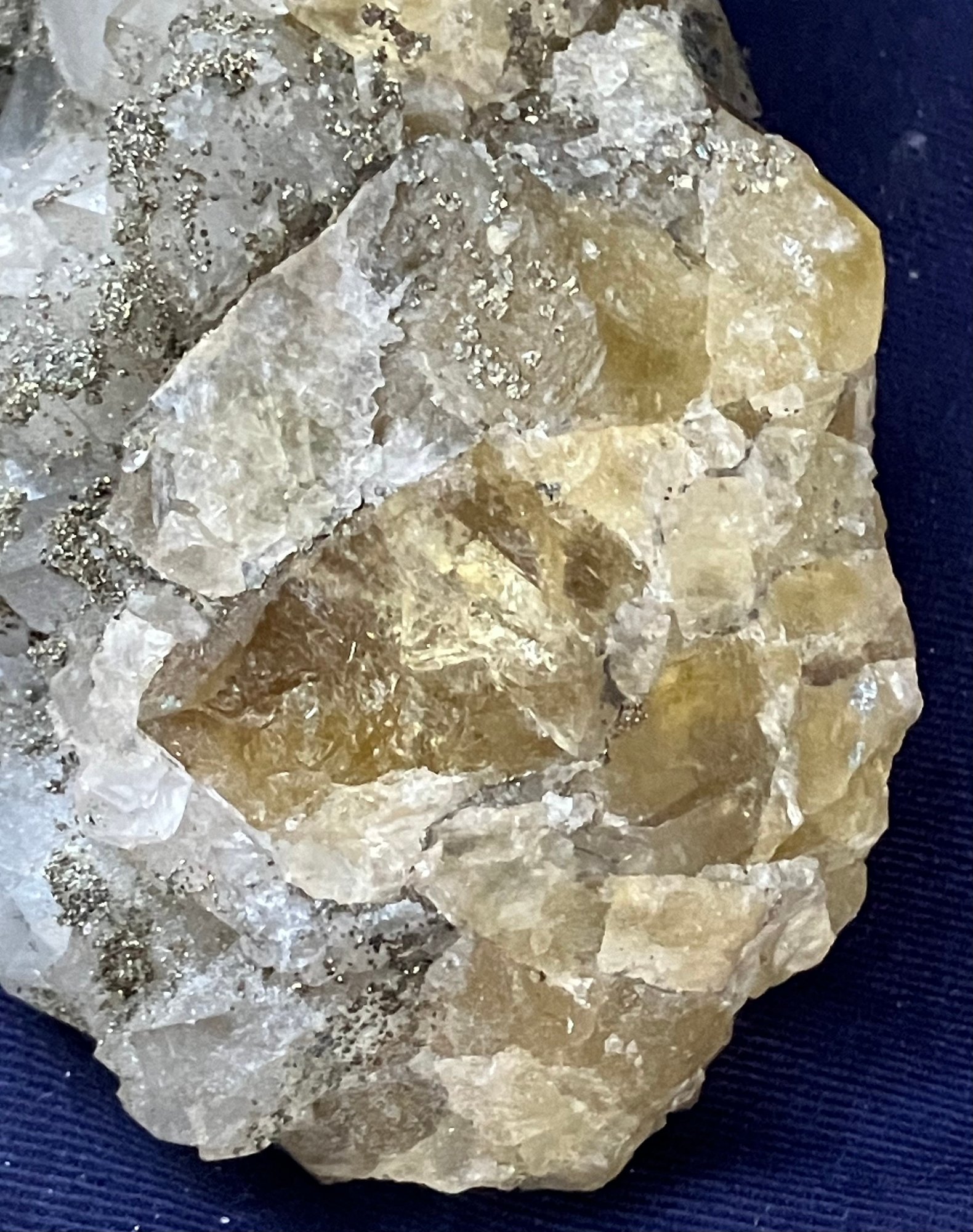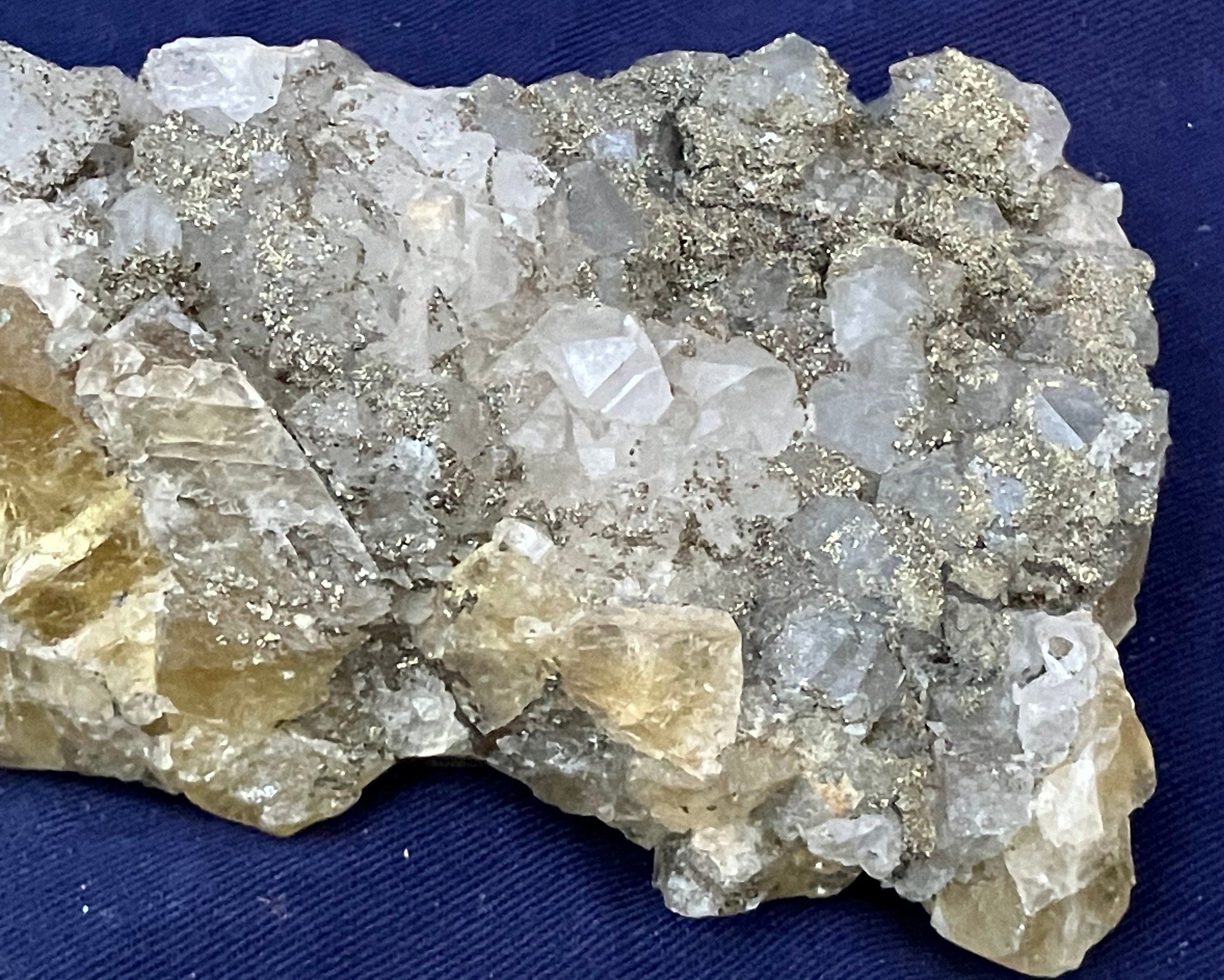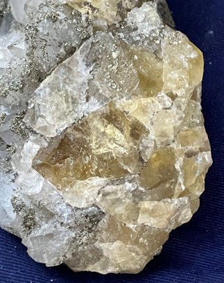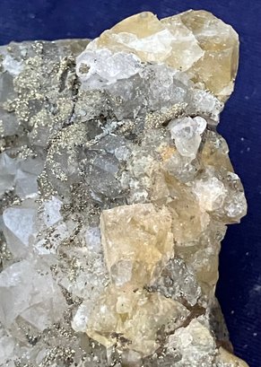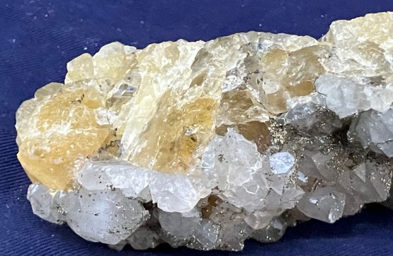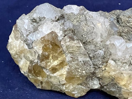 Beautiful combination specimen consisting of golden fluorite on one side and druzy golden pyrite covering quartz crystals. Itβs from El Hamam Morocco. Measures: 1 3/4β tall x 4β wide x 4 1/2β long. Weighs: 14.5 ounces.