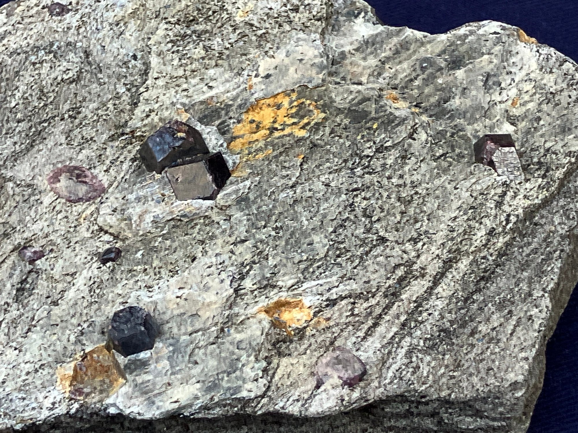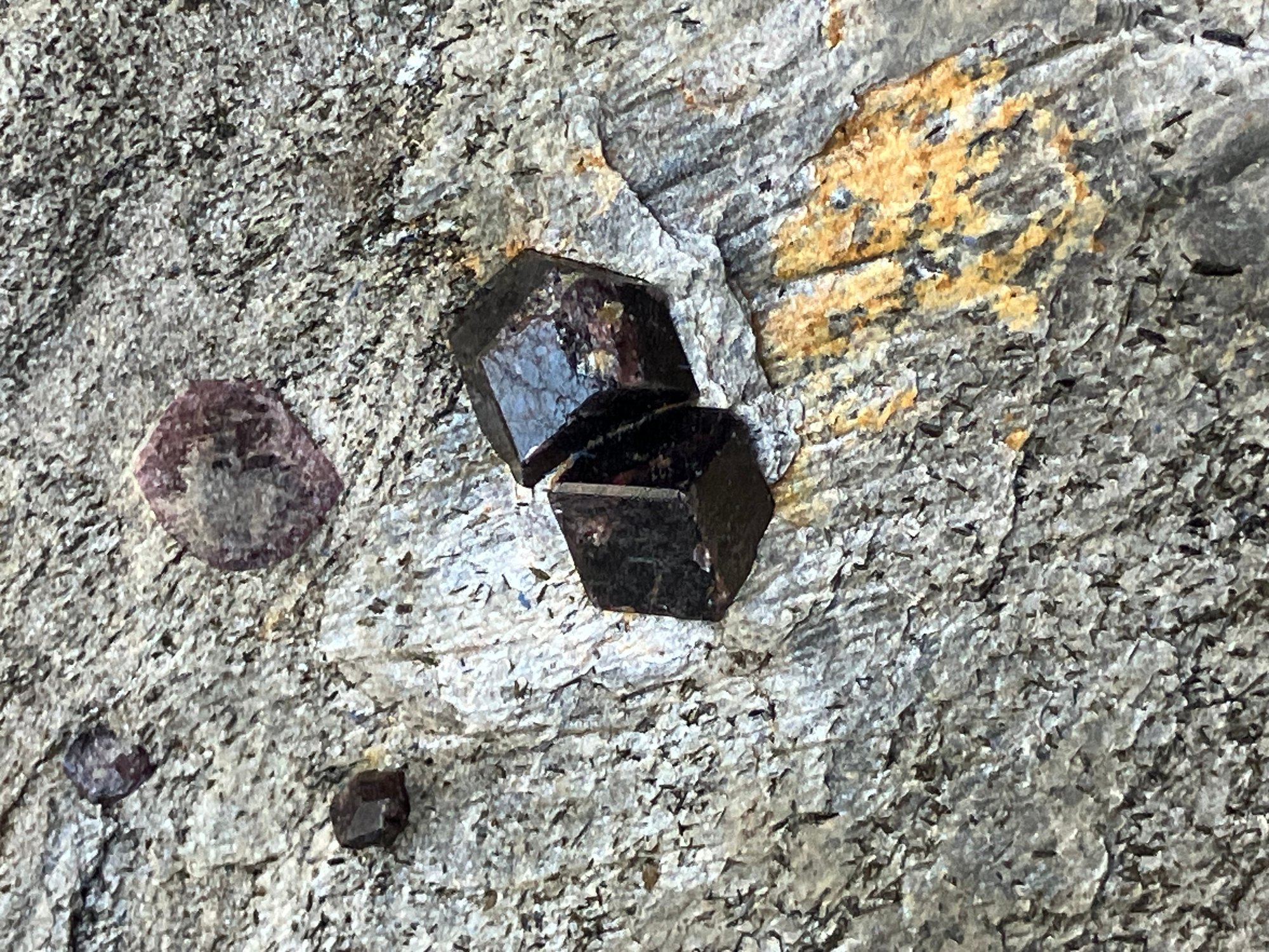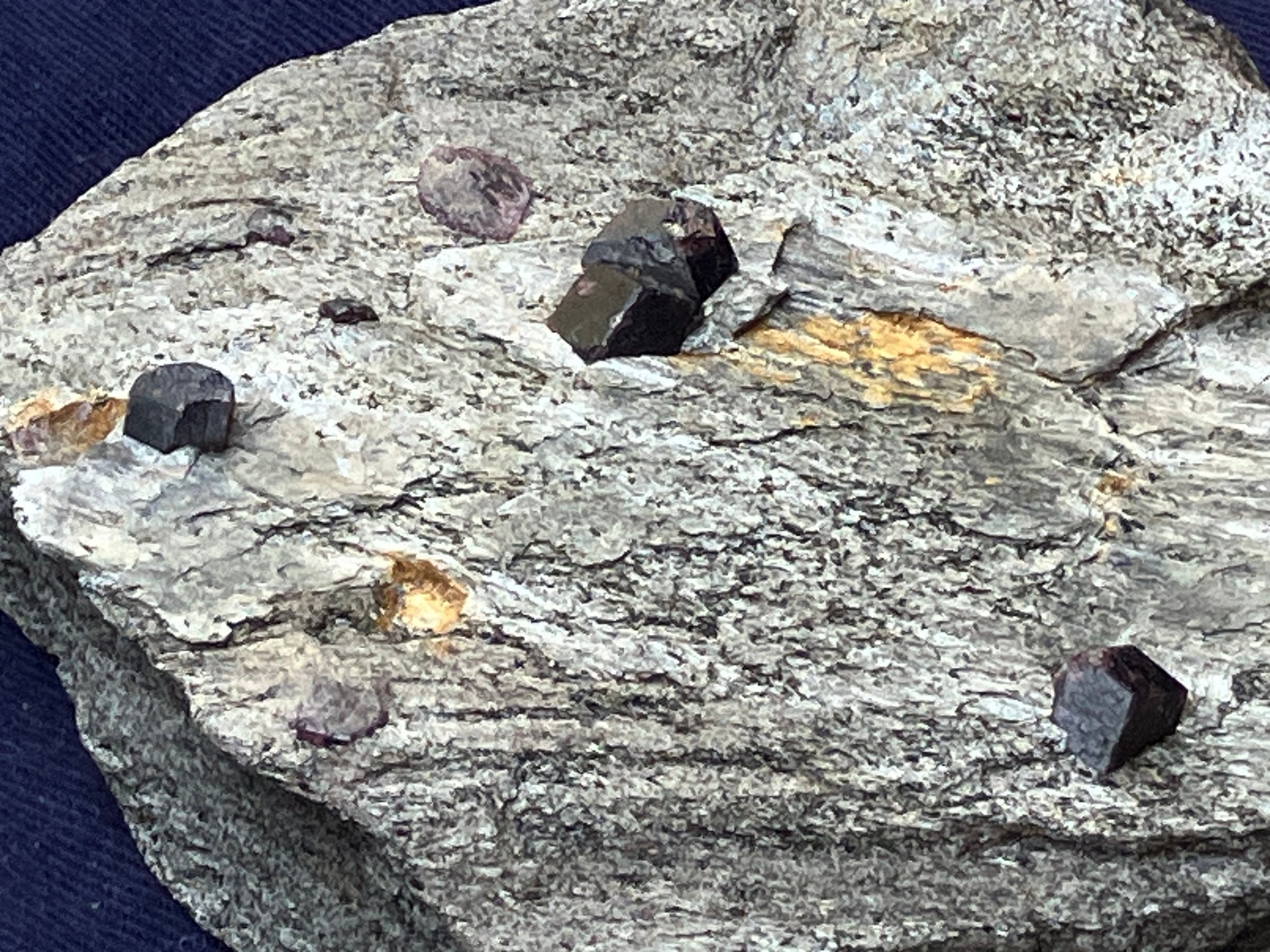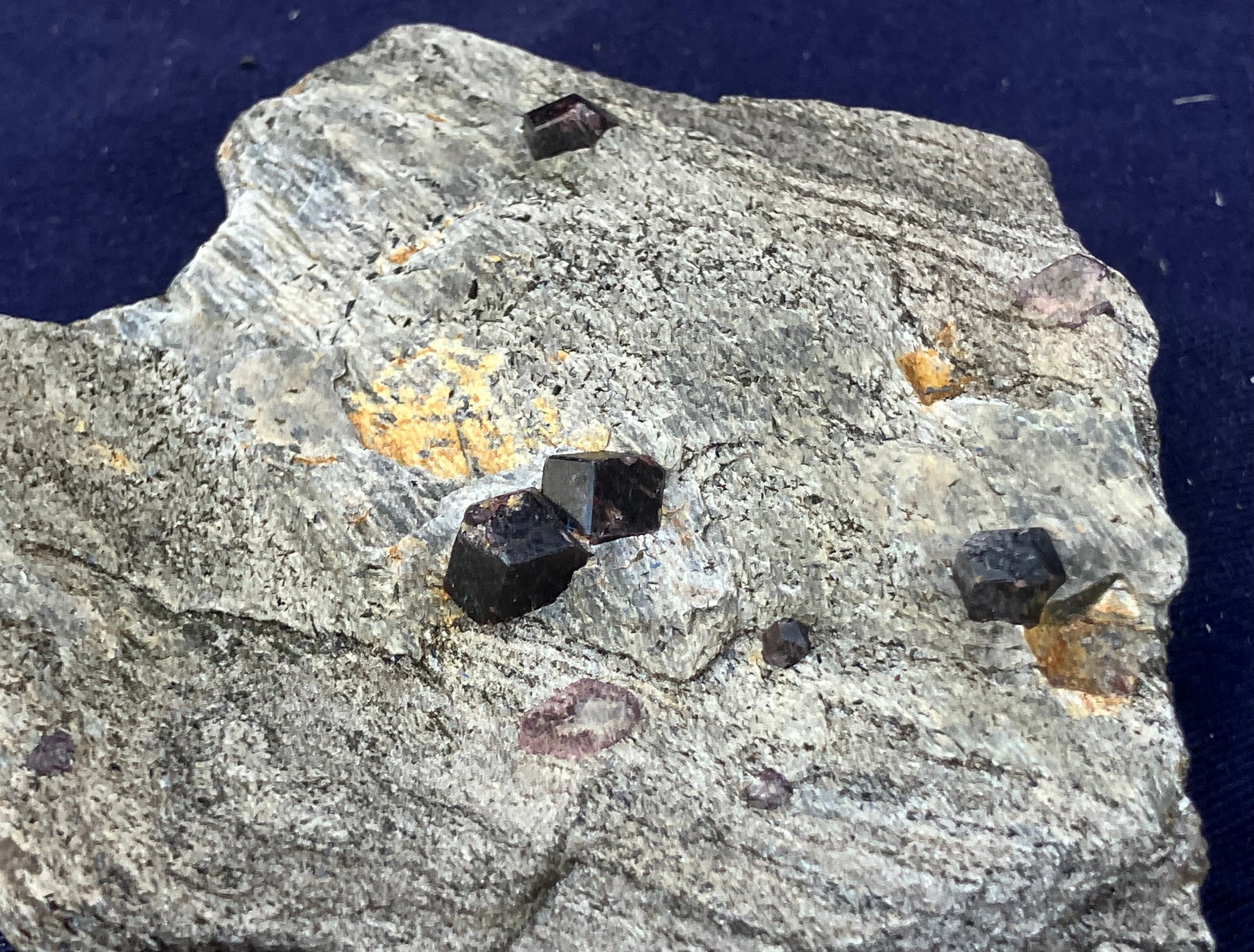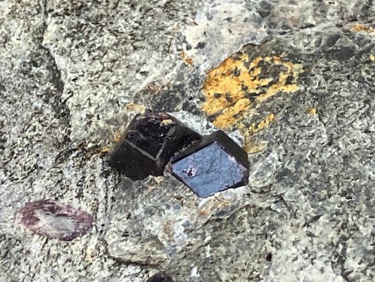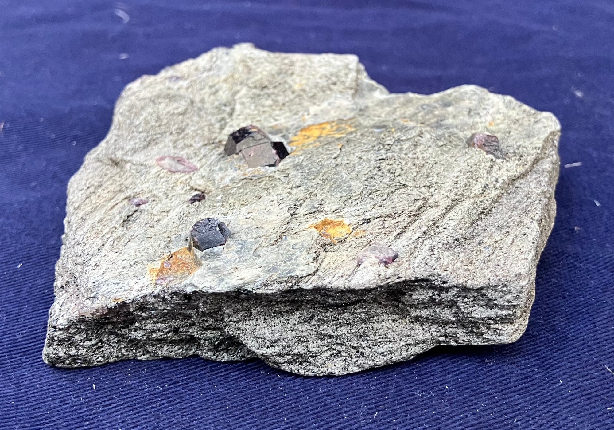 Almandine garnets in graphitic gneiss. From Green’s Farm Roxbury, CT. Measures: 3/4” tall x 3 1/2” wide x 3 1/2” long. Weighs: 6.9 ounces.