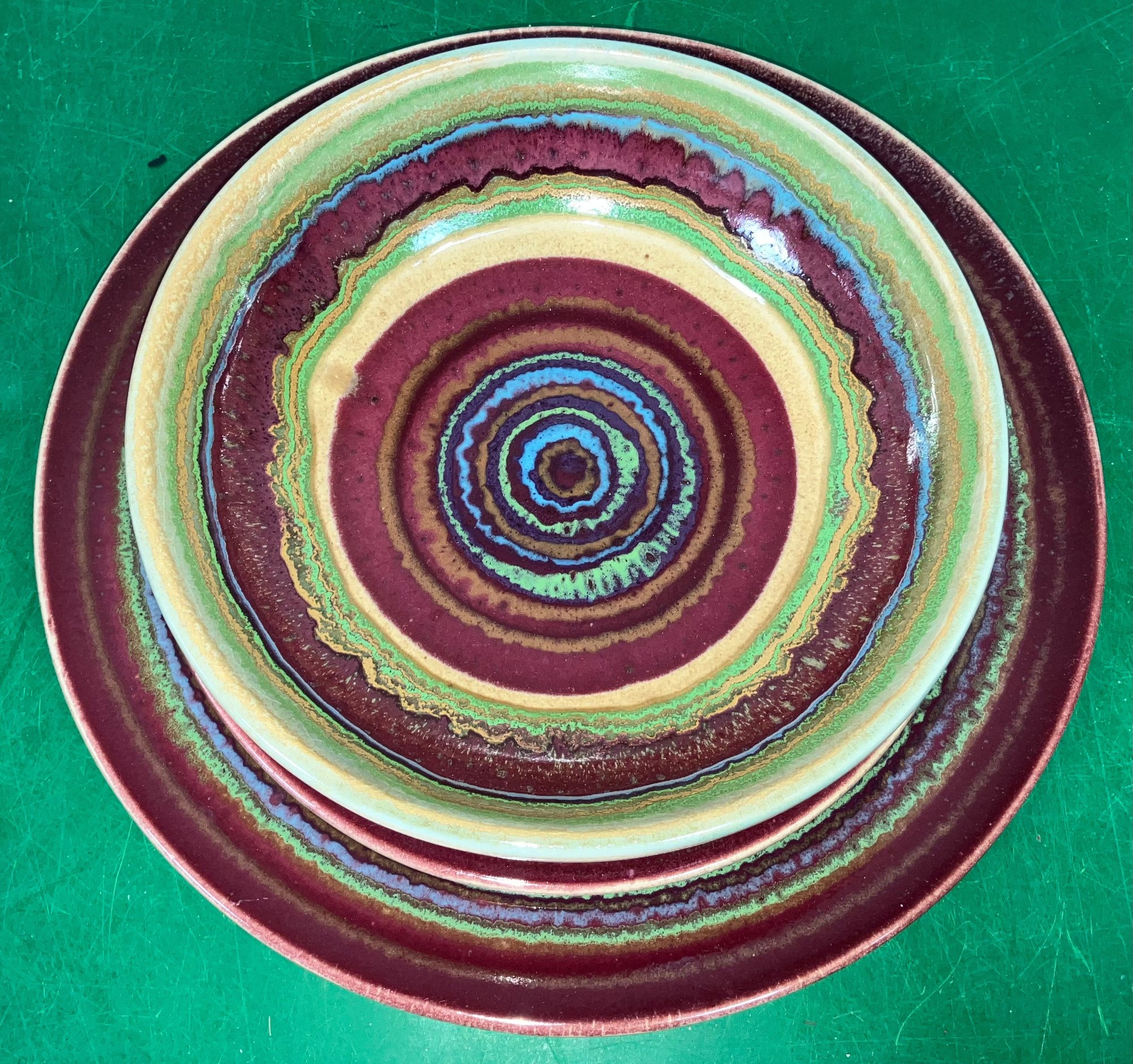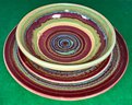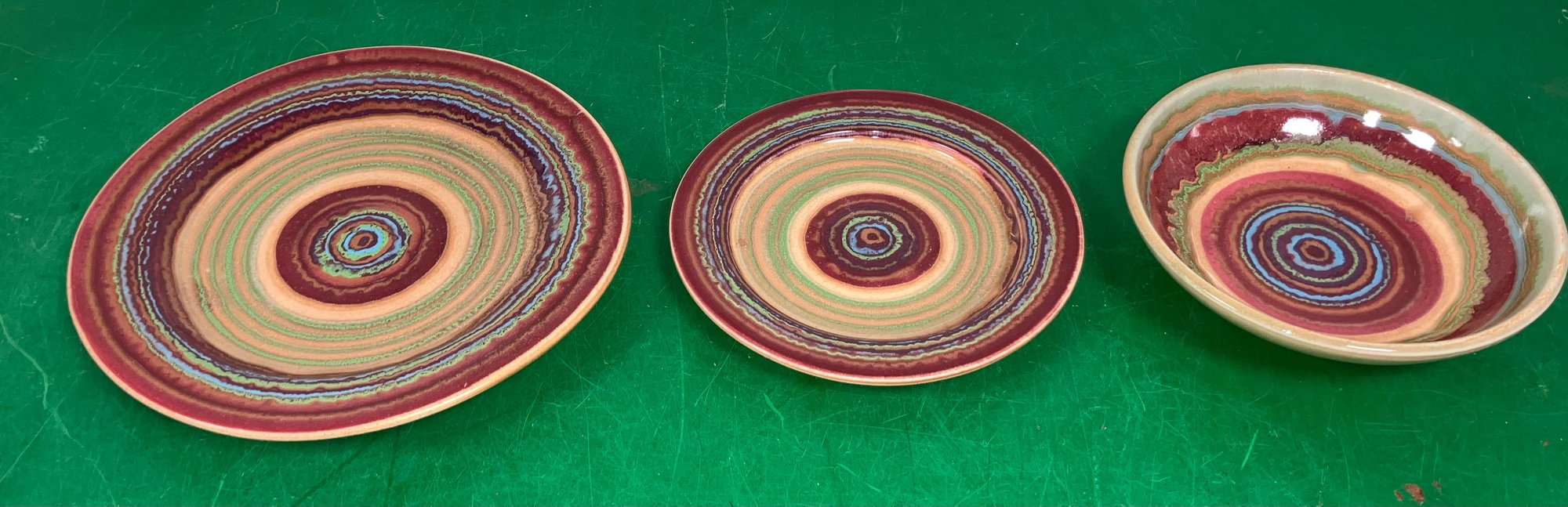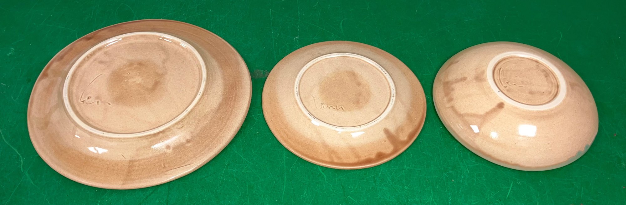 Disregard the white glare from the overhead lights. D. Lasser Ceramics 3 Piece Dinner Set (3). Very good condition. Set consists of a dinner plate, salad plate and a bowl. The entire Lasser collection is up for auction being sold separately, consisting of a total of 10 dinner sets, a pie plate, a large vase, a pitcher and a large platter. One of the 10 dinner sets does not include a bowl.