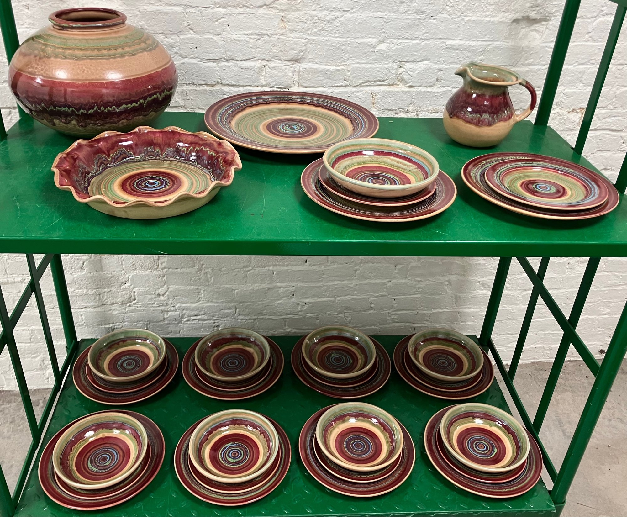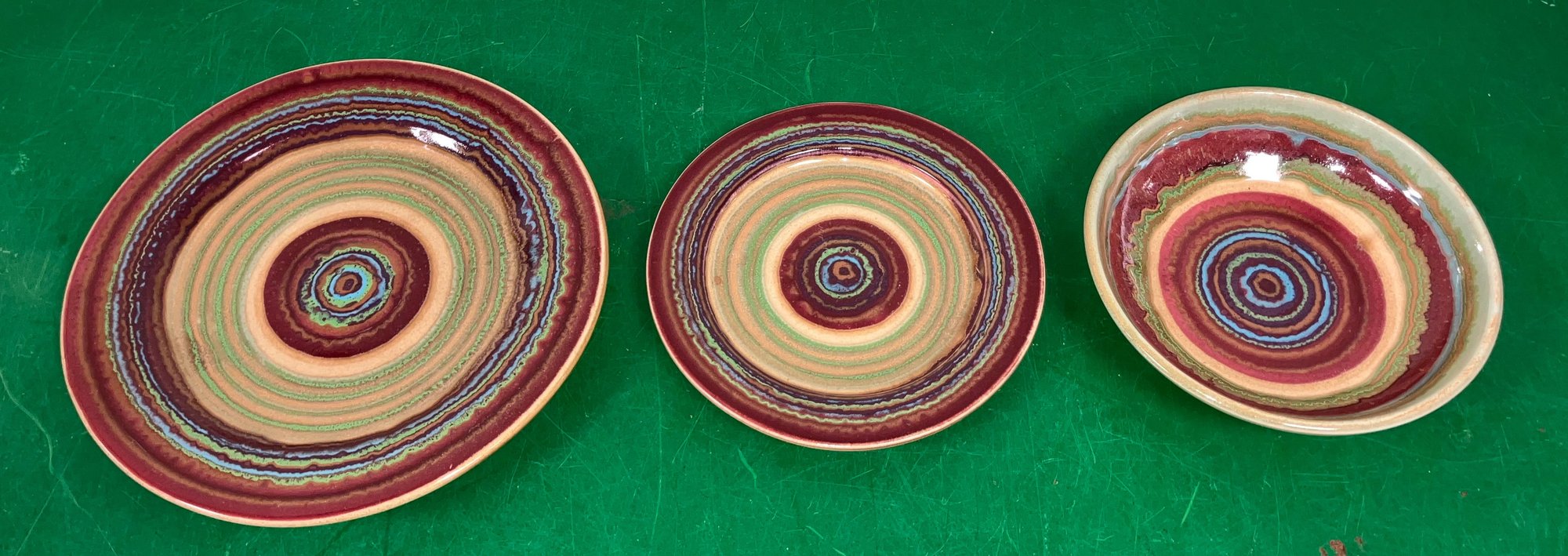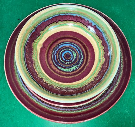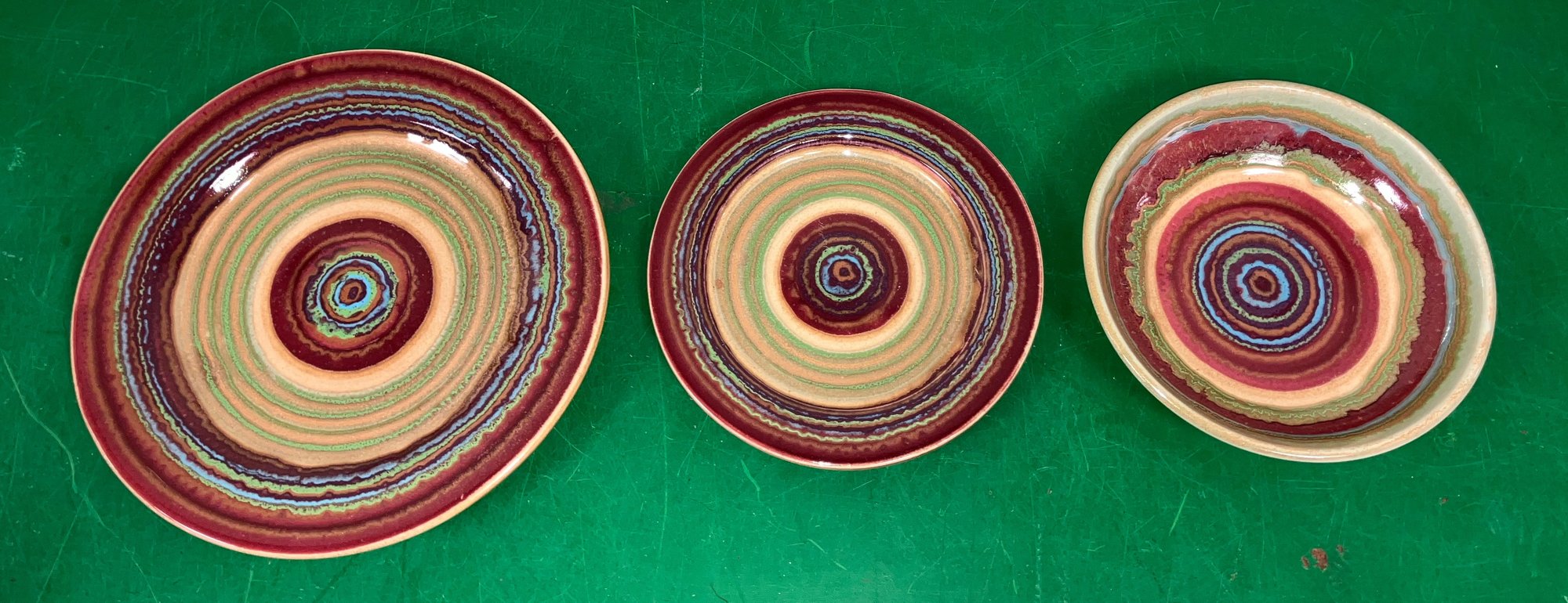 Disregard the white glare from the overhead lights. D. Lasser Ceramics 3 Piece Dinner Set (3). Very good condition. Set consists of a dinner plate, salad plate and a bowl. The entire Lasser collection is up for auction being sold separately, consisting of a total of 10 dinner sets, a pie plate, a large vase, a pitcher and a large platter. One of the 10 dinner sets does not include a bowl.