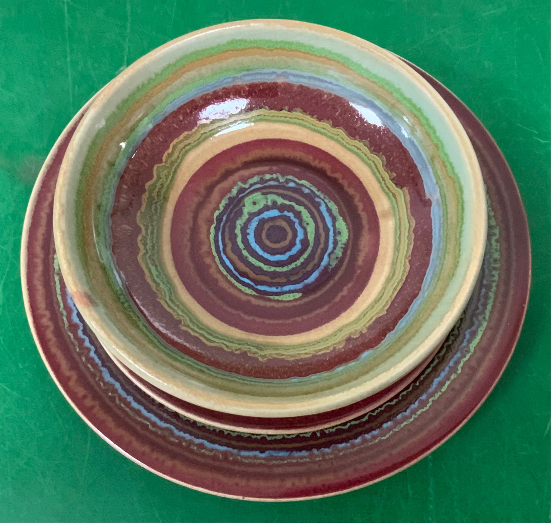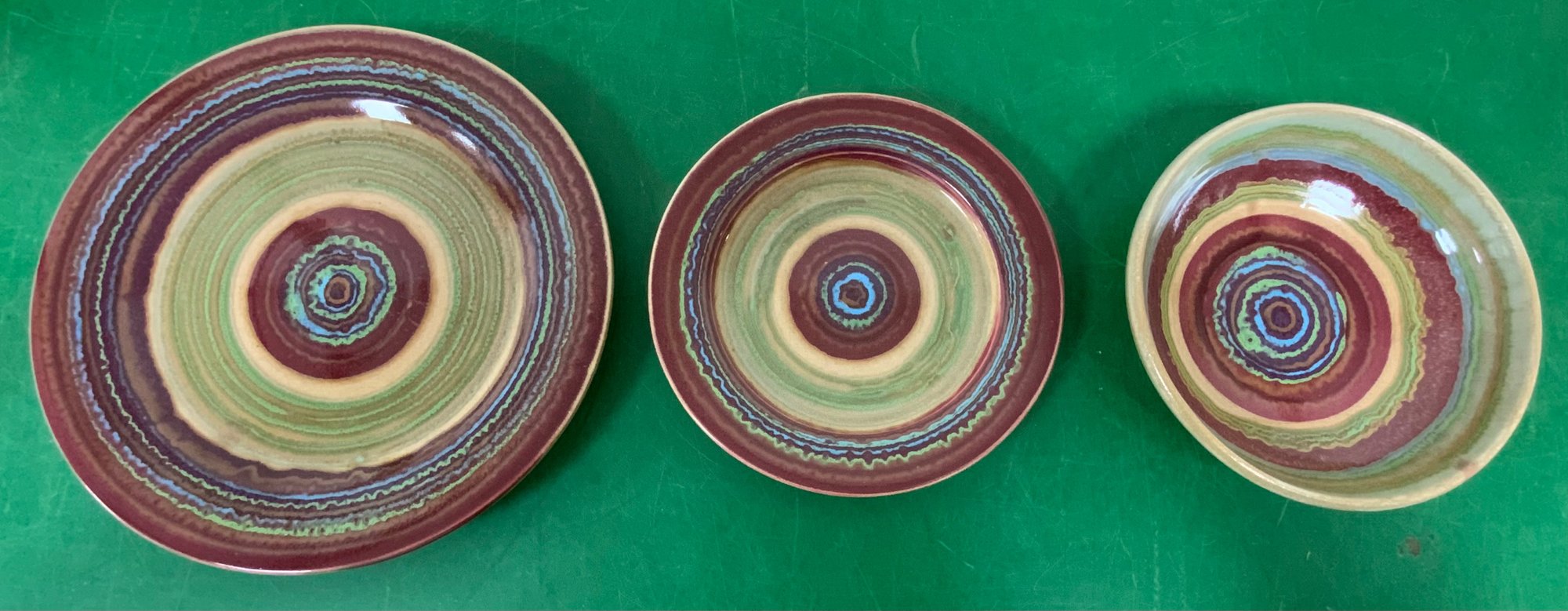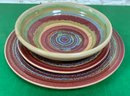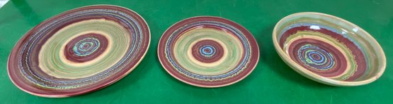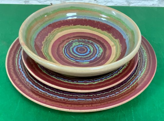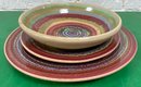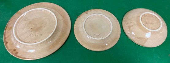 Disregard the white glare from the overhead lights. D. Lasser Ceramics 3 Piece Dinner Set (6). Very good condition. Set consists of a dinner plate, salad plate and a bowl. The entire Lasser collection is up for auction being sold separately, consisting of a total of 10 dinner sets, a pie plate, a large vase, a pitcher and a large platter. One of the 10 dinner sets does not include a bowl.